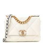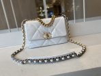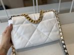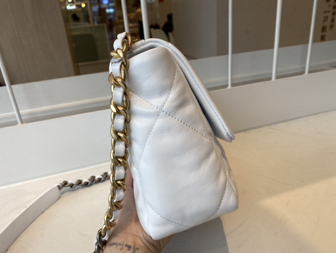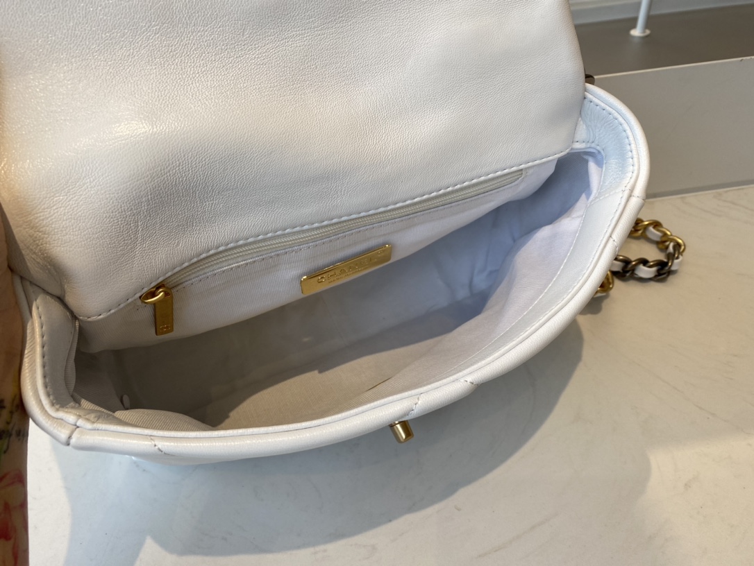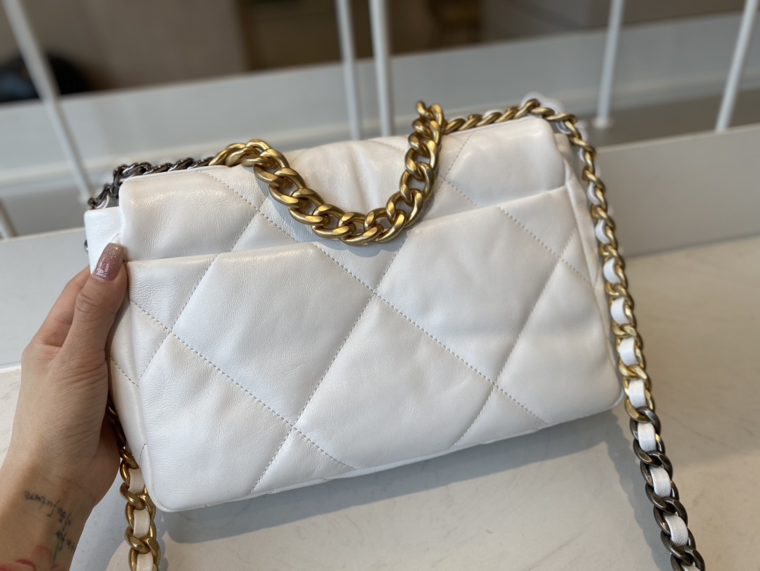 This is a replica CHANEL 19 Handbag Shiny Lambskin, Gold-Tone, Silver-Tone & Ruthenium-Finish Metal in White. This 19 bag is crafted of oversized quilted goatskin leather in white, featuring ruthenium-finish hardware.  A magnetic snap pocket at the rear. ,Size: Classic,