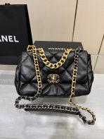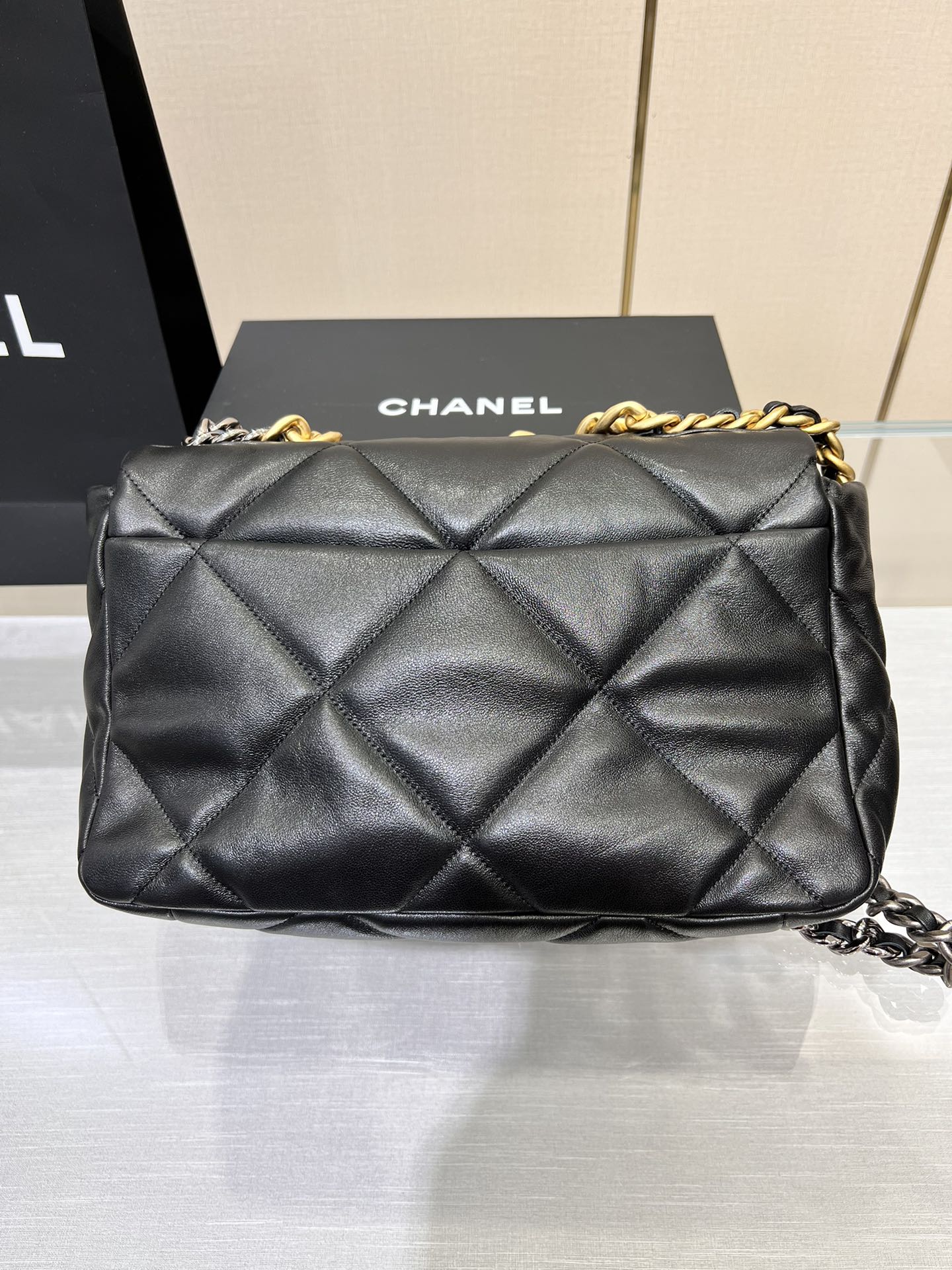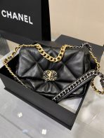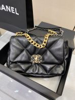 This is a replica CHANEL 19 Handbag Shiny Lambskin, Gold-Tone, Silver-Tone & Ruthenium-Finish Metal in Black. This 19 bag is crafted of oversized quilted goatskin leather in white, featuring ruthenium-finish hardware.  A magnetic snap pocket at the rear. ,Size: Classic,