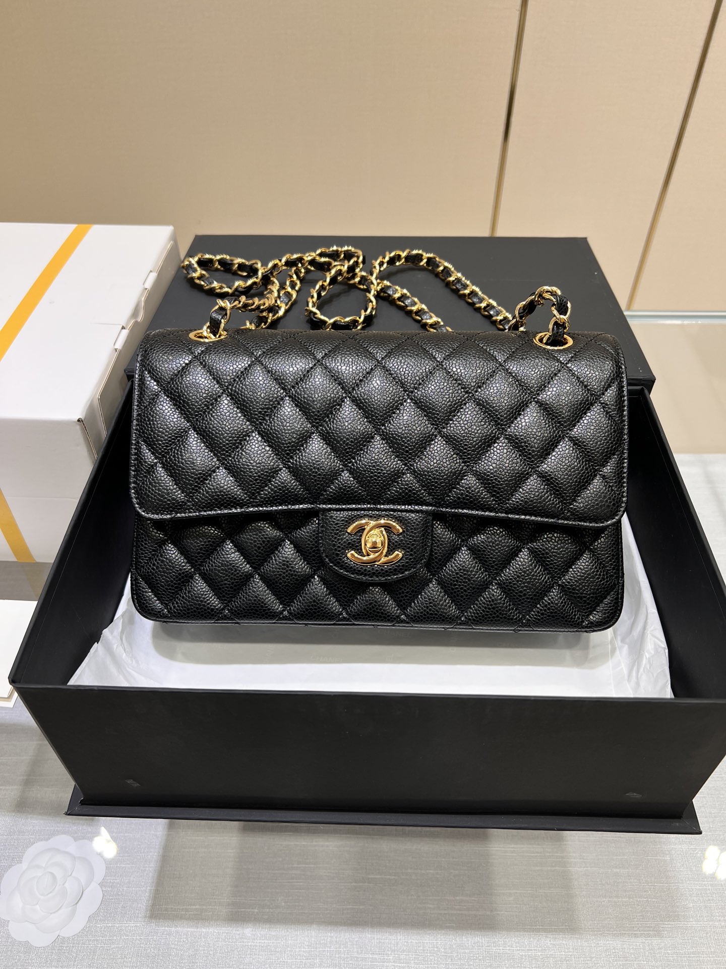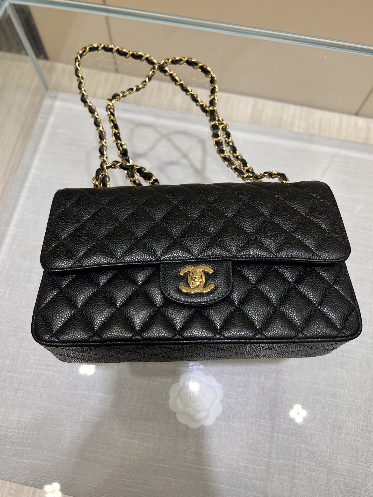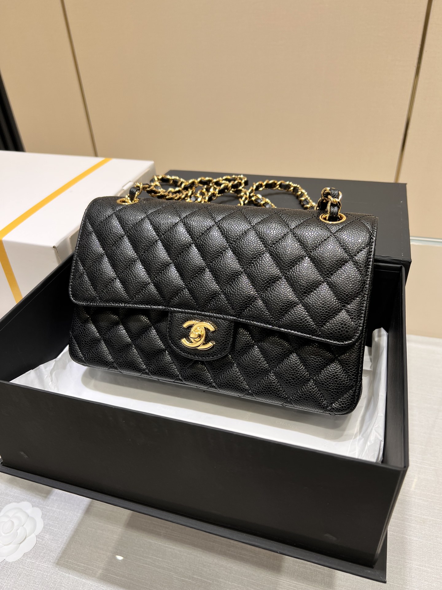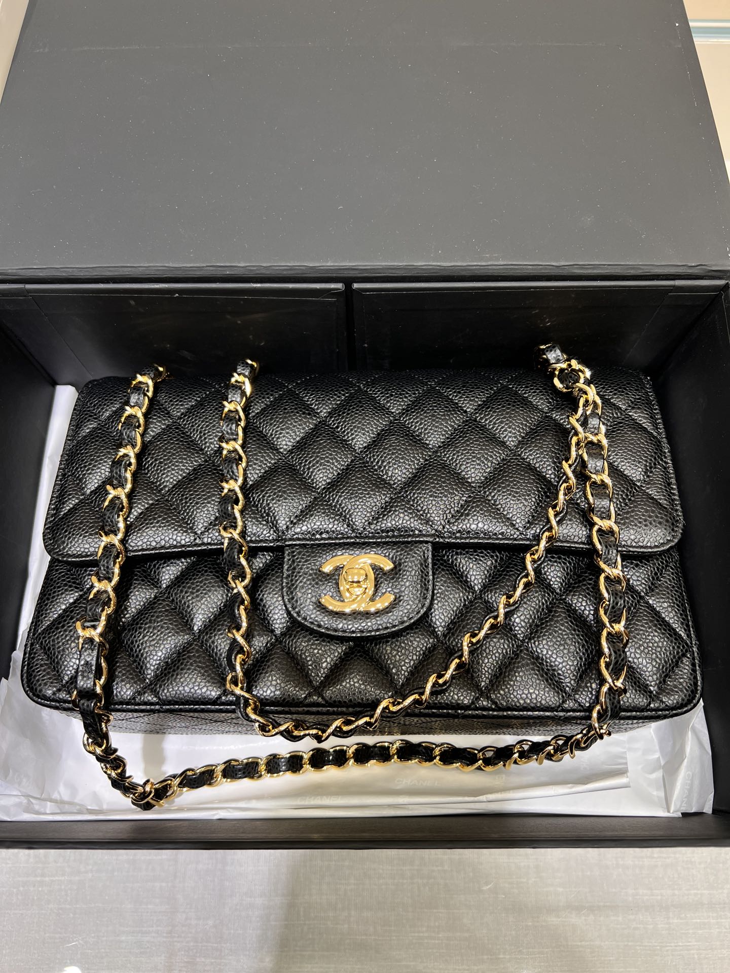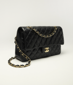This is a replica CHANEL Classic 11.12 Flap Bag Lambskin & Gold-Tone Metal Black. This classic double flap bag comes in black grained calfskin featuring gold-tone hardware. Open pocket on the back. Closes with classic CC-turn-lock on the front. Zipper pocket inside the flap. Outside pocket on the front under the flap. Lined in burgundy leather with two open and a lipstick pocket against the back. CC stitching on the inside flap. ,Size,