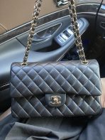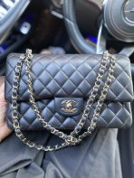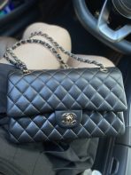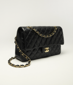 This is a replica CHANEL Classic 11.12 Flap Bag Lambskin & Gold-Tone Metal in Black. This classic double flap bag comes in smooth black lambskin featuring gold-tone hardware. Open pocket on the back. Closes with classic CC-turn-lock on the front. Zipper pocket inside the flap. Outside pocket on the front under the flap. A lipstick pocket against the back. CC stitching on the inside flap. ,Size,