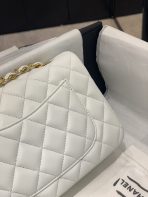 This is a replica CHANEL Mini Classic 11.12 Flap Bag Lambskin & Gold-Tone Metal in White. This mini classic flap bag comes in smooth white lambskin featuring gold-tone hardware. Open pocket on the back. Closes with classic CC-turn-lock on the front. Zipper pocket inside the flap. Outside pocket on the front under the flap. Lined in burgundy leather with two open and a lipstick pocket against the back. CC stitching on the inside flap.  Size