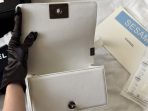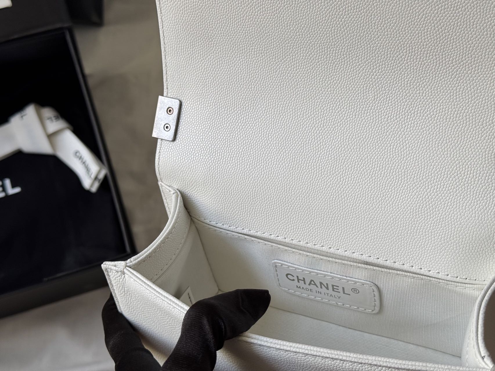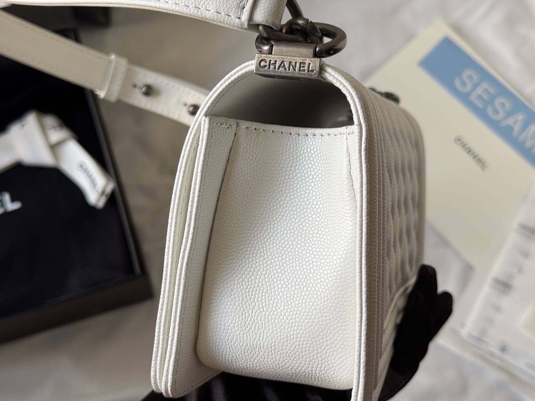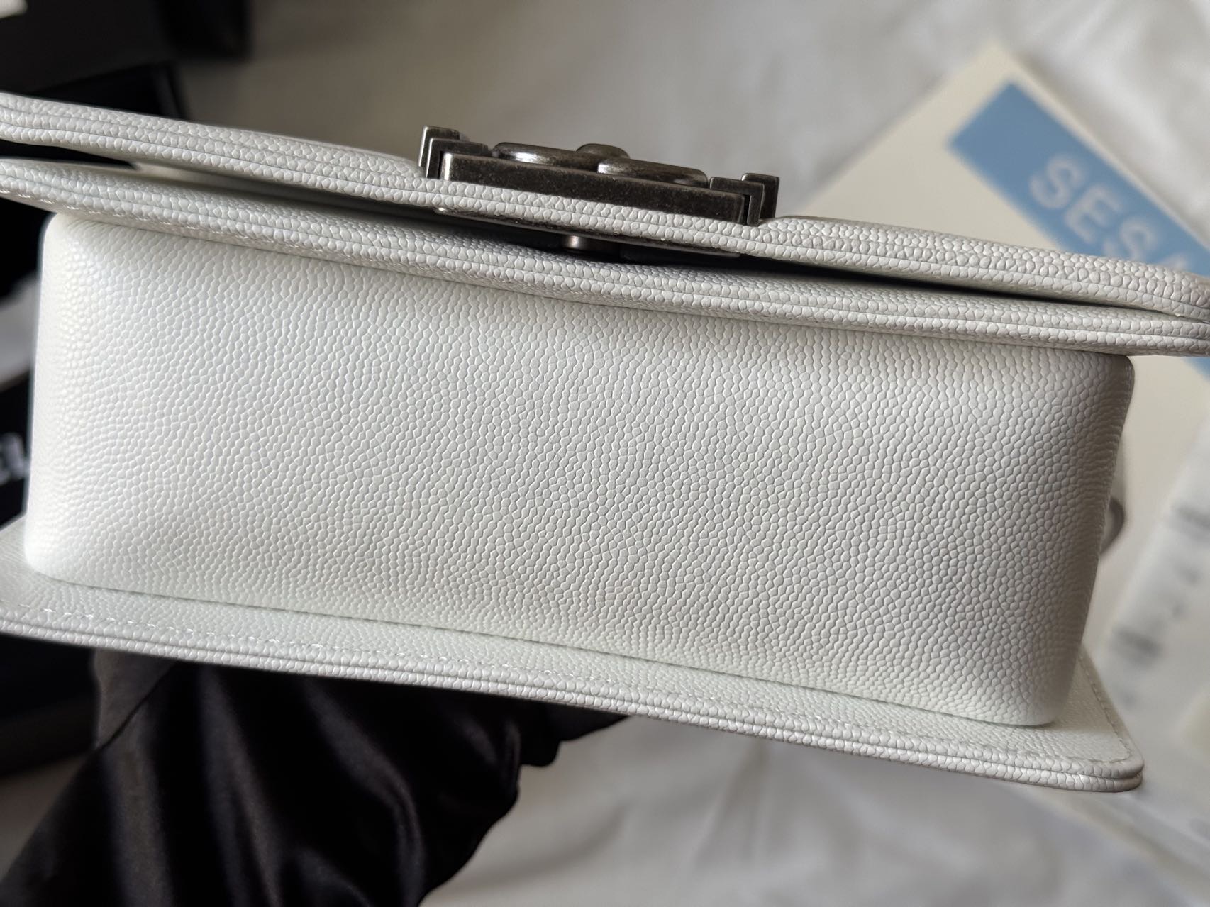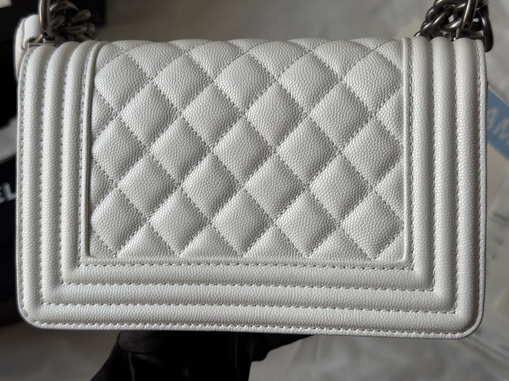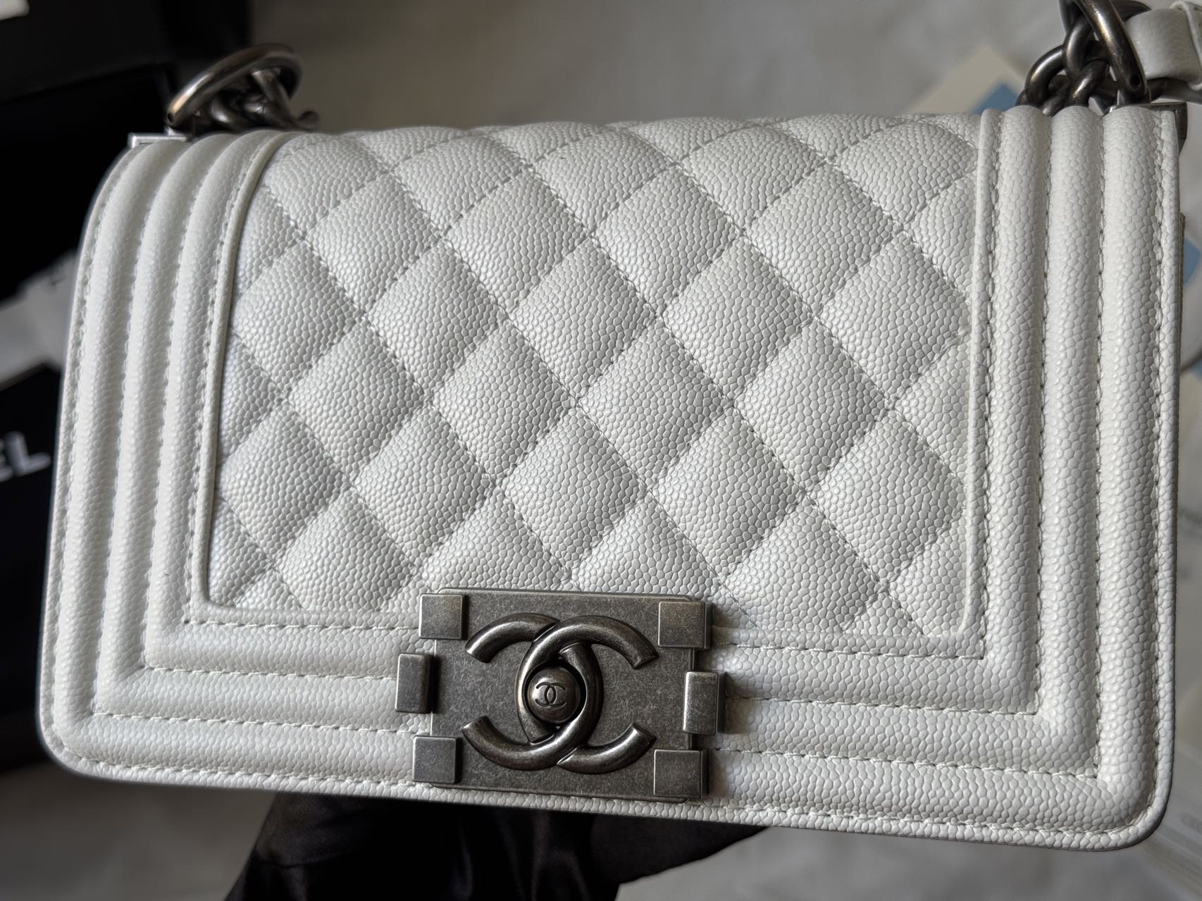 This is a replica CHANEL Small Boy Flap Calfskin & oG Metal in White. This small boy flap bag comes in caviar black caviar calfskin featuring gold-tone hardware. Grosgrain Lining & Single Interior Pocket. ,Size: Small,