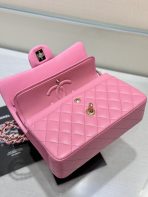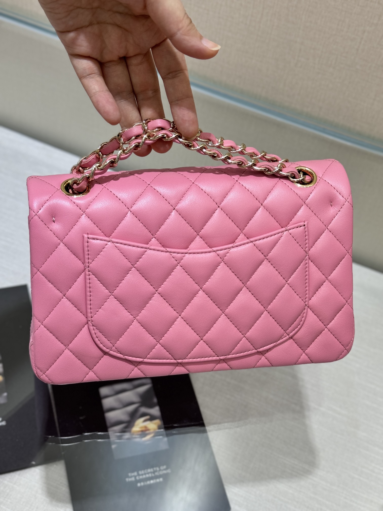 This is a replica CHANEL Small Classic Handbag Lambskin & Gold-Tone Metal in Pink. This small double flap bag comes in smooth pink lambskin featuring gold-tone hardware. Open pocket on the back. Closes with classic CC-turn-lock on the front. Zipper pocket inside the flap. Outside pocket on the front under the flap. CC stitching on the inside flap. ,