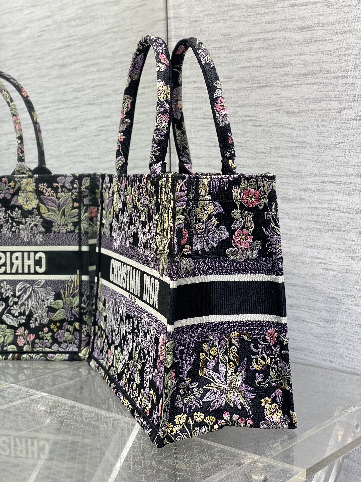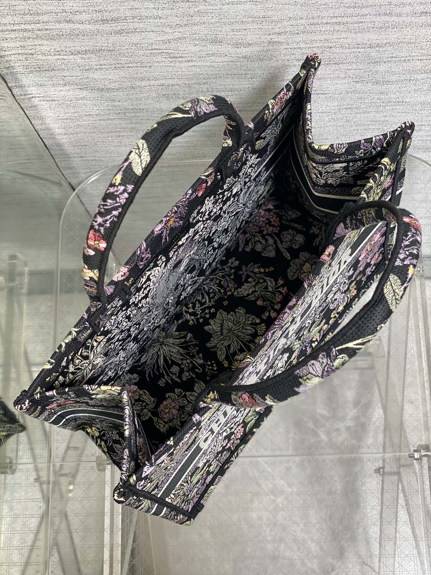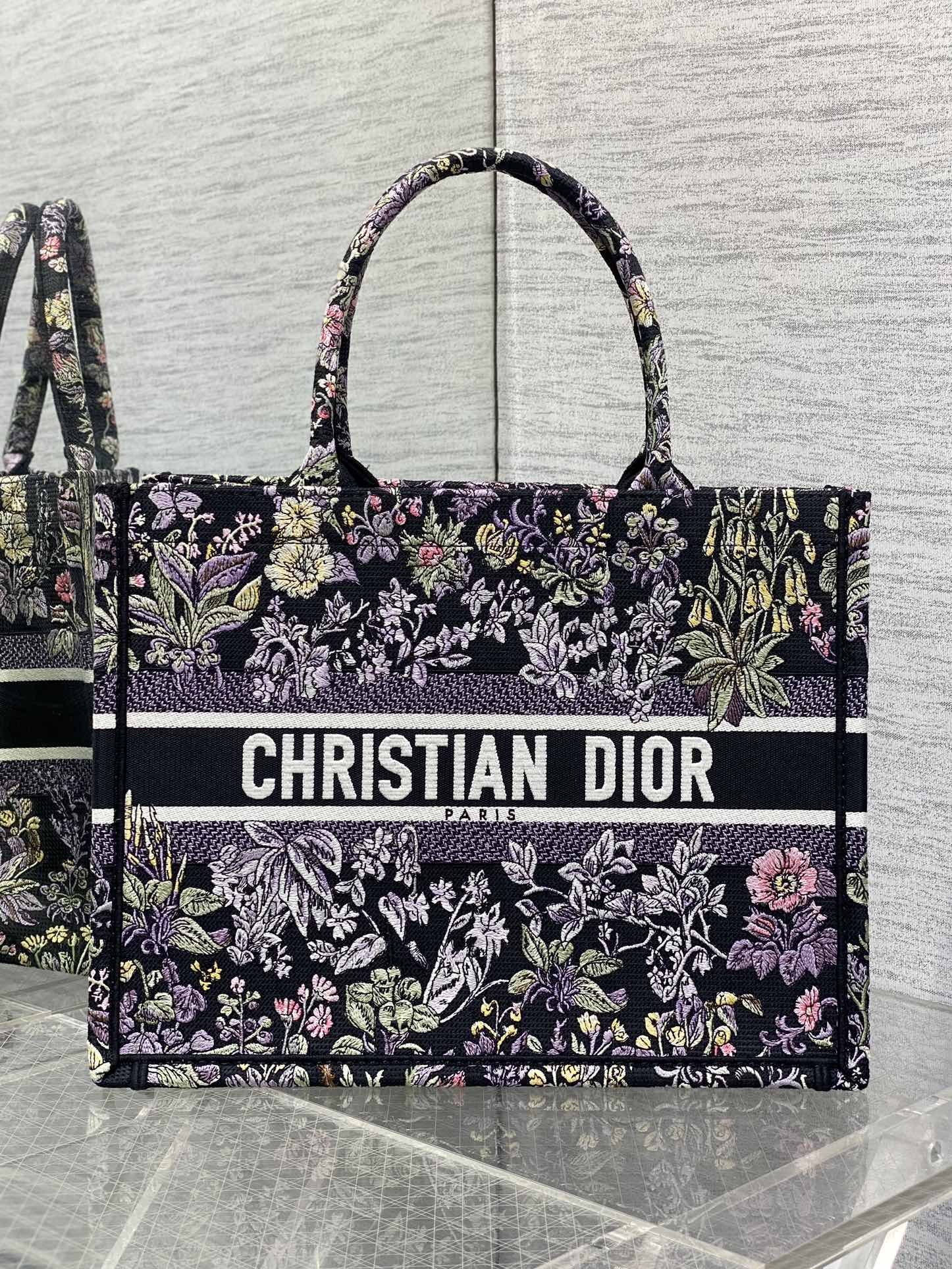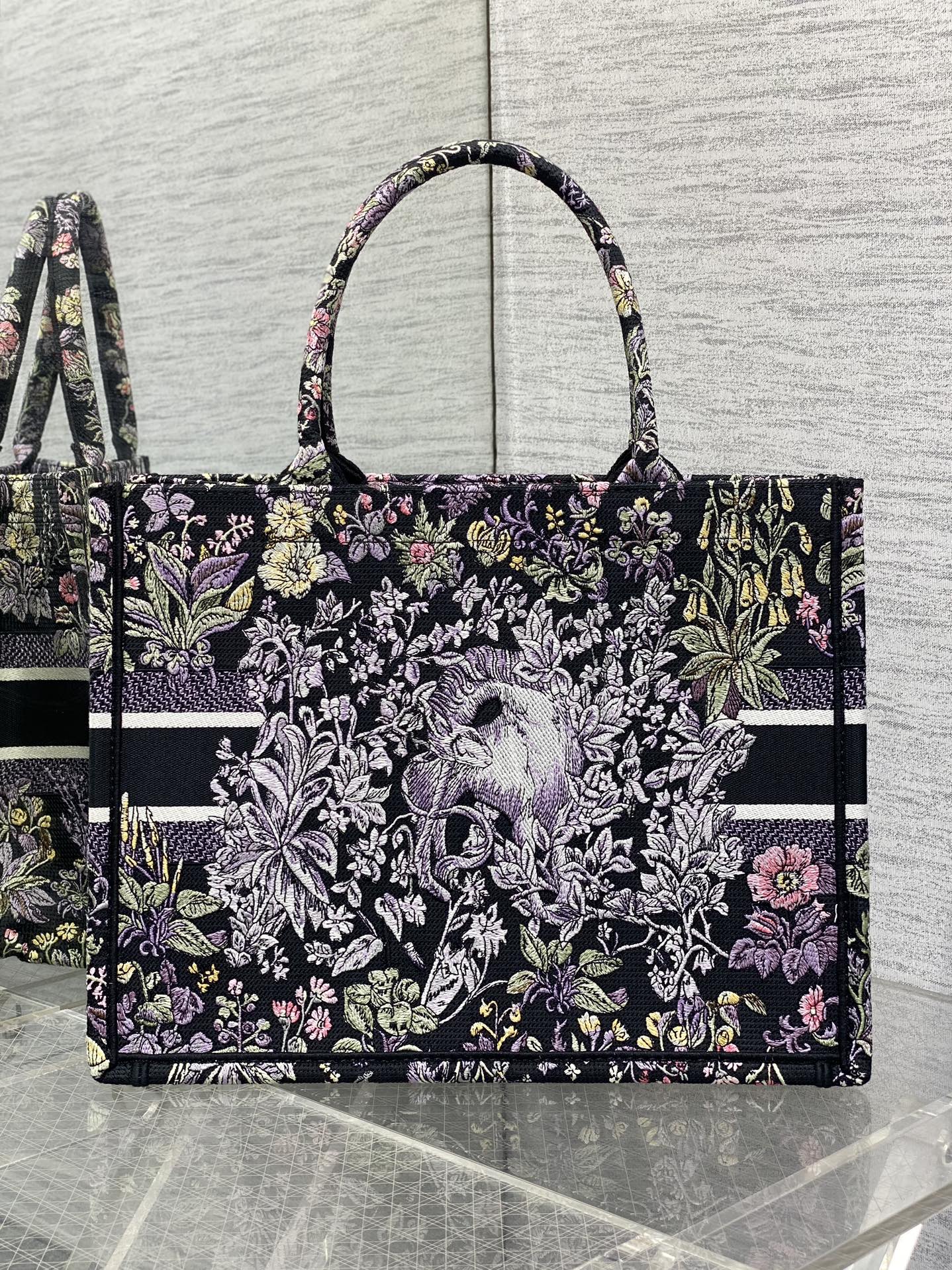 This is a replica CHRISTIAN DIOR Medium Dior Book Tote in Black Embroidery with Multicolor Millefiori Unicorn Motif. Main composition of t, cotton. ,