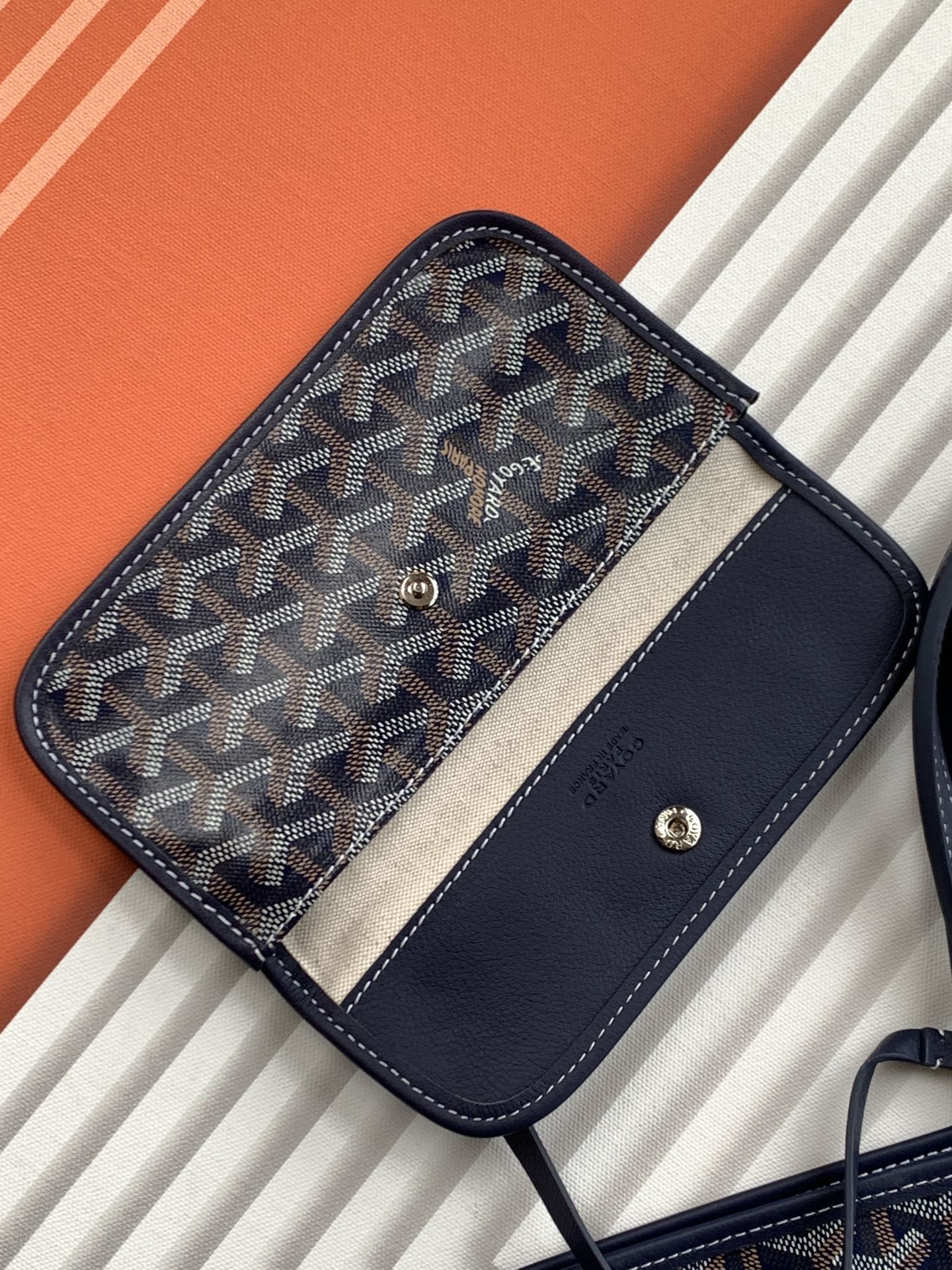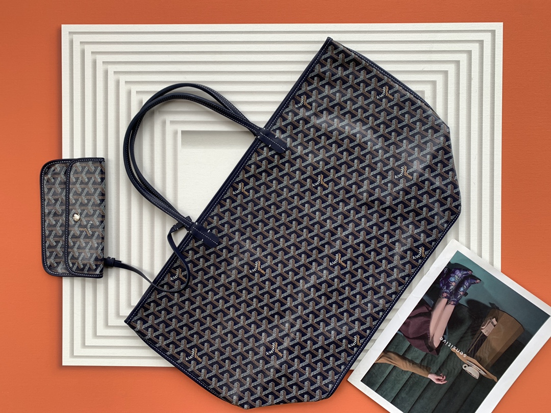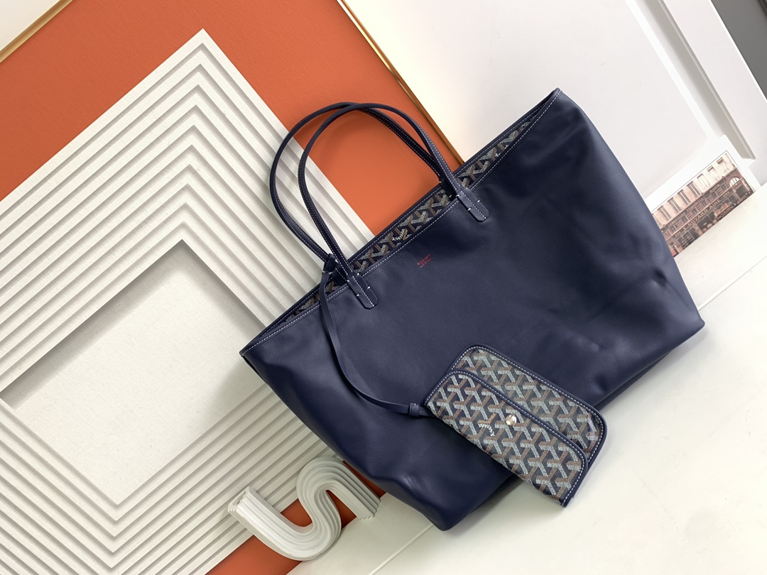 This is a replica GOYARD Anjou GM Bag in navy blue. The Anjou GM bag is a leather variant lined with goyardine that pays homage to the iconic Saint Louis bag. The ,Size ,