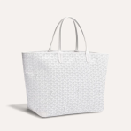 This is a replica GOYARD Artois GM Bag in white. The Artois GM bag uses the aesthetic lines and codes of our Artois PM and MM bags in a travel format, ideal for a weekend or as carry-on luggage. The handles ensure comfort when worn over the shoulder. The zip closure has two lockable zips to secure the contents.,