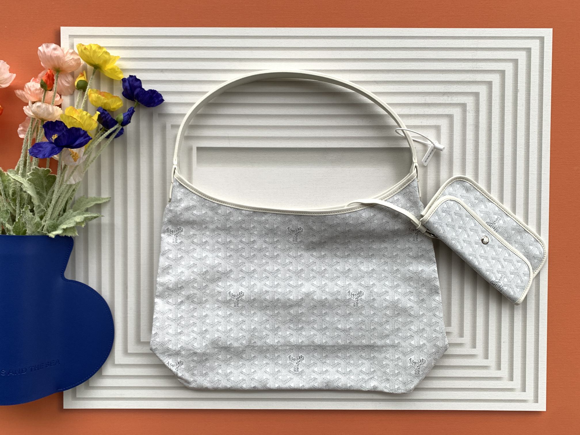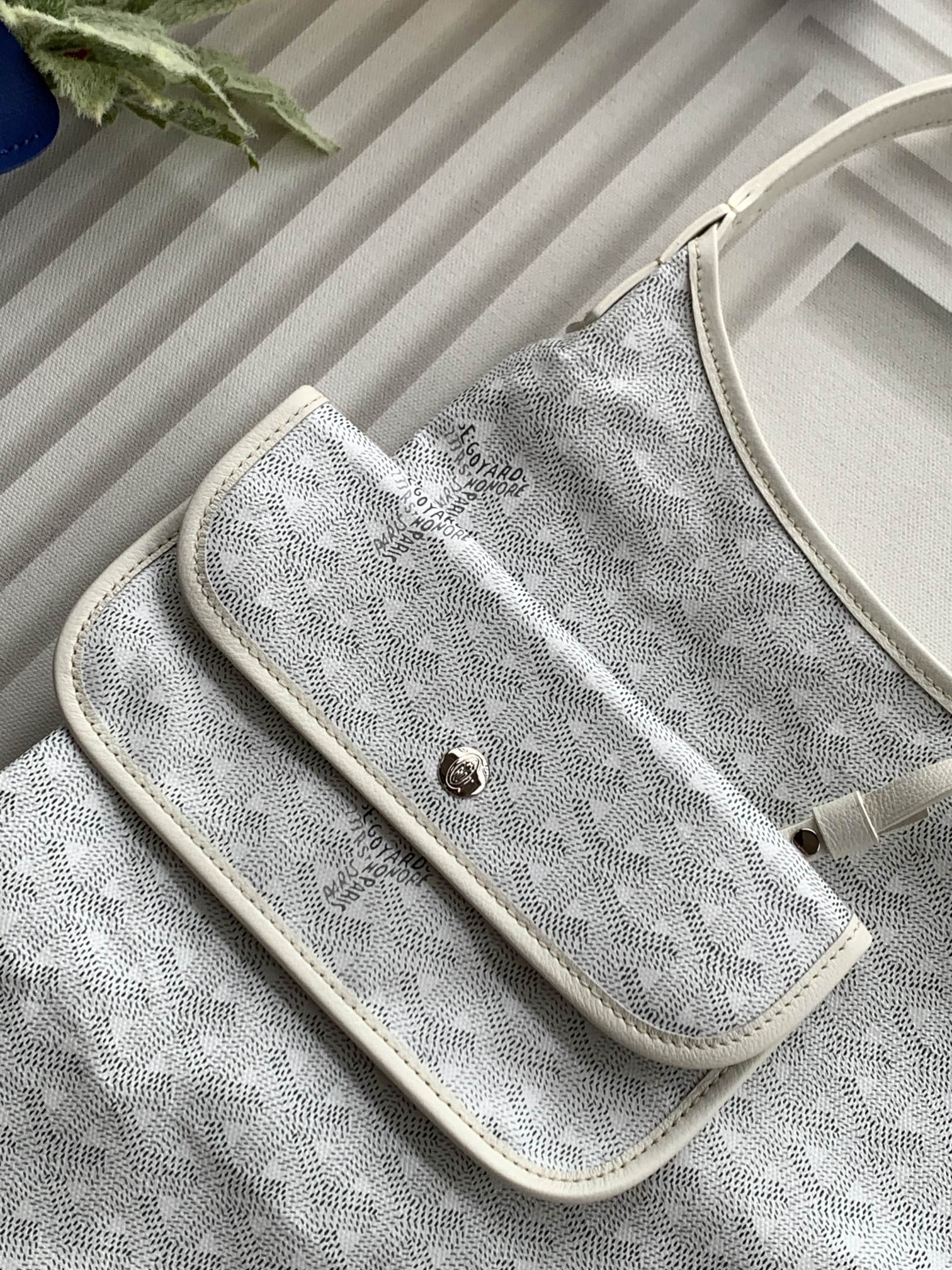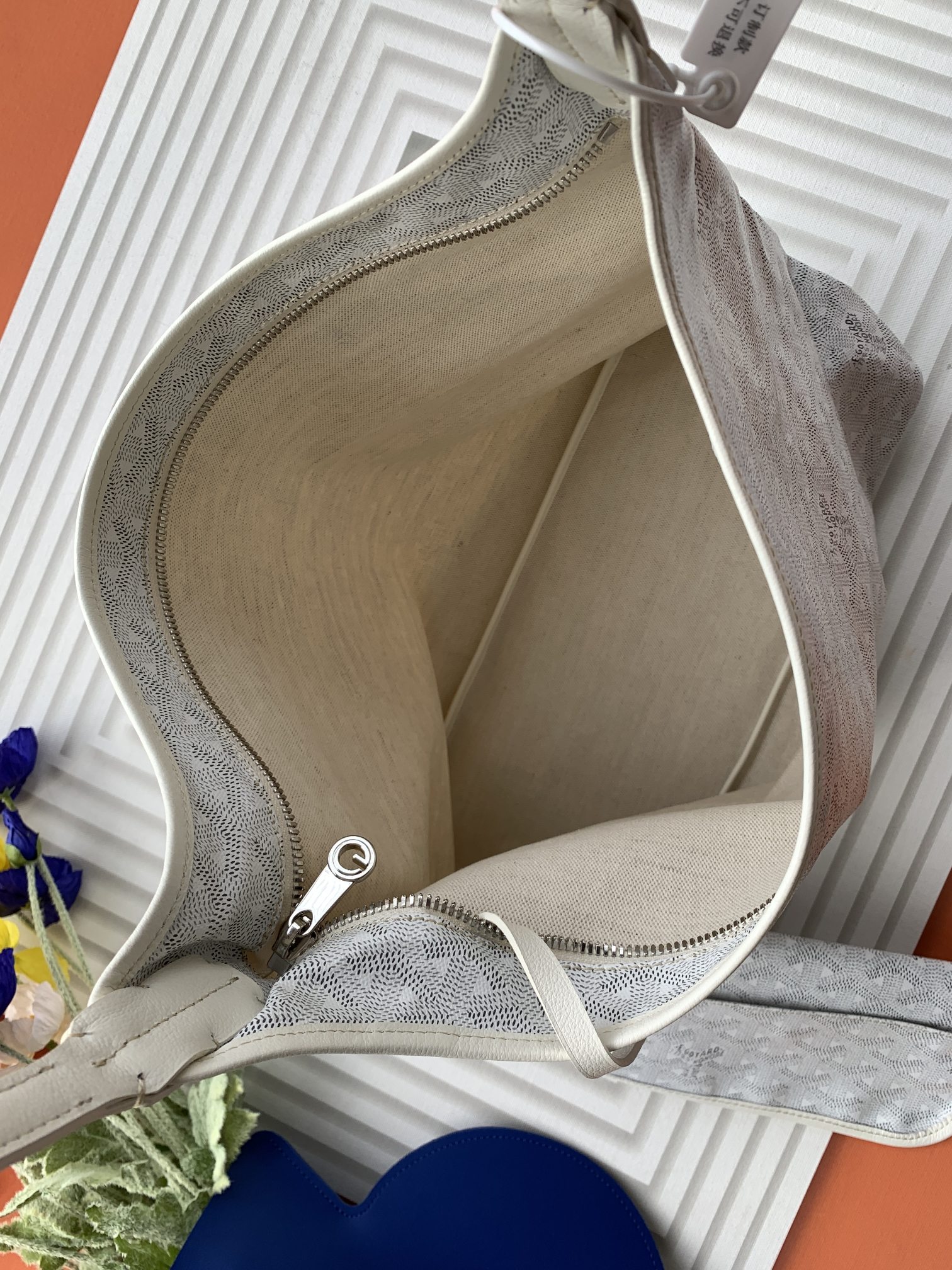 This is a replica GOYARD Bohème Hobo Bag in white. The Bohème Hobo bag epitomizes lightness, flexibility, and safety thanks to its zip closure. It is very comfortable as a shoulder bag thanks to its wide handle. It also features the emblematic removable pouch that closes with a snap fastener.,