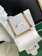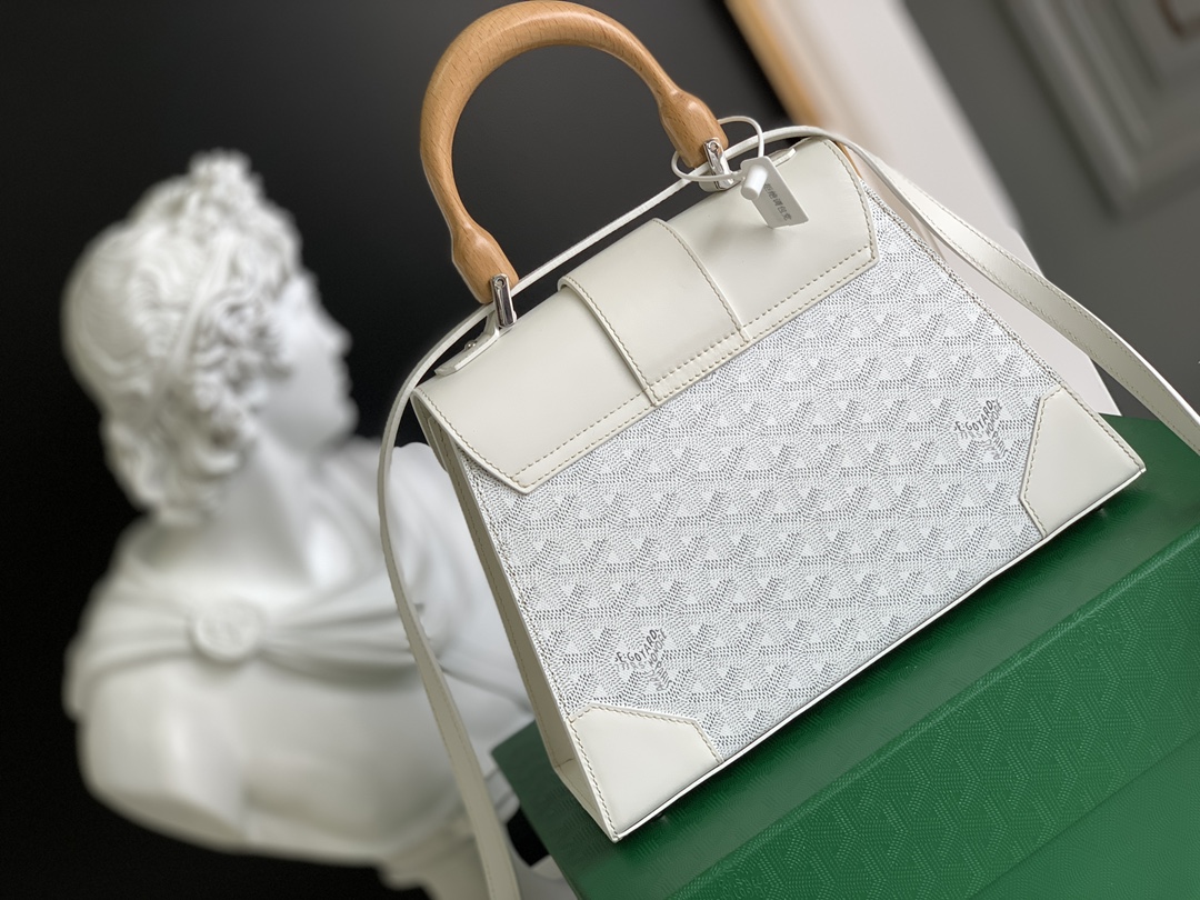 This is a replica GOYARD Saïgon PM Bag in white. The Saïgon bag is one of Maison Goyard’s emblematic pieces as it inherits all our trunk-making signature codes like the wood batons, leather corners and trunk rivets. In this structured PM format, the Saïgon bag can be worn with or without a strap for an elegant evening style.,