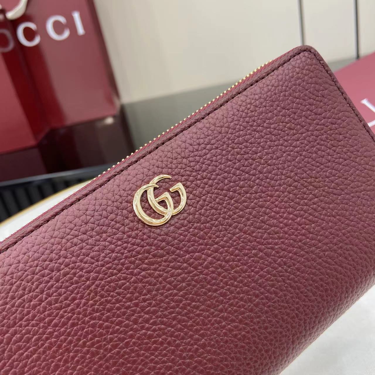 ,Black and Gucci Rosso Ancora red leather,Gold-toned hardware,Gucci Rosso Ancora red taffeta lining,Double G,12 card slots and three bill compartments,Zip coin pocket,Zip around closure,Weight: 0.50lbs approximately,7.5″W x 4.1″H x .8″D