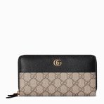 ,Black leather, beige and dark brown GG Supreme,Gold-toned hardware,Viscose lining,Double G,12 card slots and three bill compartments,Zip coin pocket,Zip around closure,Weight: 0.50lbs approximately,7.5″W x 4.1″H x .8″D