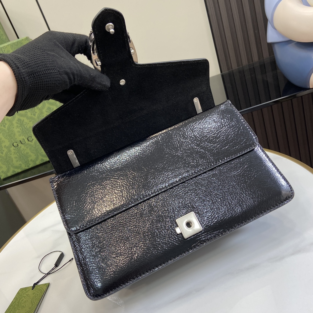 This is a replica GUCCI Dionysus small bag in black patent leather. Silver-toned hardware. ,