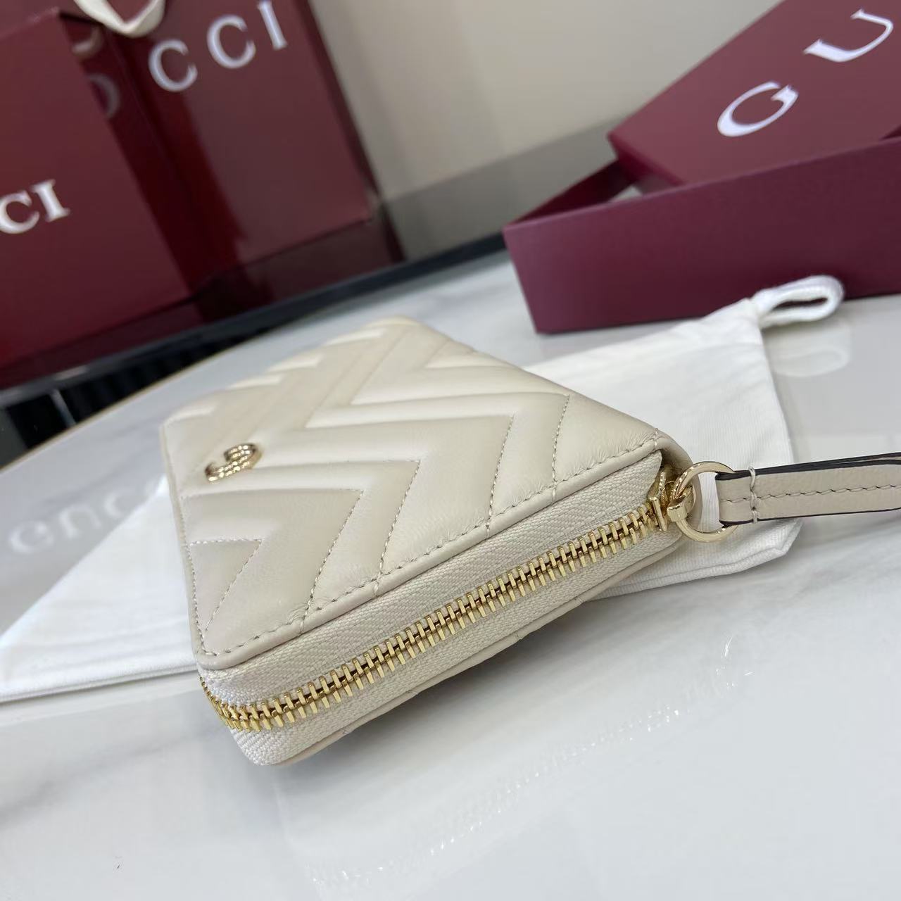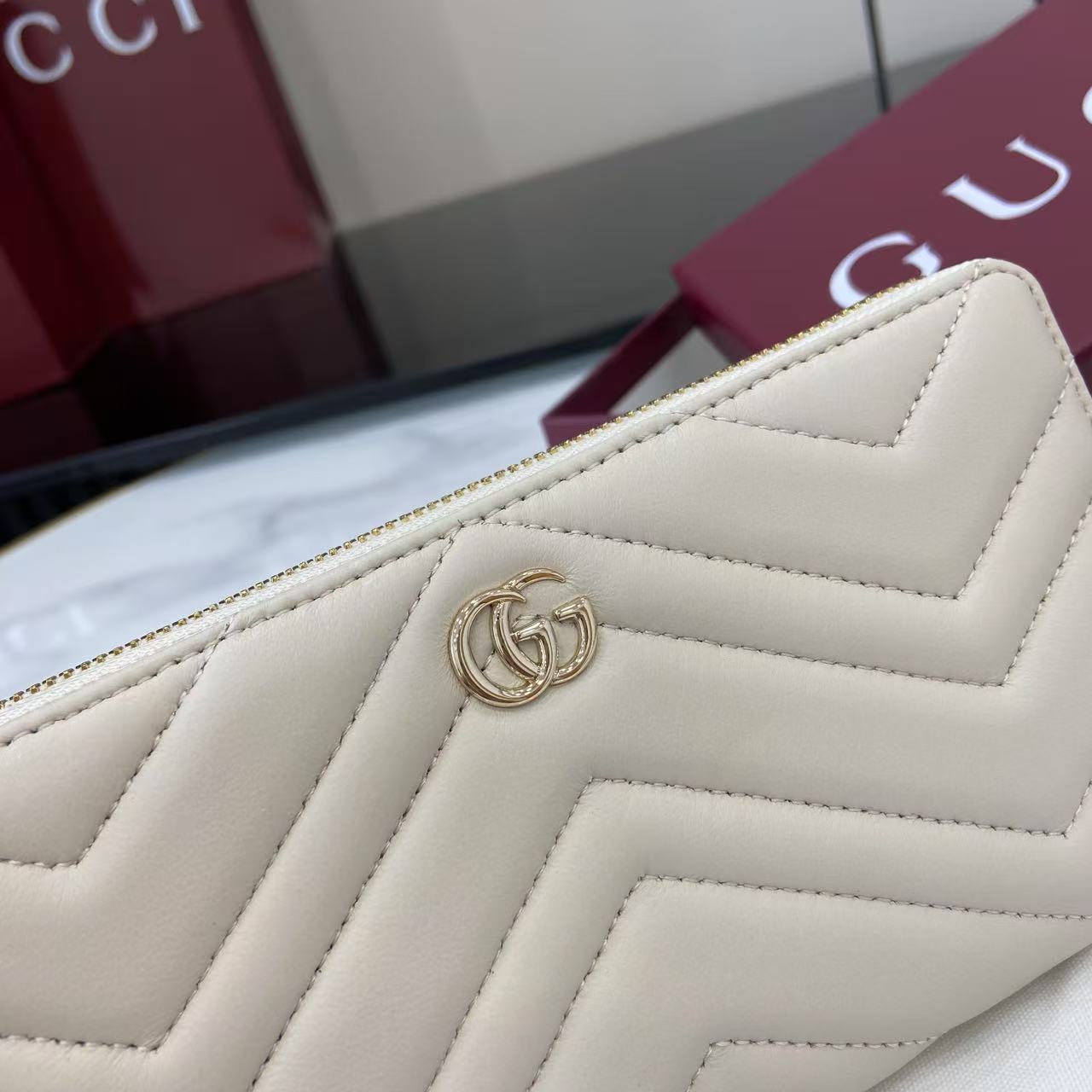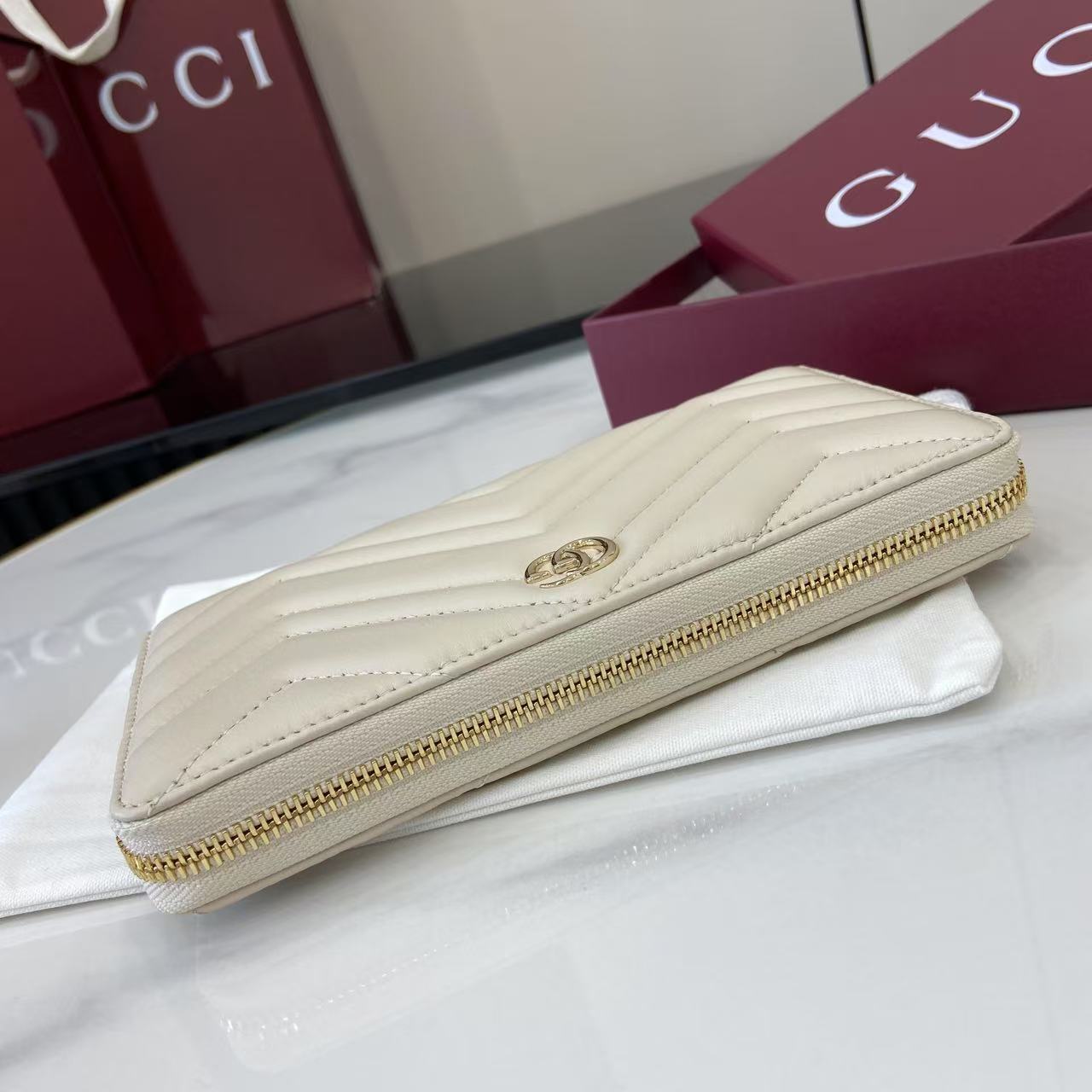 ,Cream matelassé chevron leather,Light gold-toned hardware,Brown taffeta lining,Double G,12 card slots and three bill compartments,Zip coin pocket,Zip around closure,Weight: 0.50lbs approximately,7.5″W x 4.1″H x .8″D