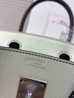 ###This Birkin is in Craie and black epsom leather with Palladium hardware and has tonal stitching, front flap, two straps with center toggle closure, clochette with lock and two keys, and double rolled handles.###