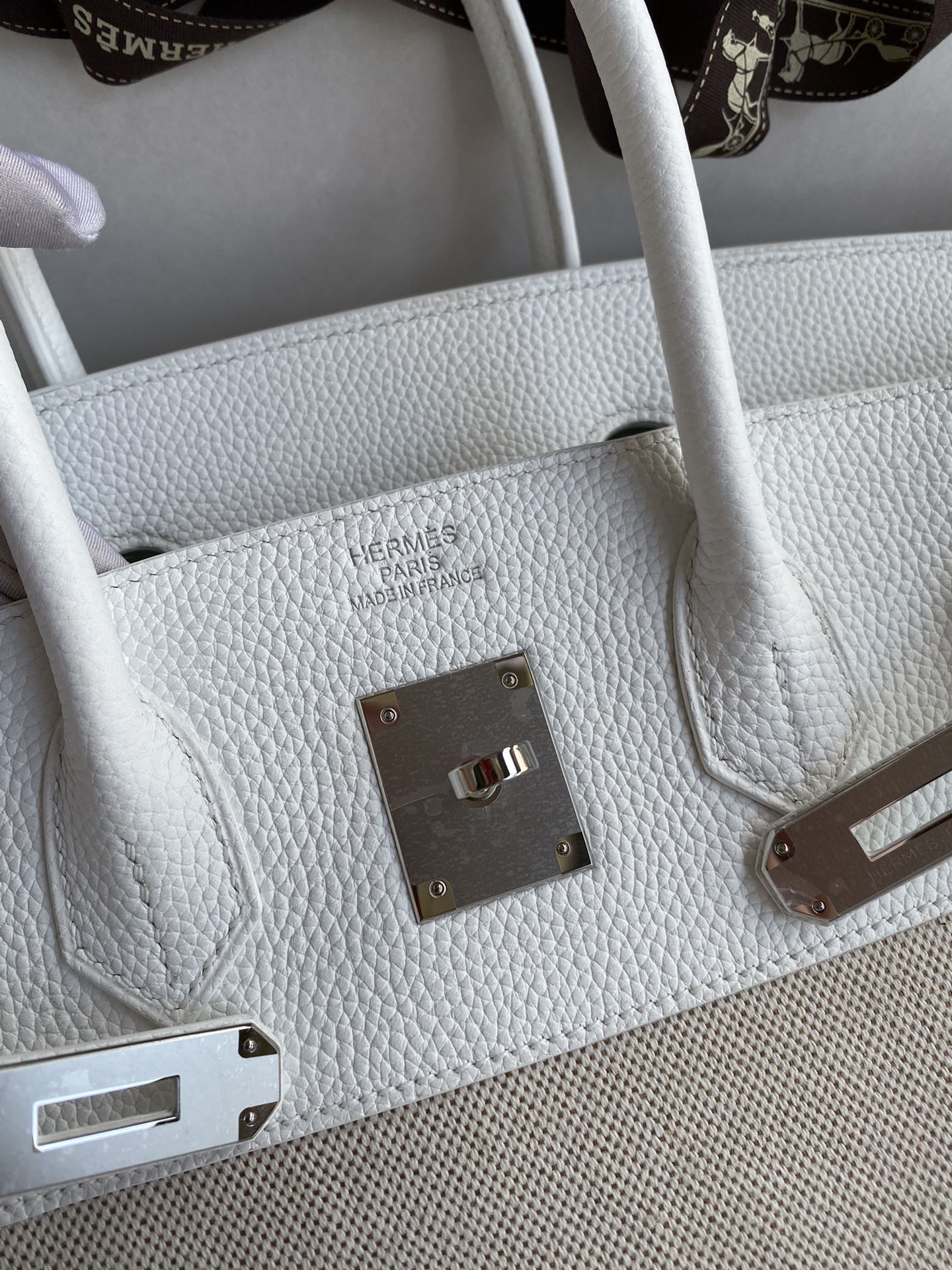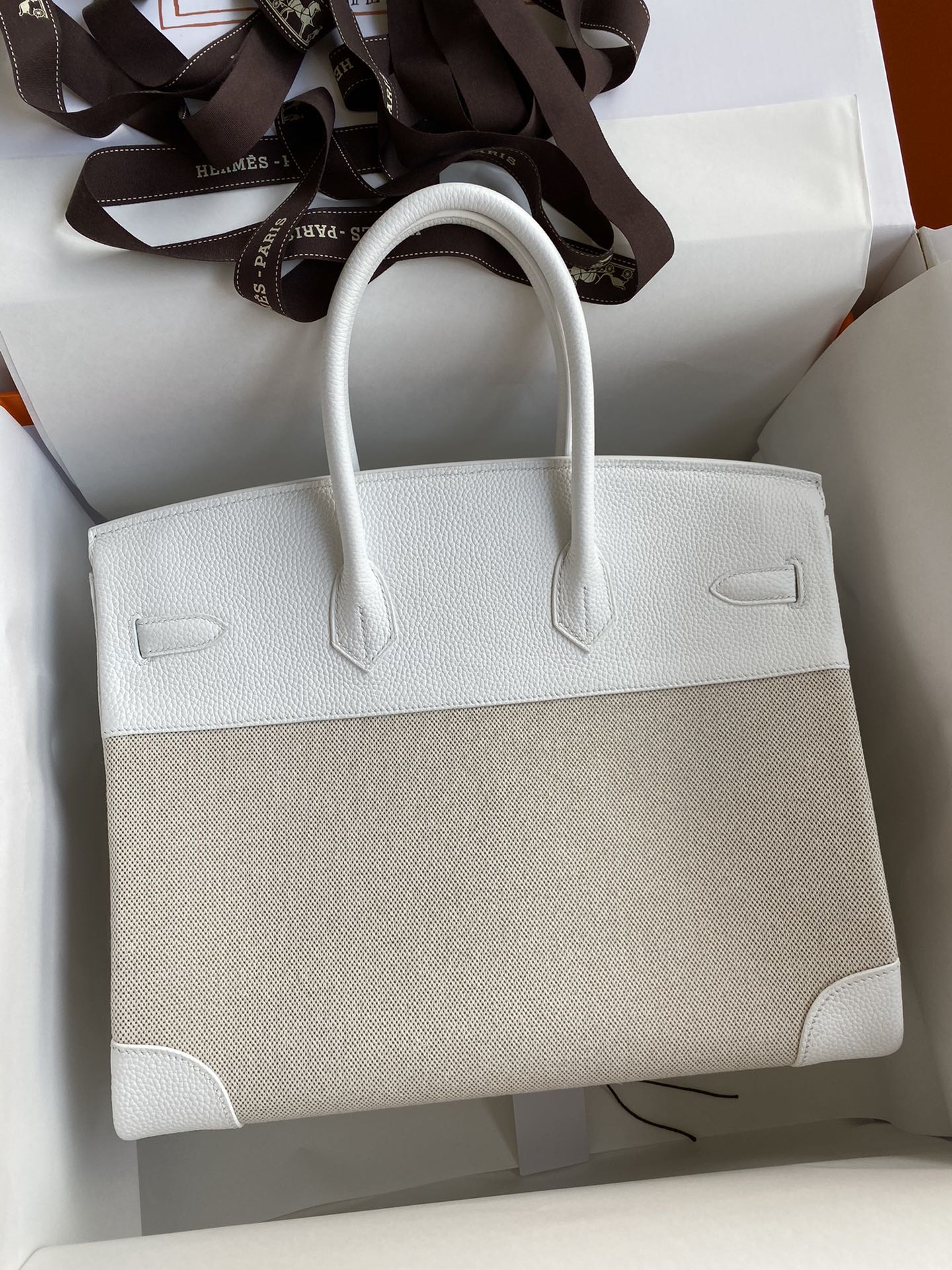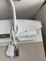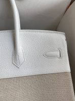 ###This Birkin is in White togo leather and Craie canvas with Palladium hardware and has tonal stitching, front flap, two straps with center toggle closure, clochette with lock and two keys, and double rolled handles.###