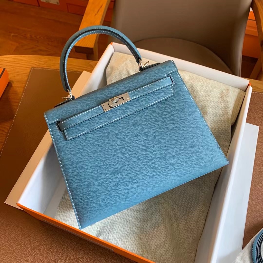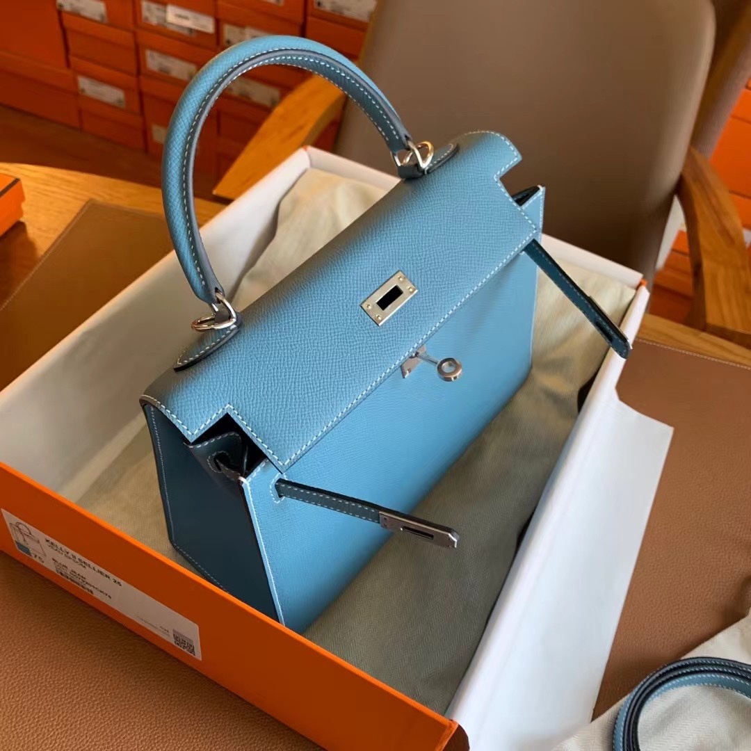 This is a replica ###Hermès Kelly Sellier 25 Blue Jean Epsom Palladium Hardware. ###