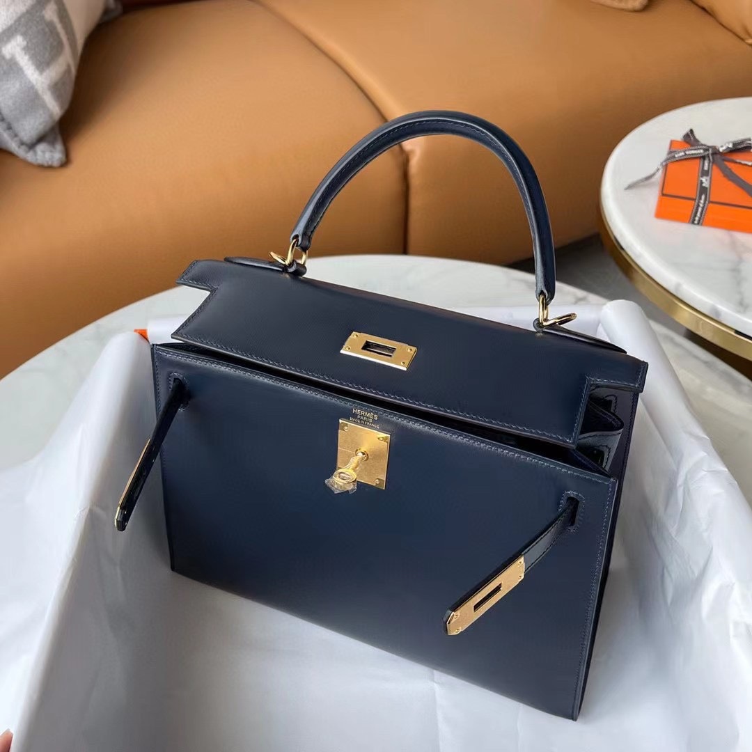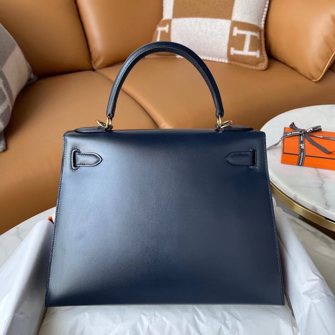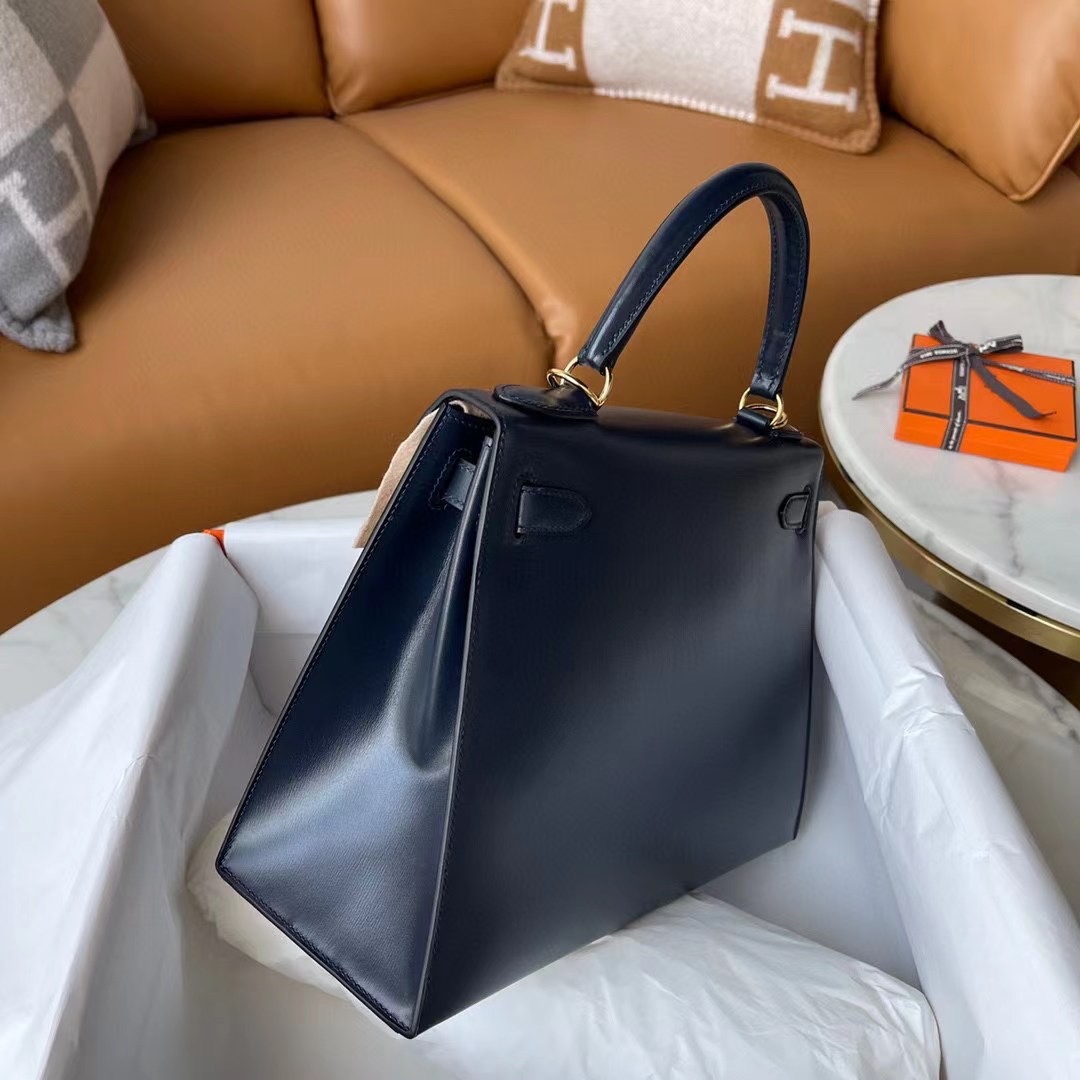This is a replica ###Hermès Kelly Sellier 28 Blue Nuit Box Leather Gold Hardware. ###