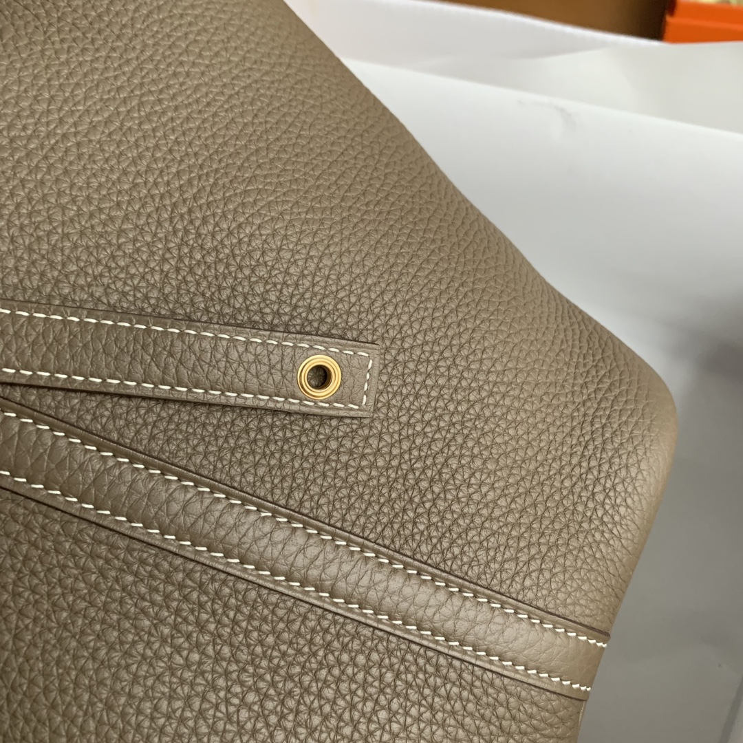 ###This Picotin Lock is in Etoupe clemence leather with gold hardware and has contrast stitching with two top handles.###