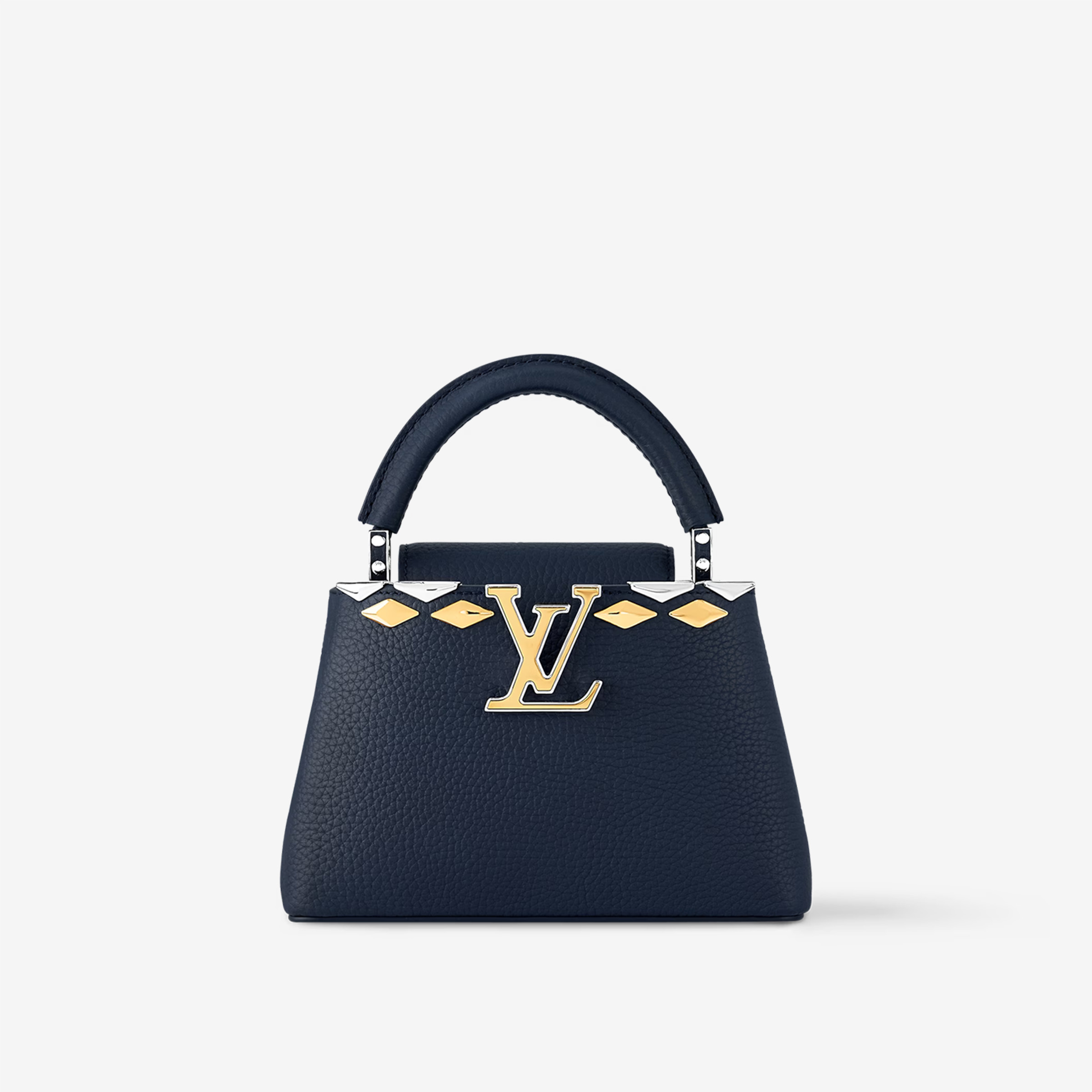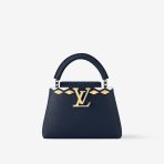 This is a replica LOUIS VUITTON M12751 Capucines BB. ,10.6 x 6.8 x 3.5 inches ,Navy,Taurillon leather,Taurillon-leather trim,Cowhide-leather lining,Gold and silver-toned hardware,Double carry style: flap inside or outside,Compartmented interior with 1 flat pocket,4 protective metal base feet,Strap:Removable, adjustable,Strap drop:18.3 inches,Strap drop max:21.3 inches,Handle:Single