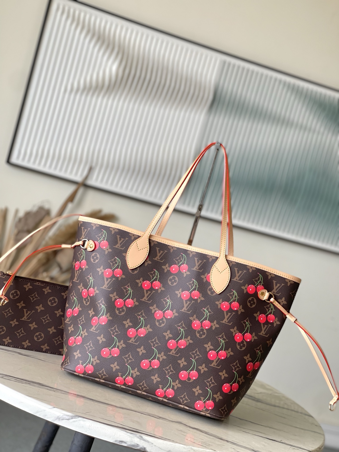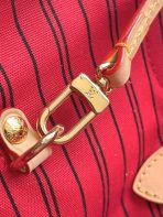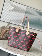 This is a replica LOUIS VUITTON M13263 LV x TM Neverfull MM Bag. ,31 x 28 x 14 cm ,Monogram cherry coated canvas,Cowhide leather trim,Textile lining,Gold-colour hardware,Hook closure,Removable zipped pouch,4 side laces,Fits 13-inch laptop, smartphone, earphones, Zippy Long Wallet, keys,Handle: Single x2