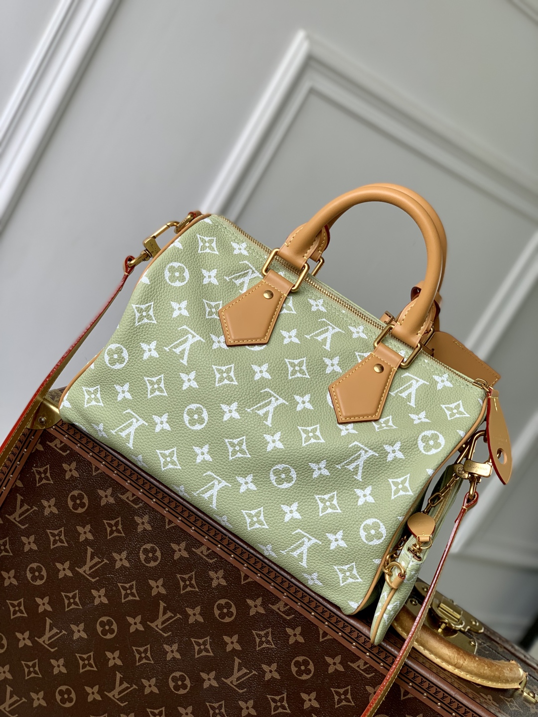 This is a replica LOUIS VUITTON M14064 ,Speedy P9 Bandoulière 30,12.6 x 8.9 x 7.1 inches,(Length x Height x Width),Frozen Lime,Calf leather,Calf-leather trim,Lambskin lining,Aged-gold-tone hardware,Main compartment with lock,Inside trio flat pocket,Inside zipped pocket,Removable pouch in leather,Name tag,Key bell,Strap:Removable, adjustable,Strap drop:18.1 inches,Strap drop max:23.6 inches,Handle:Double