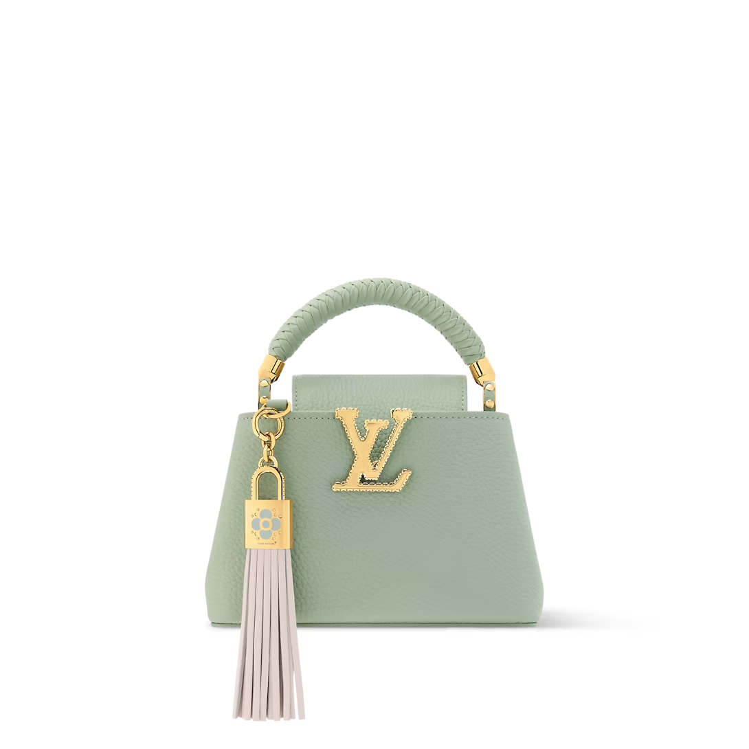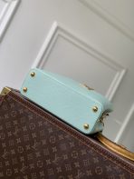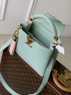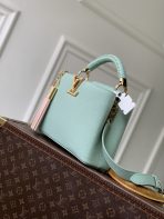 This is a replica LOUIS VUITTON M15157 Capucines Mini. ,21 x 13.6 x 8 cm ,Jade Green,Taurillon leather,Cowhide and Taurillon leather trim,Cowhide leather lining,Gold-colour hardware,1 removable tassel charm with a decorative padlock,Double carry style: flap inside or outside,Compartmented interior with 1 flat pocket,4 protective metal base feet,Fits smartphone, Capucines Compact Wallet, keys,Strap: Removable, adjustable,Strap Drop: 46.5 cm,Strap Drop Max: 54.0 cm,Handle: Single