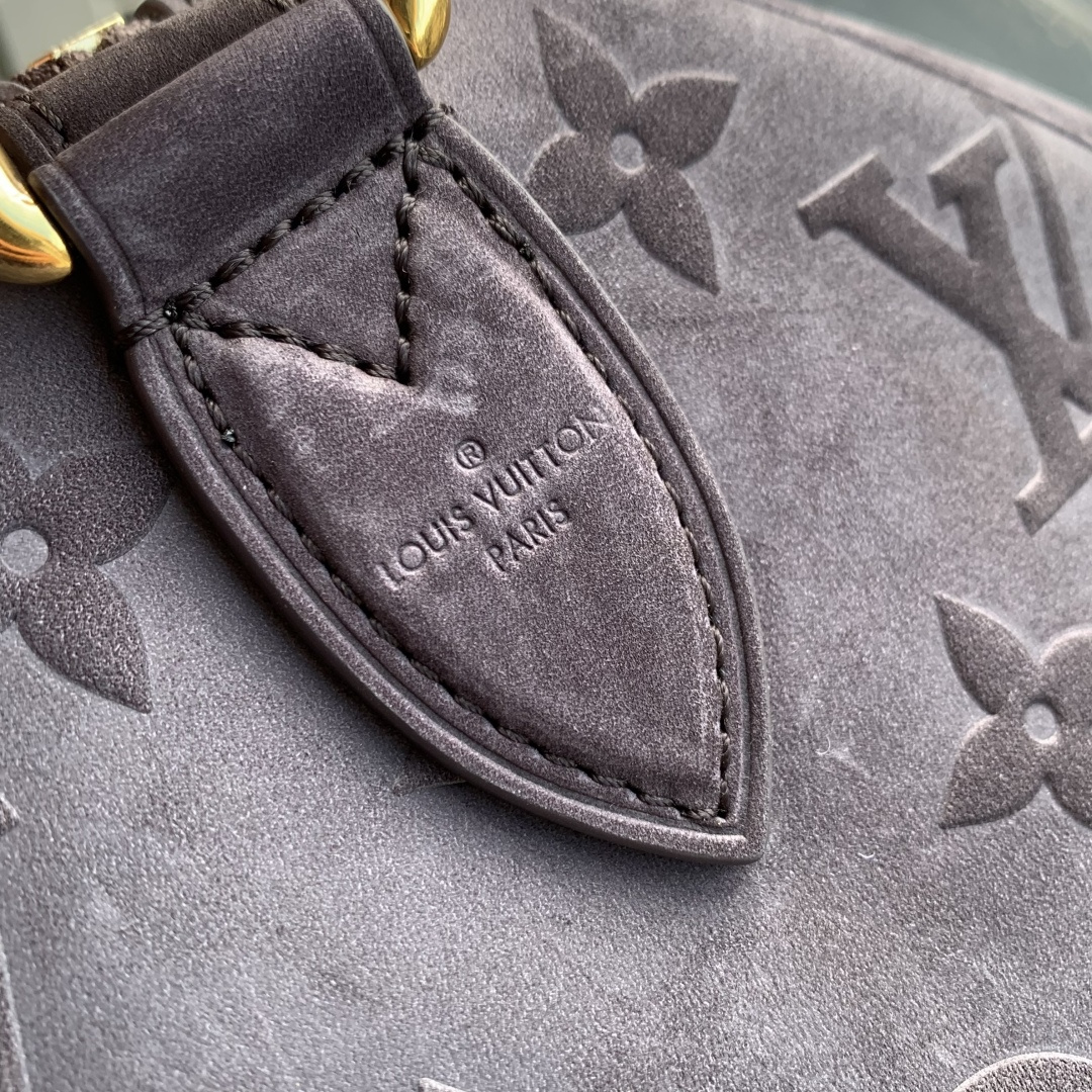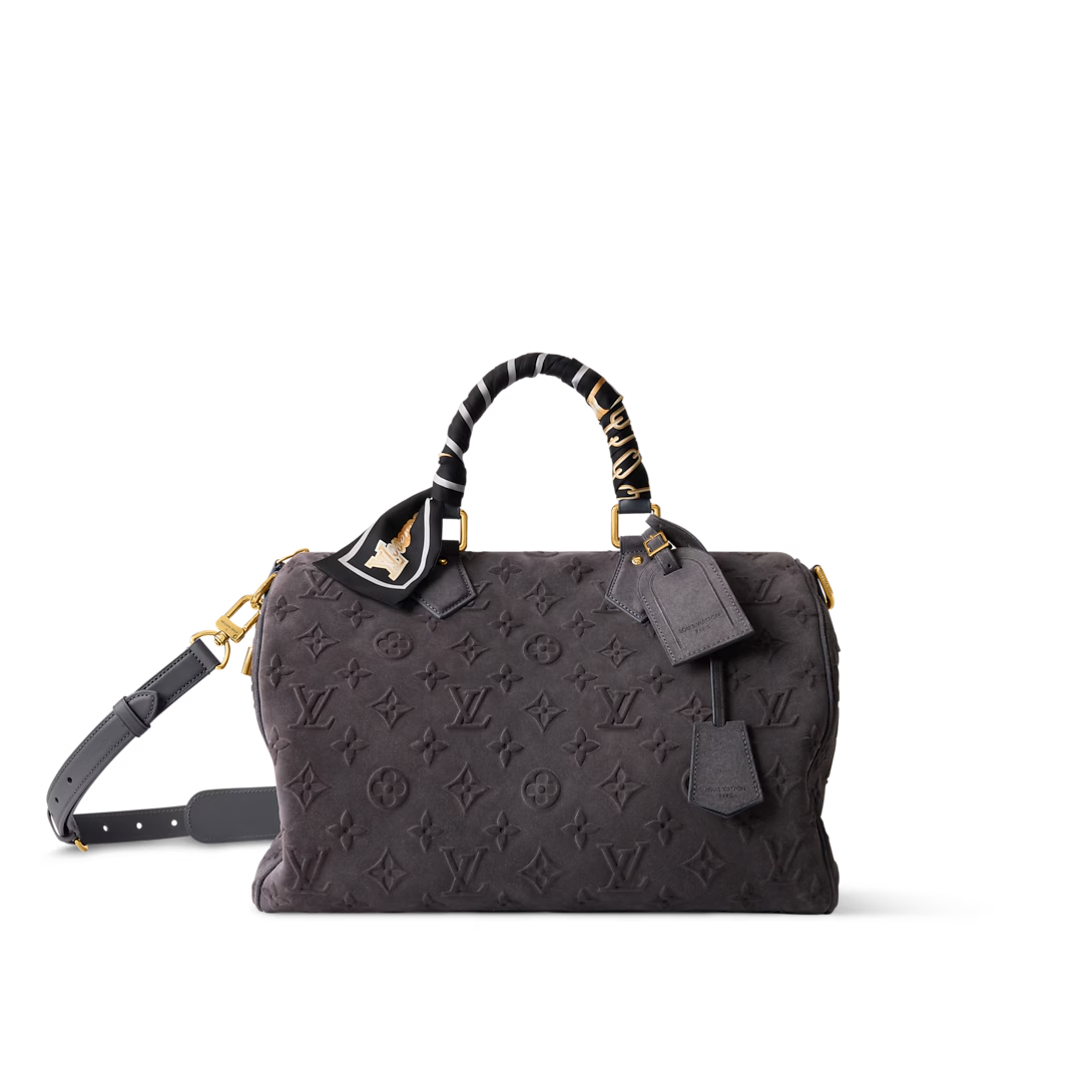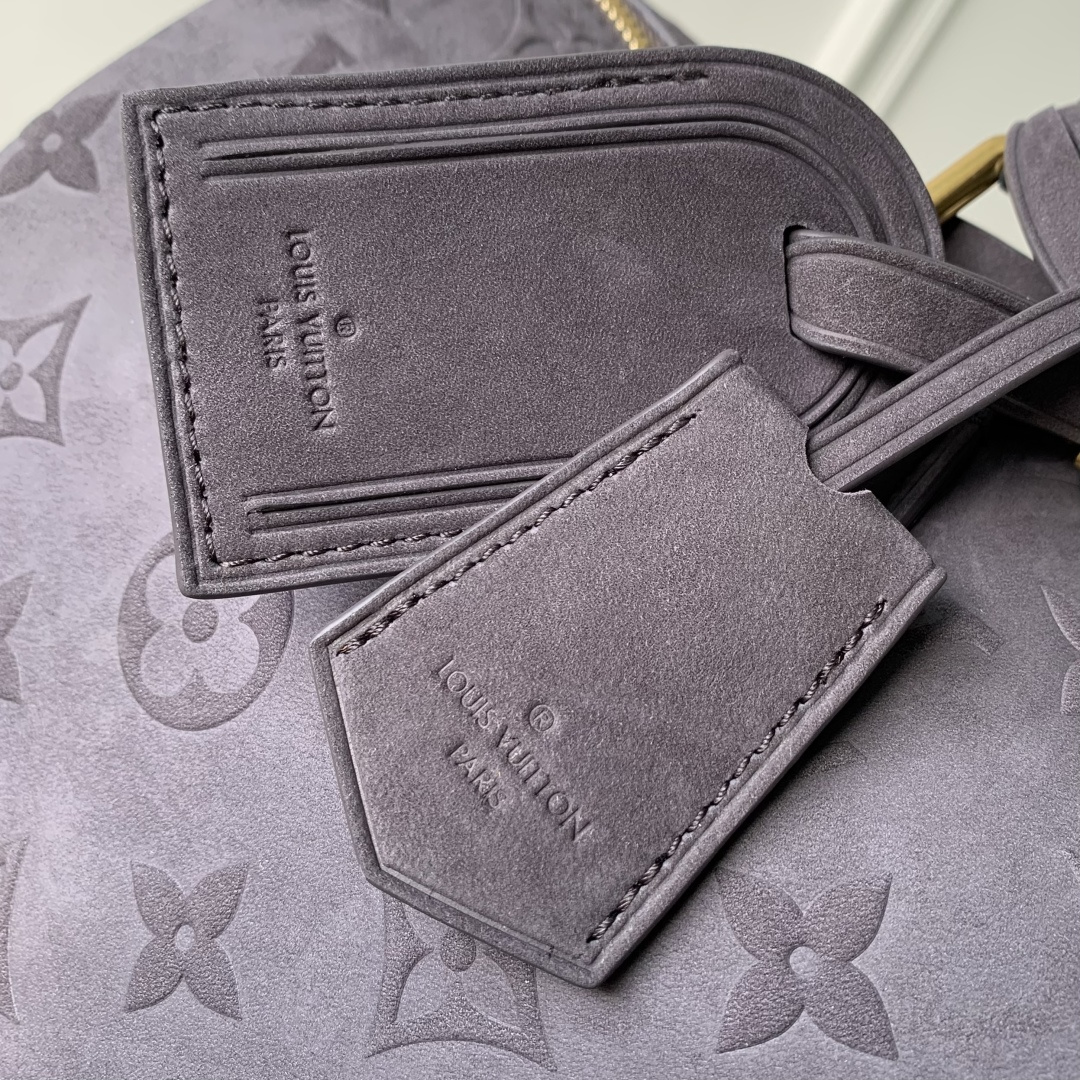 This is a replica LOUIS VUITTON M15225 Speedy P9 Bandoulière 40. ,40 x 26 x 23 cm ,Grey,Suede,Cowhide leather trim,Lambskin leather lining,Coloured hardware,Main compartment with lock,Flat inside trio pocket,Zipped inside pocket,Removable pouch in leather,Name tag,Key bell,Strap: Removable, adjustable,Strap Drop: 46.0 cm,Strap Drop Max: 60.0 cm,Handle: Single x2