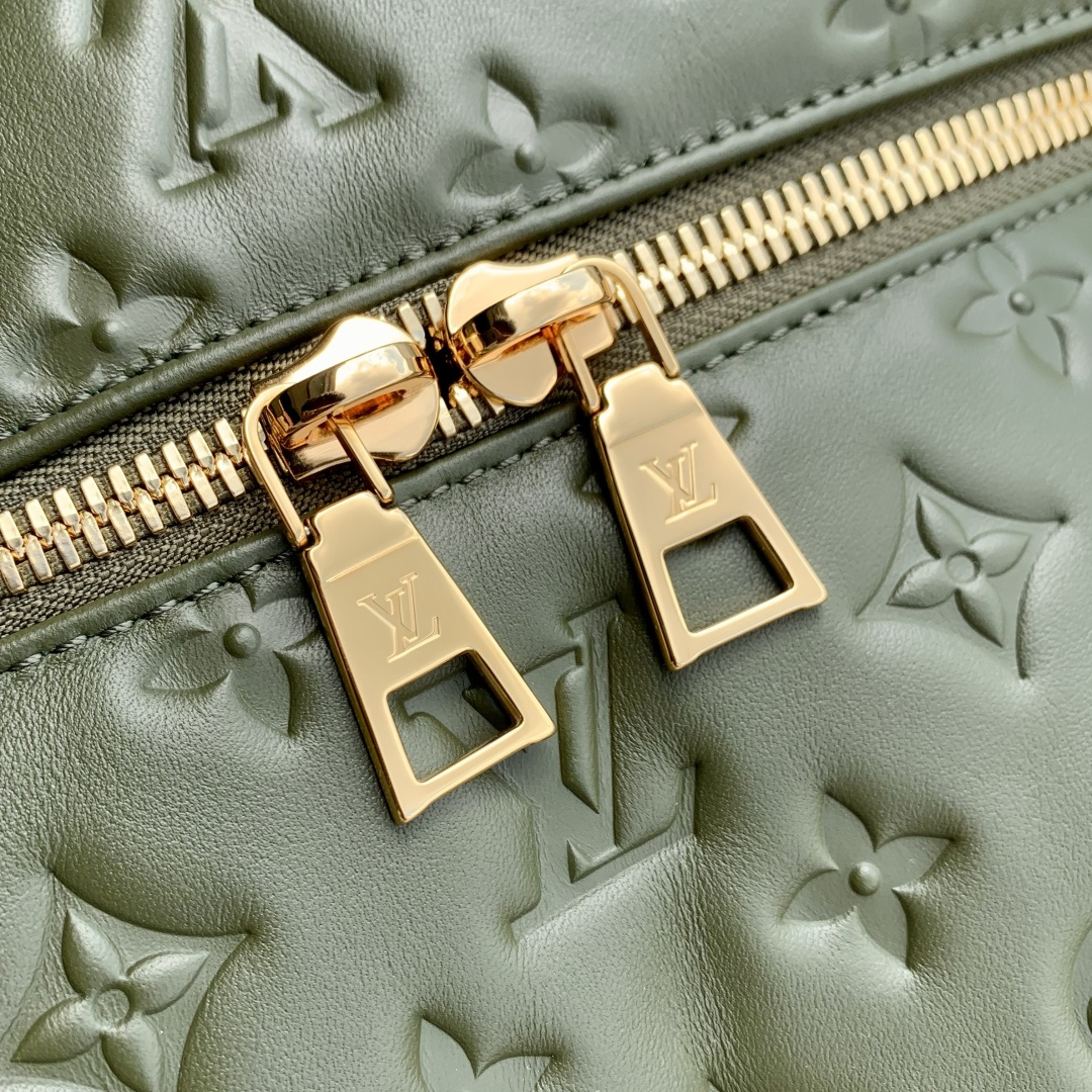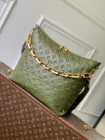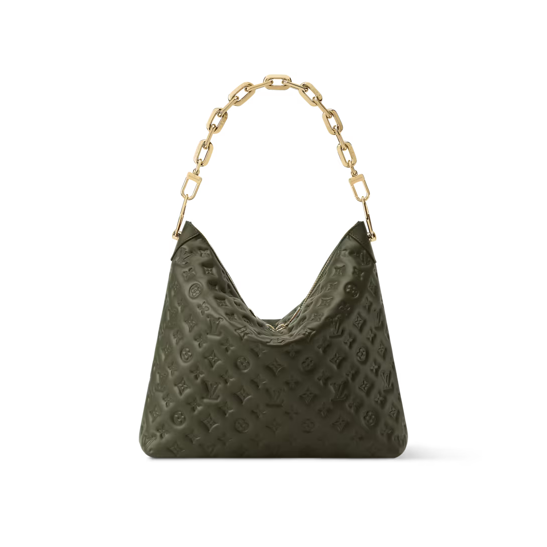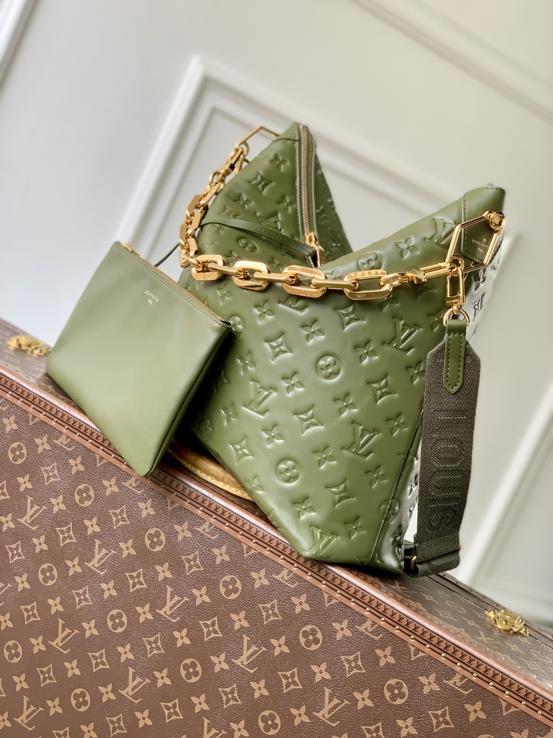 This is a replica LOUIS VUITTON M15228 Coussin Hobo MM Bag. ,38 x 33 x 10 cm ,Dark Khaki ,Calf leather,Cowhide leather trim,Cowhide leather lining,Gold-colour hardware,Zip closure,1 removable zipped pocket,Fits 13-inch laptop, smartphone, earphones, Zippy Wallet, sunglasses, keys, lipstick,Strap: Removable, adjustable,Strap Drop: 30.0 cm,Strap Drop Max: 50.0 cm,Chain: Removable,Chain Drop: 24.0 cm
