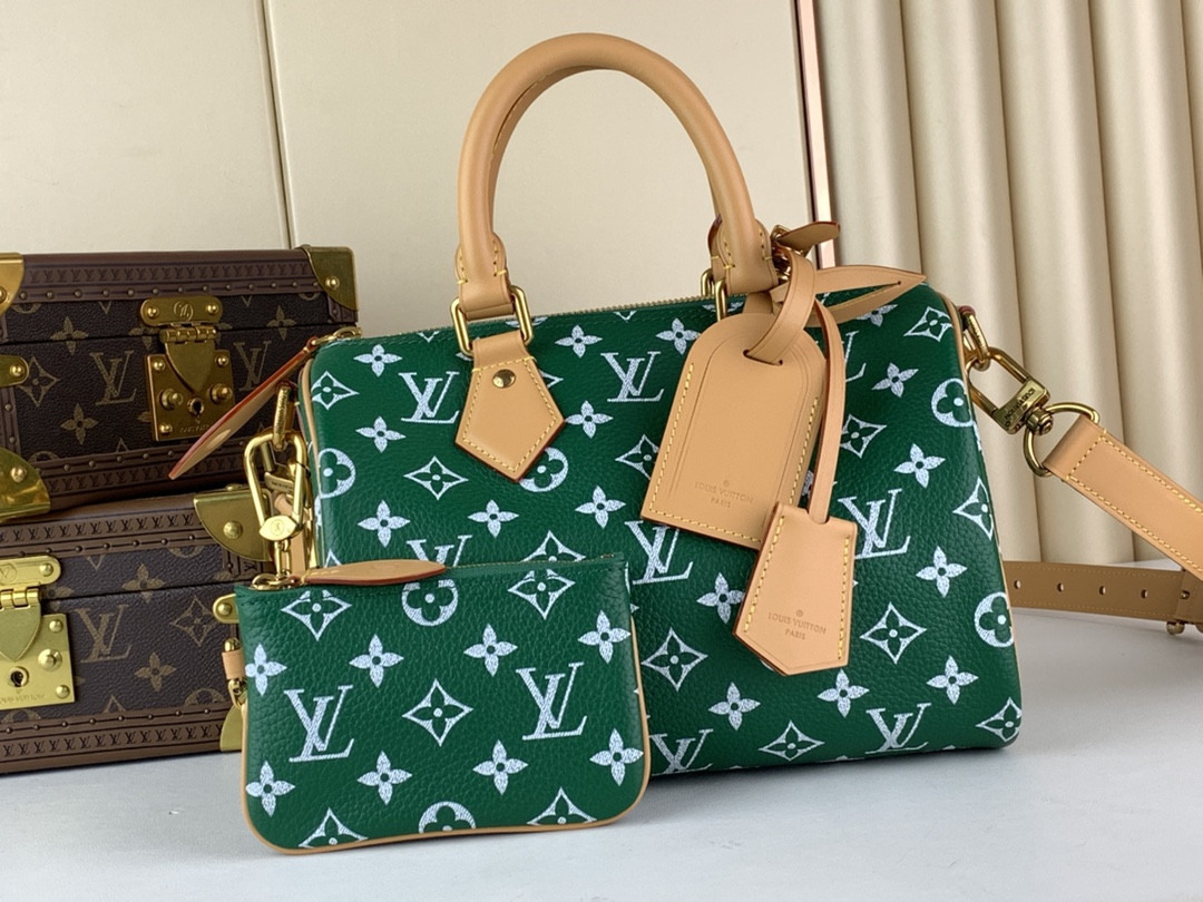 This is a replica LOUIS VUITTON M24423 Speedy P9 Bandoulière 25. ,9.8 x 7.5 x 5.9 inches ,Green,Soft calfskin,Natural cowhide-leather trim,Lambskin lining,Gold-color hardware,Main compartment with lock,Inside zipped pocket,Removable pouch in leather,Name tag,Key bell,Strap:Removable, adjustable,Strap drop:21.7 inches,Strap drop max:24.8 inches,Handle:Double