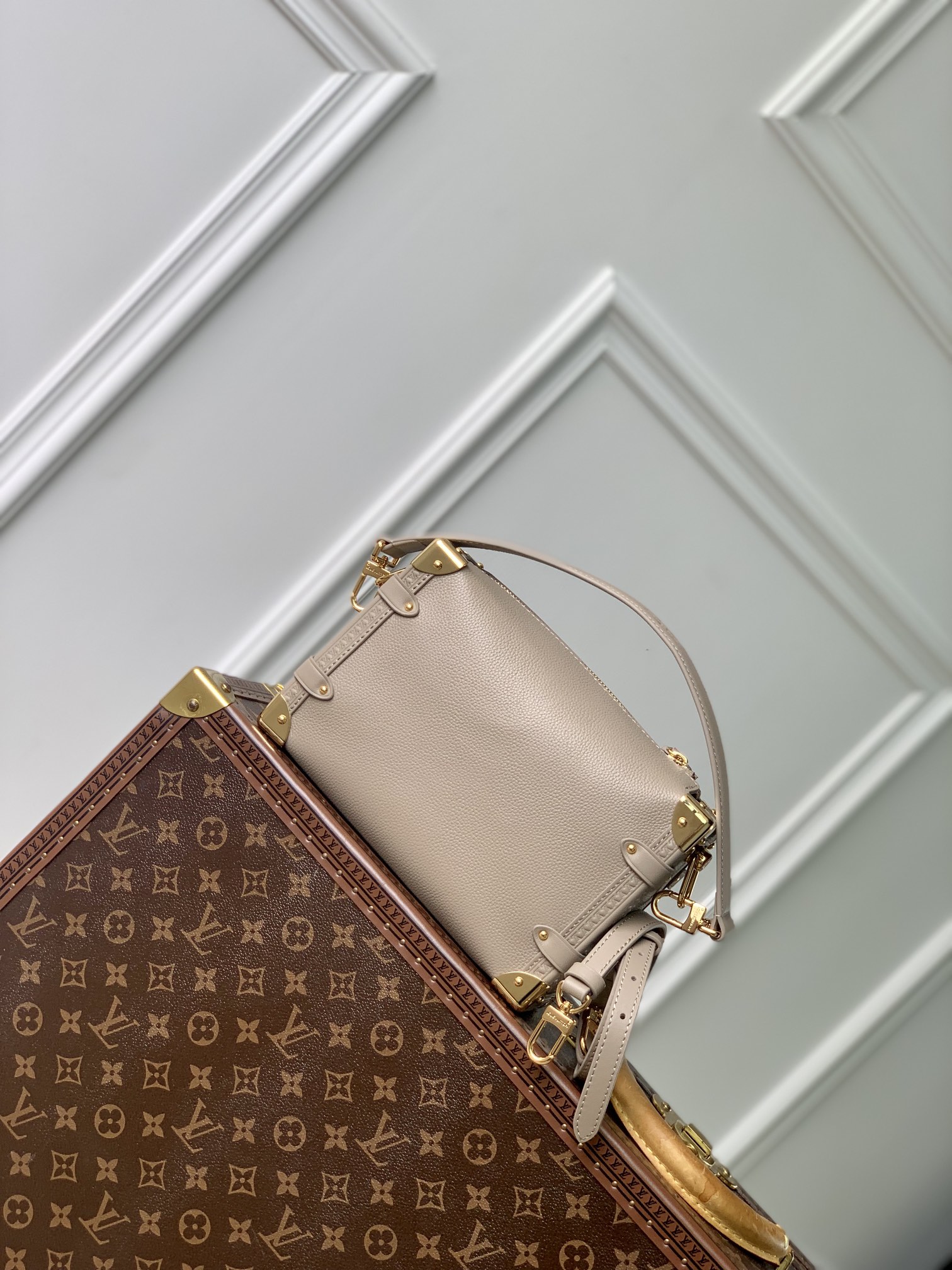 This is a replica LOUIS VUITTON M25072 Side Trunk MM. ,9.3 x 6.3 x 3.3 inches ,Taupe,Grained calf leather,Smooth cowhide-leather trim,Microfiber lining,Gold-color hardware,Zip closure with S-lock,Fits: smartphone, wallet, earphones, and keys,Strap:Removable, adjustable,Strap drop:17.7 inches,Strap drop max:21.7 inches,Handle:Single, removable
