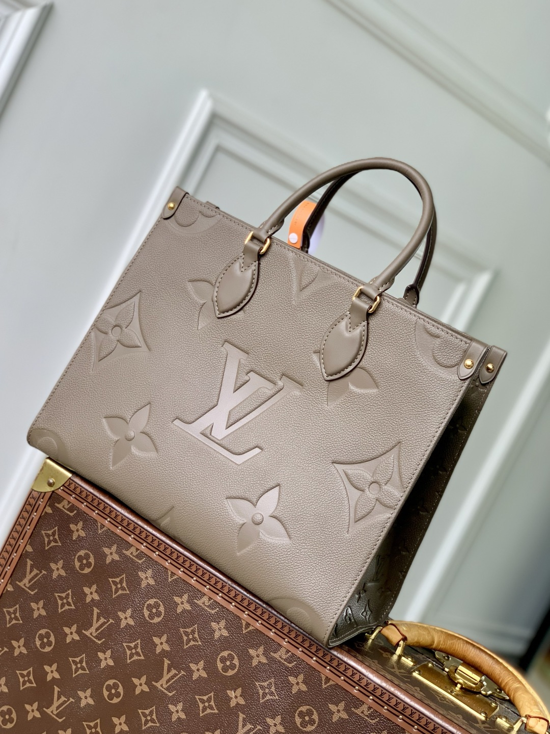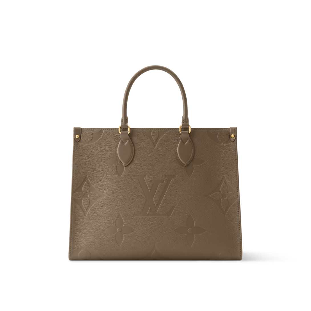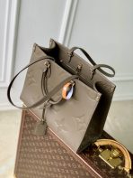 This is a replica LOUIS VUITTON M25523 OnTheGo MM. ,35 x 27 x 14 cm ,Smoke,Embossed grained cowhide leather,Cowhide leather trim,Microfibre lining,Gold-colour hardware,1 hook closure,1 inside flat zipped pocket,1 inside double pocket,Fits 13-inch laptop, smartphone, Zippy Wallet, keys, sunglasses,Handle: Single x2