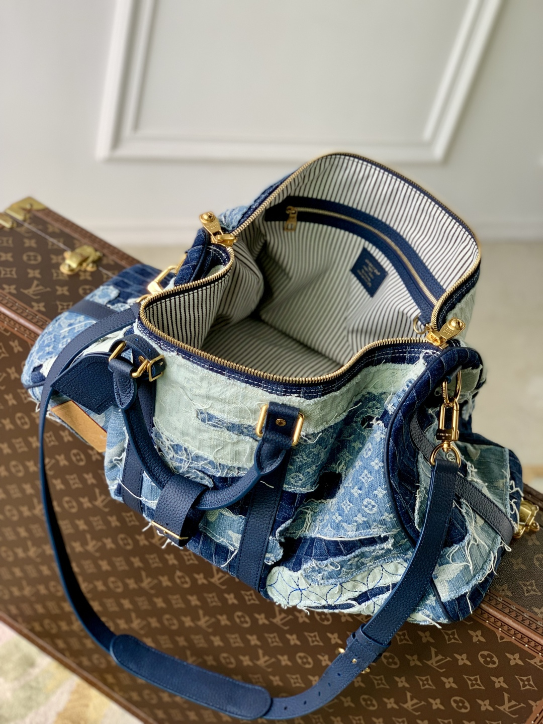 This is a replica LOUIS VUITTON M26117 Keepall Bandoulière 50. ,50 x 29 x 23 cm ,Denim Boro Landscape,Cowhide leather trim,Cotton lining,Gold-colour hardware,Cabin size,Double zip closure,Padlock,Removable name tag,Leather patch,Zipped inside pocket,Handle: Single x2