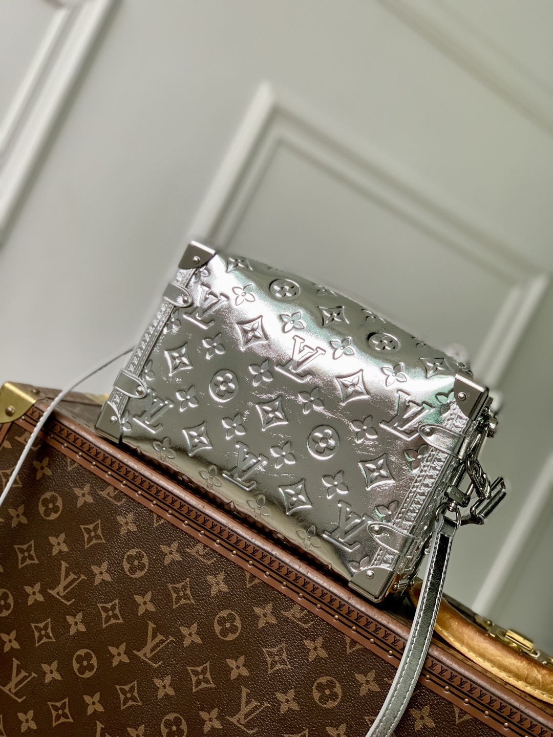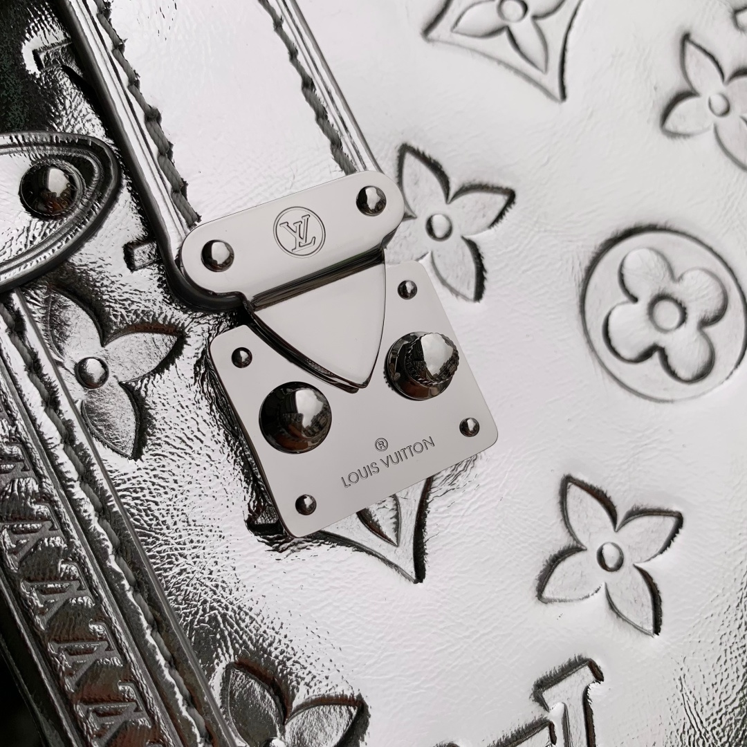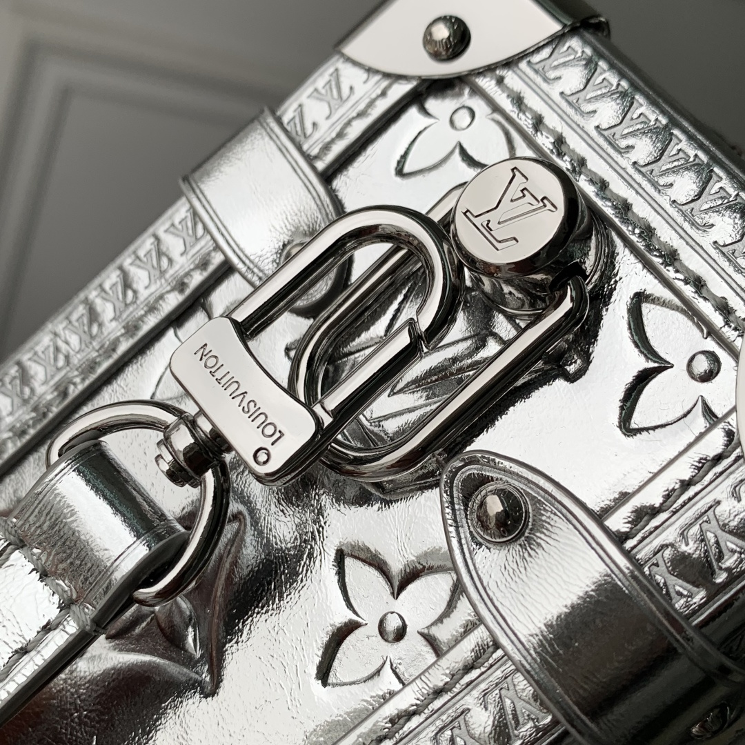 This is a replica LOUIS VUITTON M26223 Side Trunk MM. ,23.5 x 16 x 8.5 cm ,Silver,Calfskin,Cowhide leather trim,Cowhide leather lining,Silver-colour hardware,Zip closure with S-lock,Fits smartphone, earphones, Zippy wallet, keys, lipstick,Strap: Removable, adjustable,Strap Drop: 45.0 cm,Strap Drop Max: 55.0 cm,Handle: Single, removable