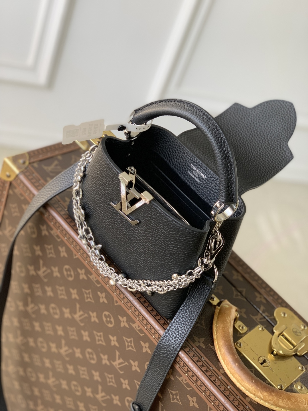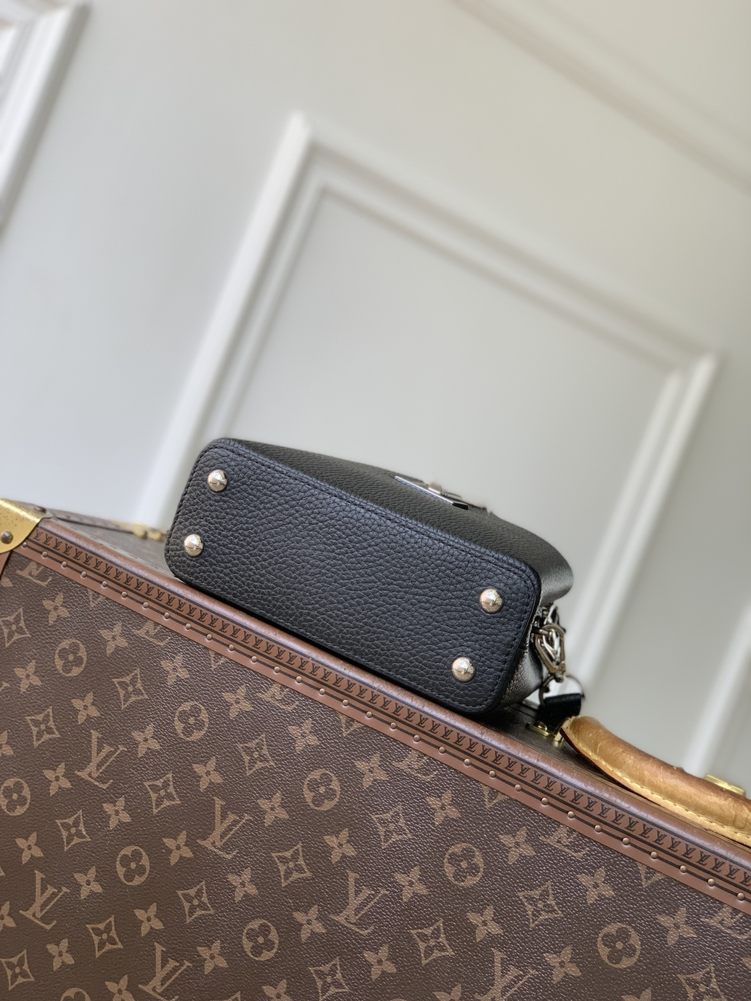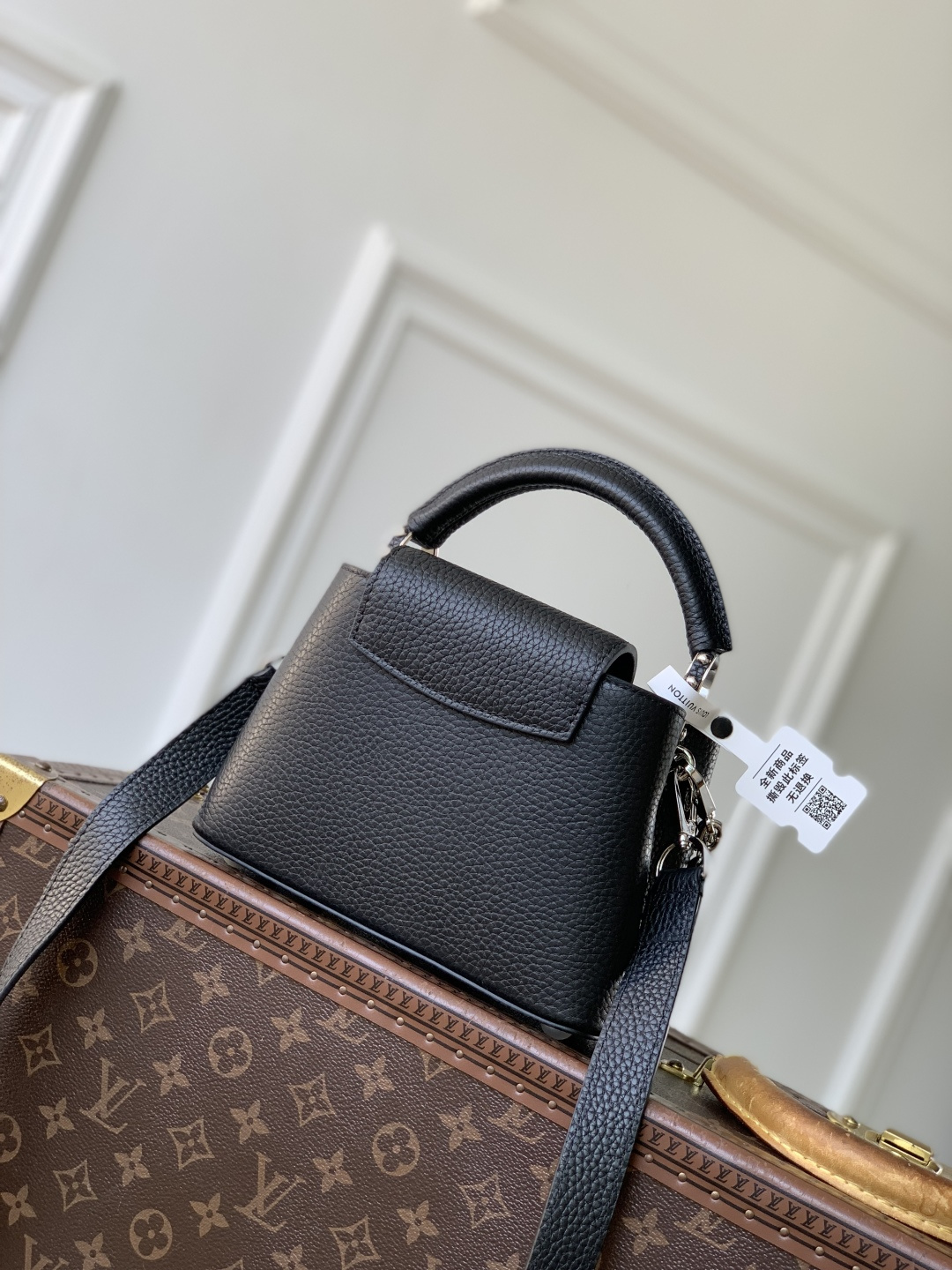 This is a replica LOUIS VUITTON M26351 Capucines Mini. ,21 x 13.6 x 8 cm ,Black,Taurillon leather,Taurillon leather trim,Cowhide leather lining,Gold- and silver-colour hardware,Double carry style: flap inside or outside,Compartmented interior with 1 flat pocket,4 protective metal base feet,Fits smartphone, Capucines compact wallet, keys,Strap: Removable, adjustable,Strap Drop: 46.5 cm,Strap Drop Max: 54.0 cm,Handle: Single