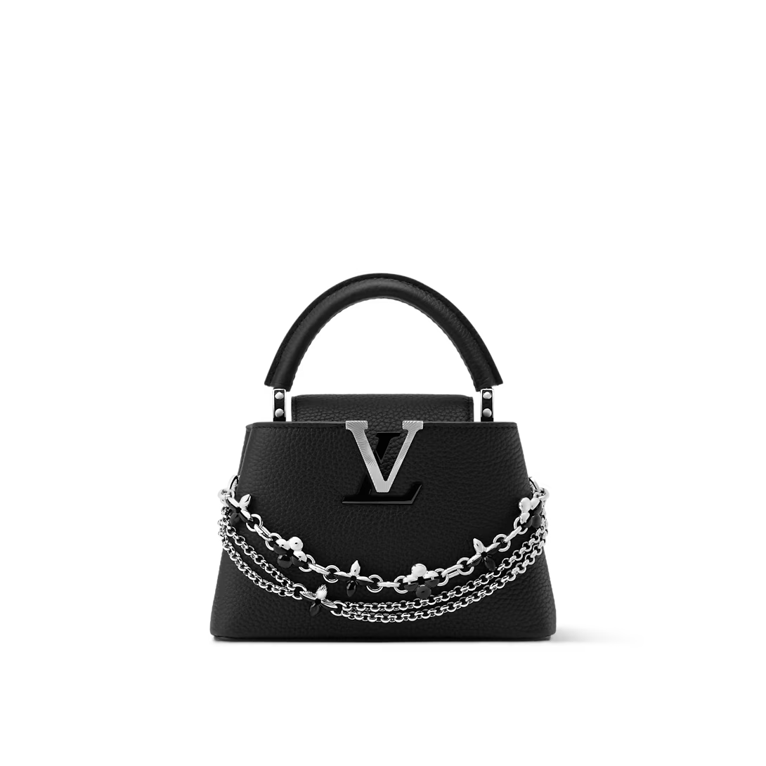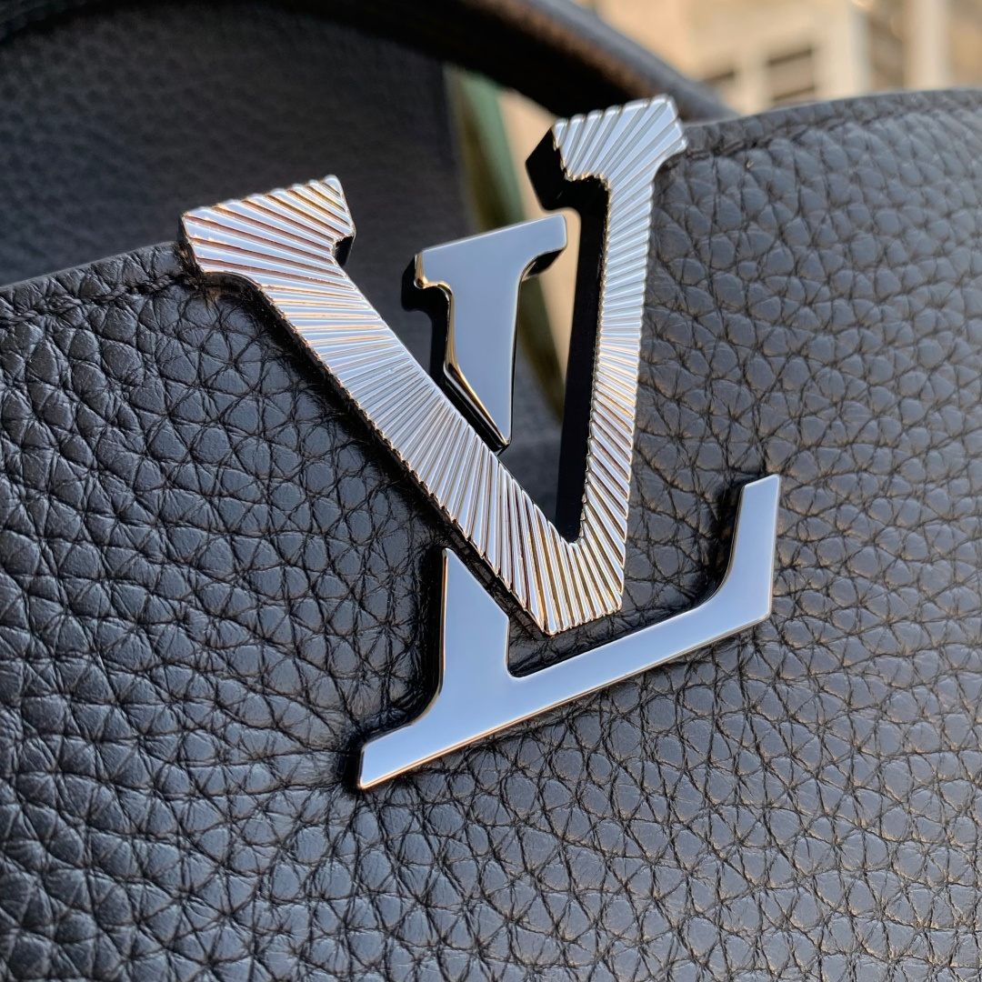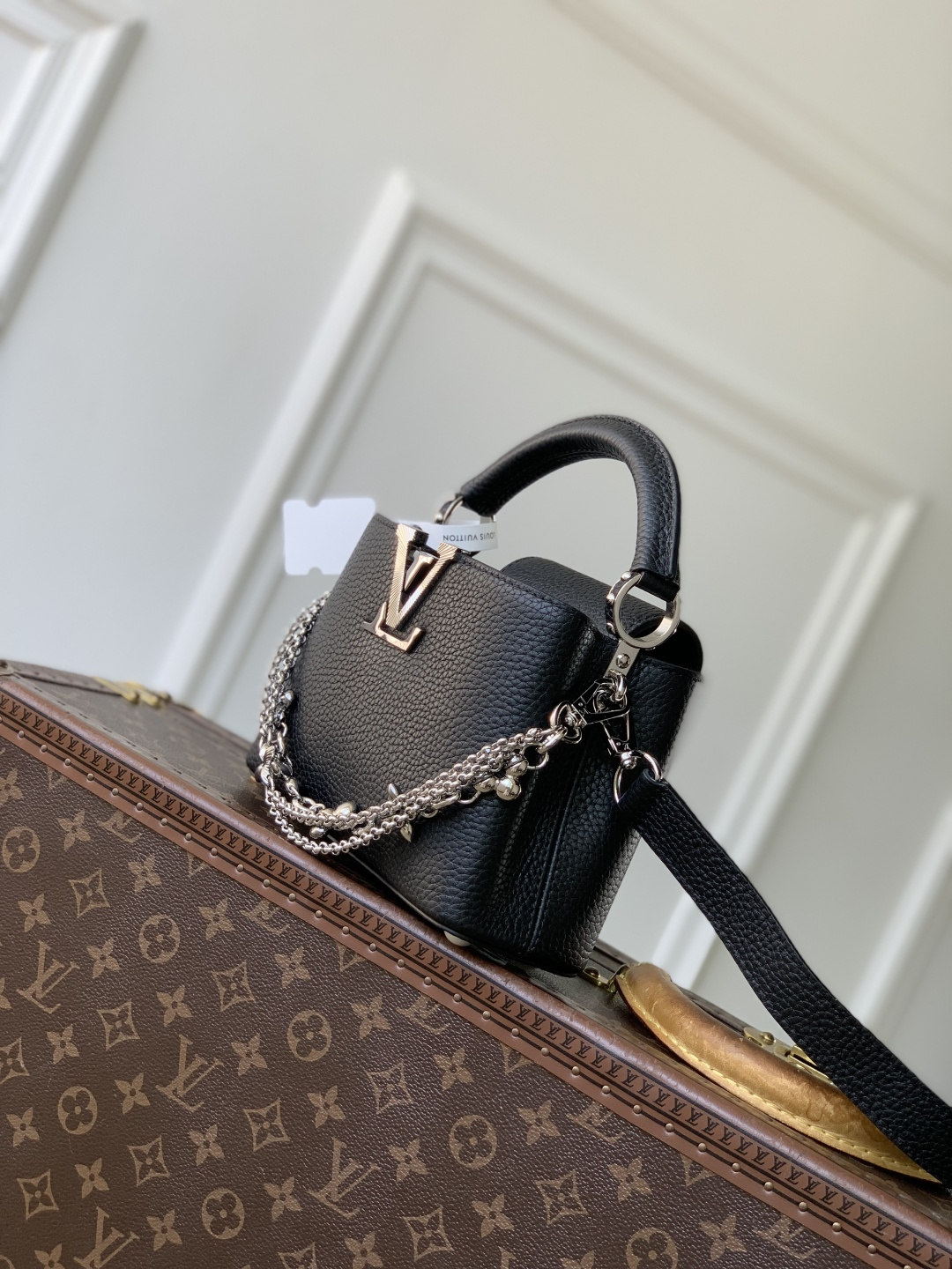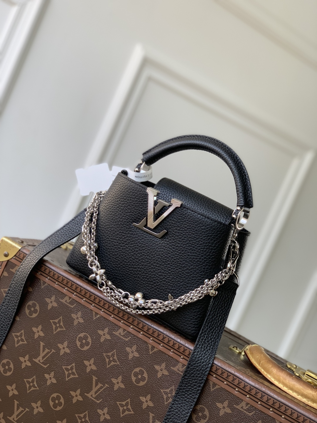 This is a replica LOUIS VUITTON M26351 Capucines Mini. ,21 x 13.6 x 8 cm ,Black,Taurillon leather,Taurillon leather trim,Cowhide leather lining,Gold- and silver-colour hardware,Double carry style: flap inside or outside,Compartmented interior with 1 flat pocket,4 protective metal base feet,Fits smartphone, Capucines compact wallet, keys,Strap: Removable, adjustable,Strap Drop: 46.5 cm,Strap Drop Max: 54.0 cm,Handle: Single