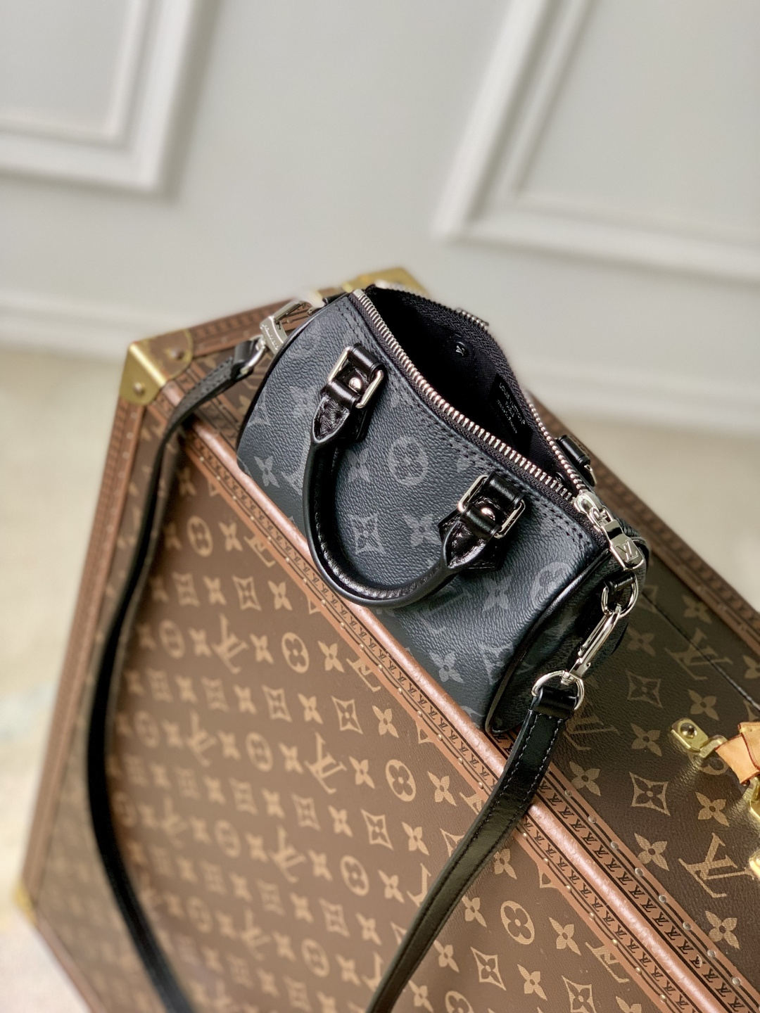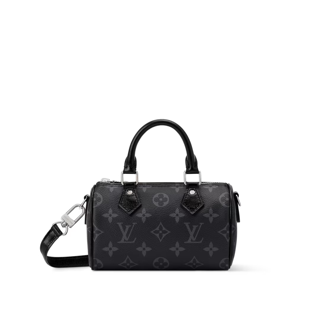 This is a replica LOUIS VUITTON M26573 Nano Speedy. ,16 x 10 x 7.5 cm ,Monogram Eclipse,Coated canvas,Cowhide leather trim,Textile lining,Silver-colour hardware,Zip closure,Fits smartphone, earphones, Victorine Wallet, keys, lipstick,Strap: Removable, adjustable,Strap Drop: 45.5 cm,Strap Drop Max: 54.0 cm,Handle: Double