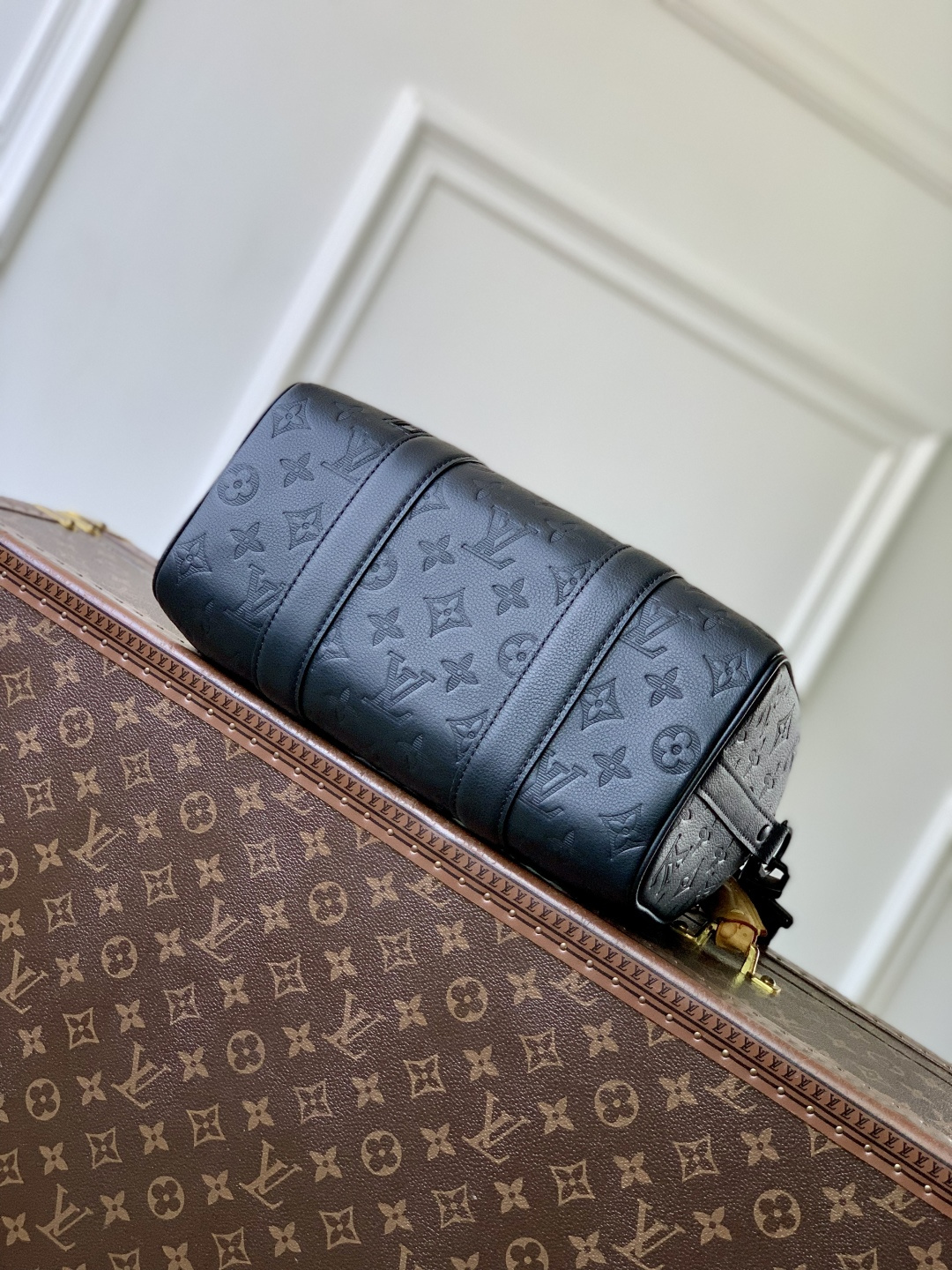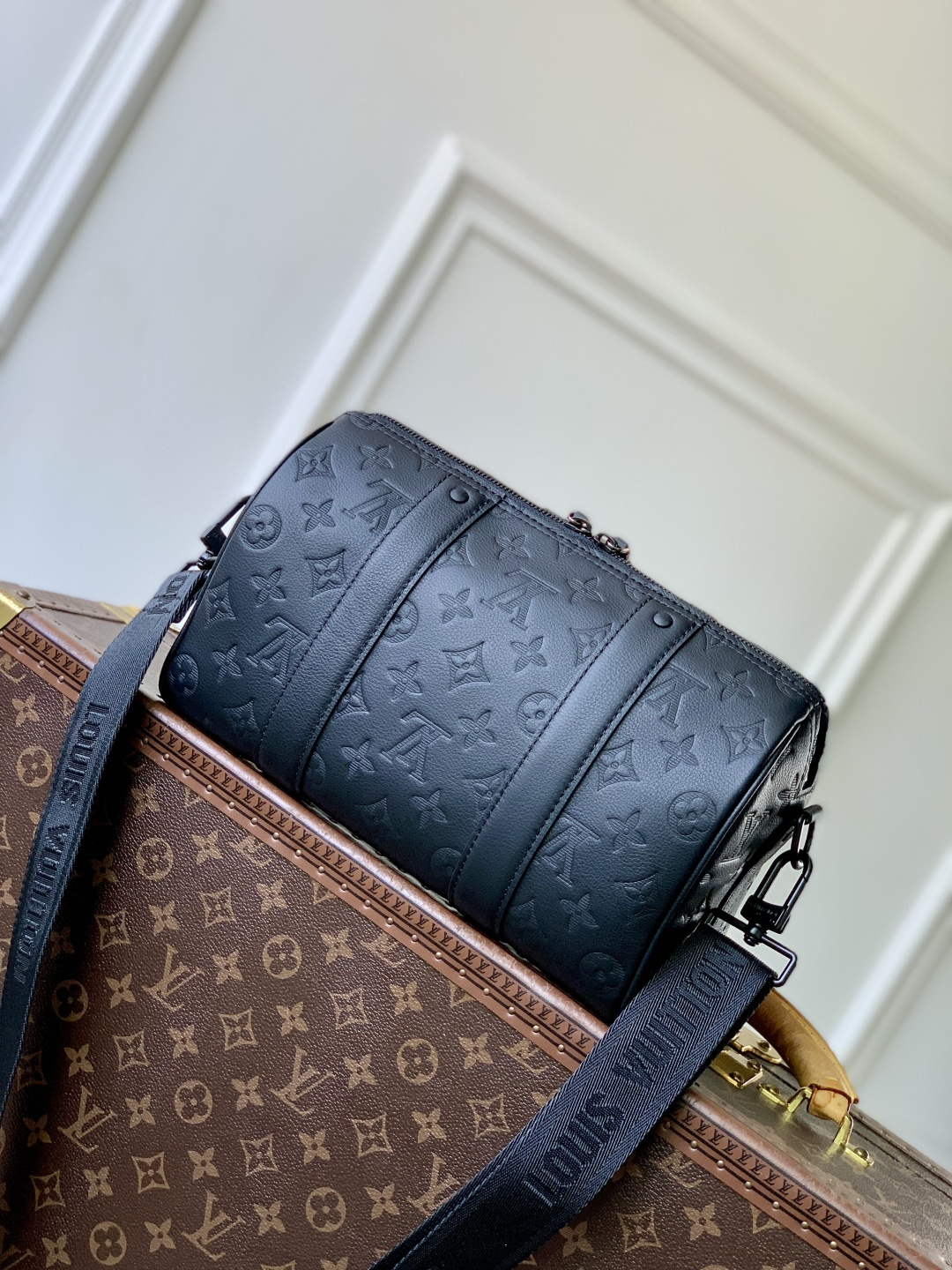 This is a replica LOUIS VUITTON M26750 City Keepall. ,27.5 x 16.5 x 15 cm ,Black,Monogram Shadow calf leather,Calf leather trim,Textile lining,Black-colour hardware,Double zipped closure,Large main compartment,Zipped front pocket,Strap: Removable, adjustable,Strap Drop: 33.5 cm,Strap Drop Max: 66.0 cm