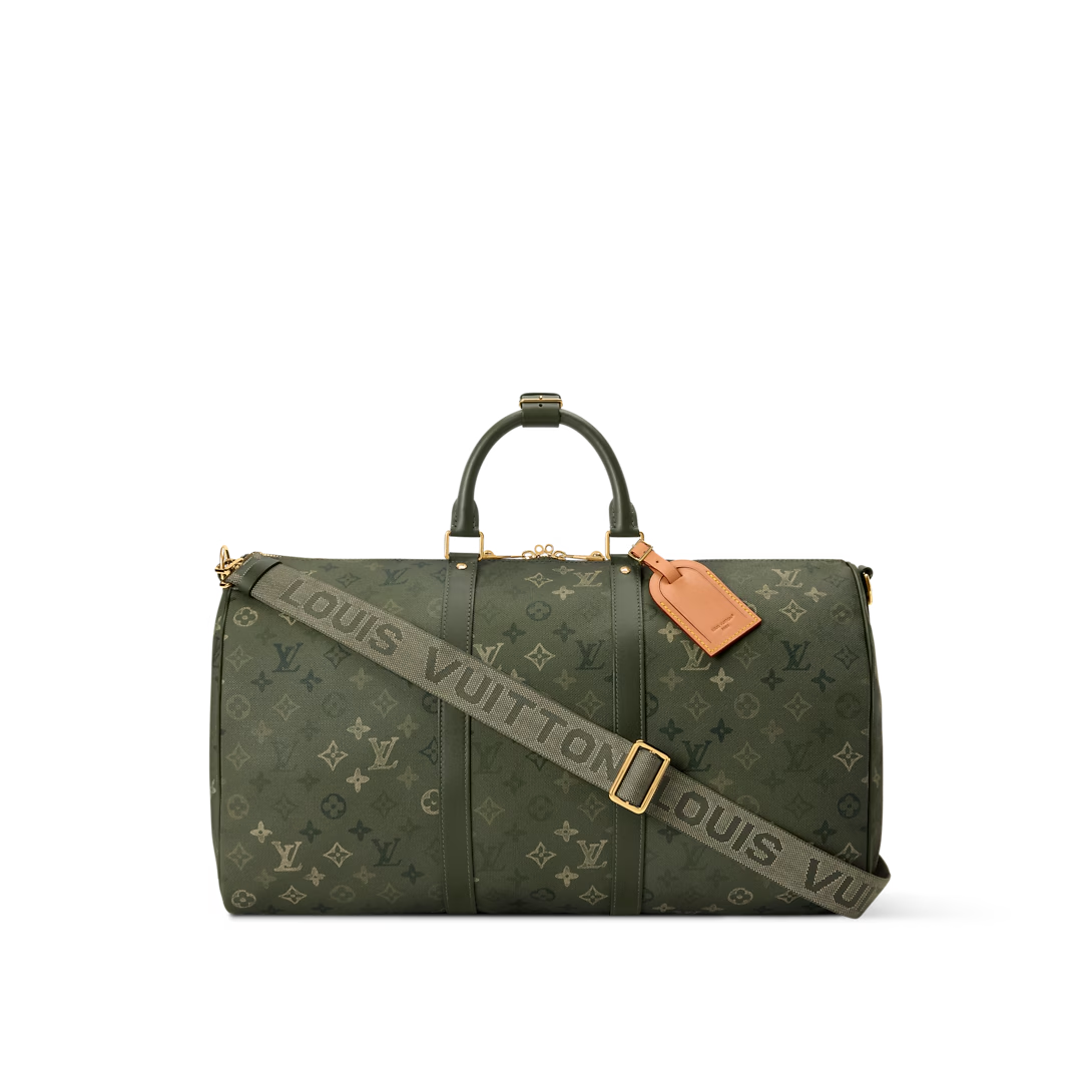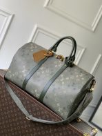 This is a replica LOUIS VUITTON M26959 Keepall Bandoulière 50. ,50 x 29 x 23 cm ,Khaki Green,Monogram Surplus coated canvas,Aged natural cowhide leather trim,Cotton lining,Aged gold-colour hardware,Cabin size,Double zip closure system,Padlock,Removable name tag,Zipped inside pocket,Handle: Single x2
