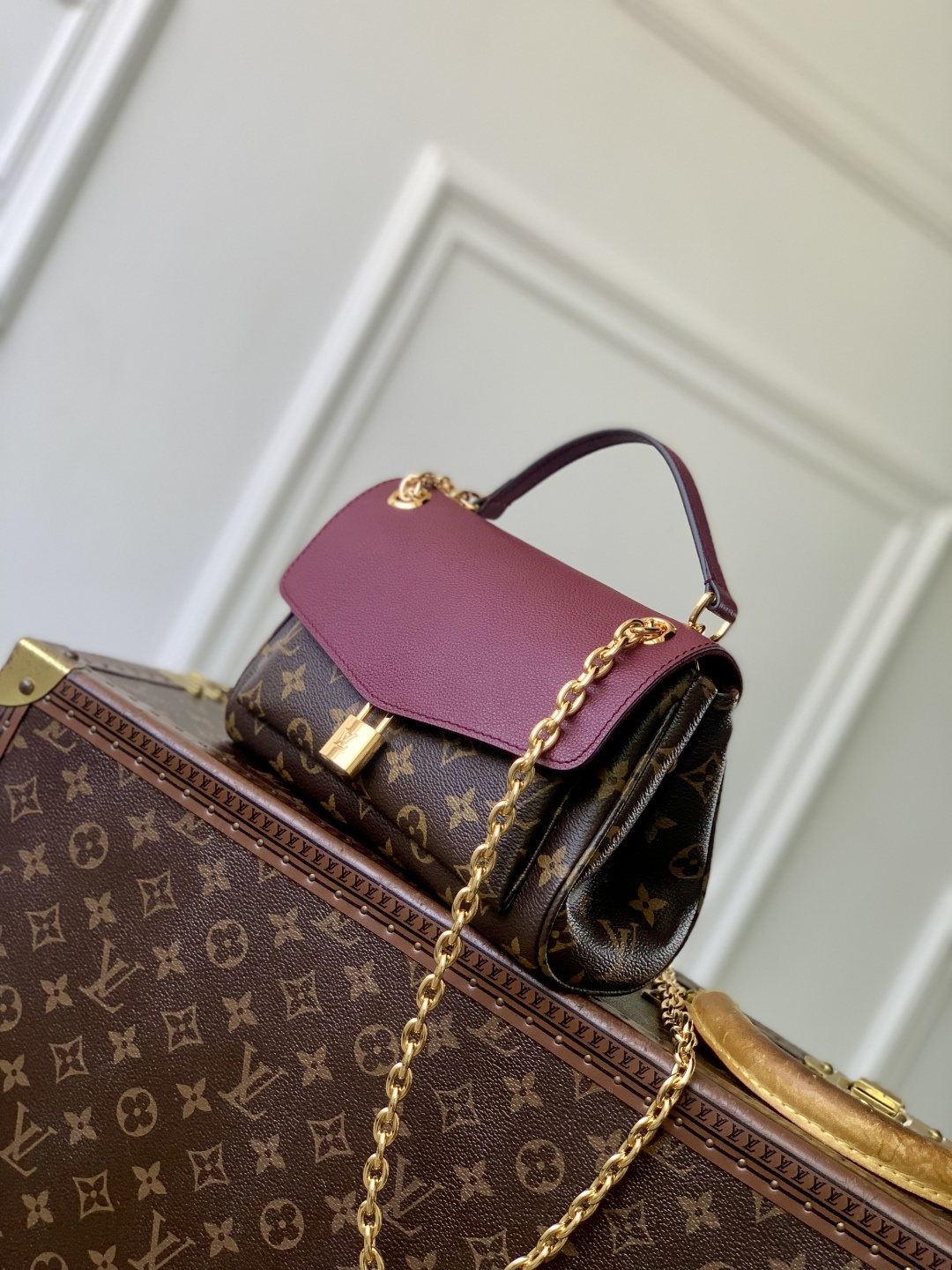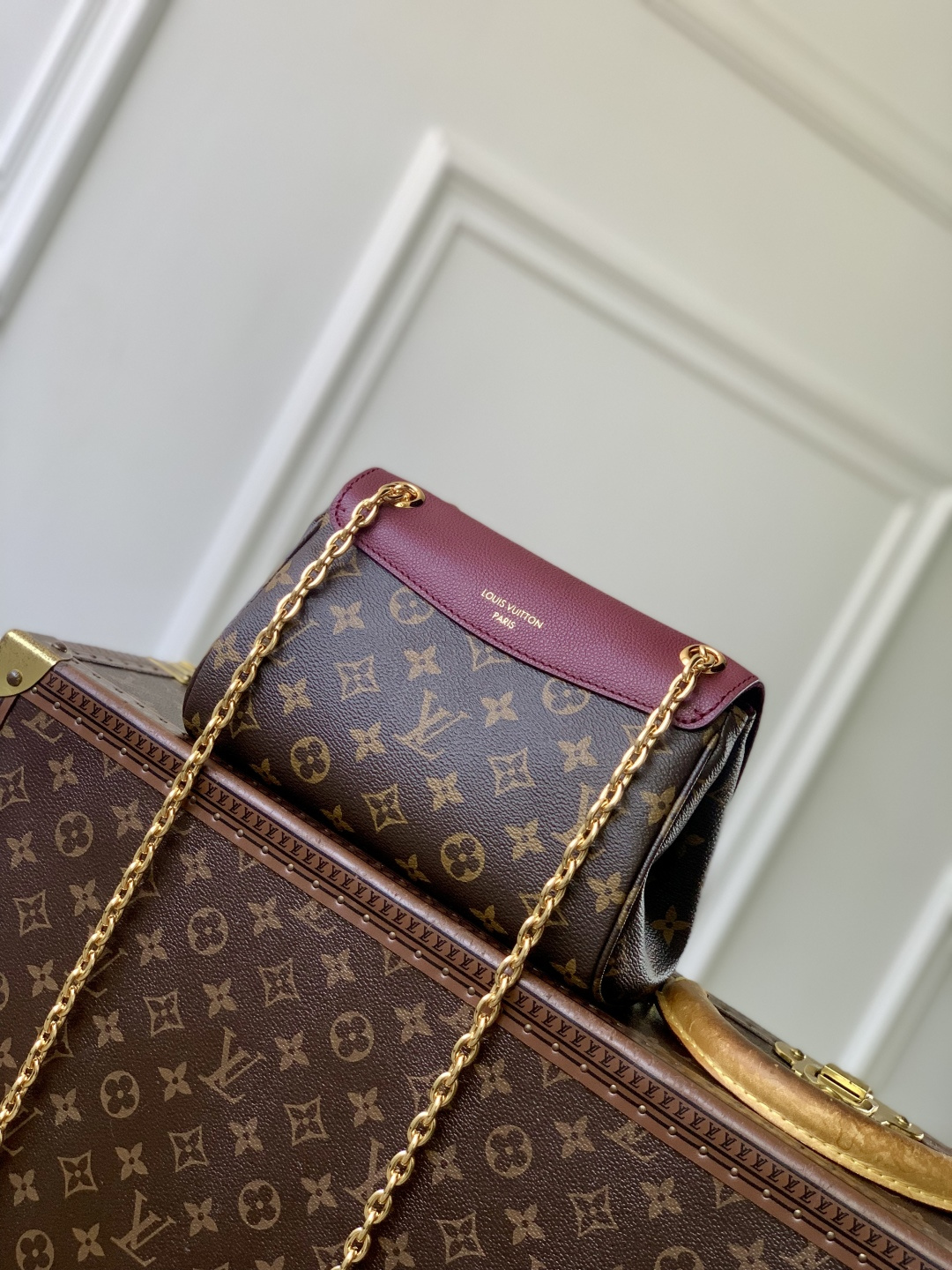 This is a replica LOUIS VUITTON M27067 Saint Germain BB. ,24 x 17 x 9 cm ,Monogram/Wine Red,Leather and coated canvas,Leather trim,Textile lining,Aged gold-colour hardware,1 protective leather shoulder pad,Magnet closure,2 press studs,1 padlock,1 exterior pocket,1 flat inside pocket,Fits 6.7-inch smartphone, earphones, Rosalie Coin Purse, lipstick,Chain: Sliding, non-removable,Chain Drop: 32.0 cm,Chain Drop Max: 57.0 cm