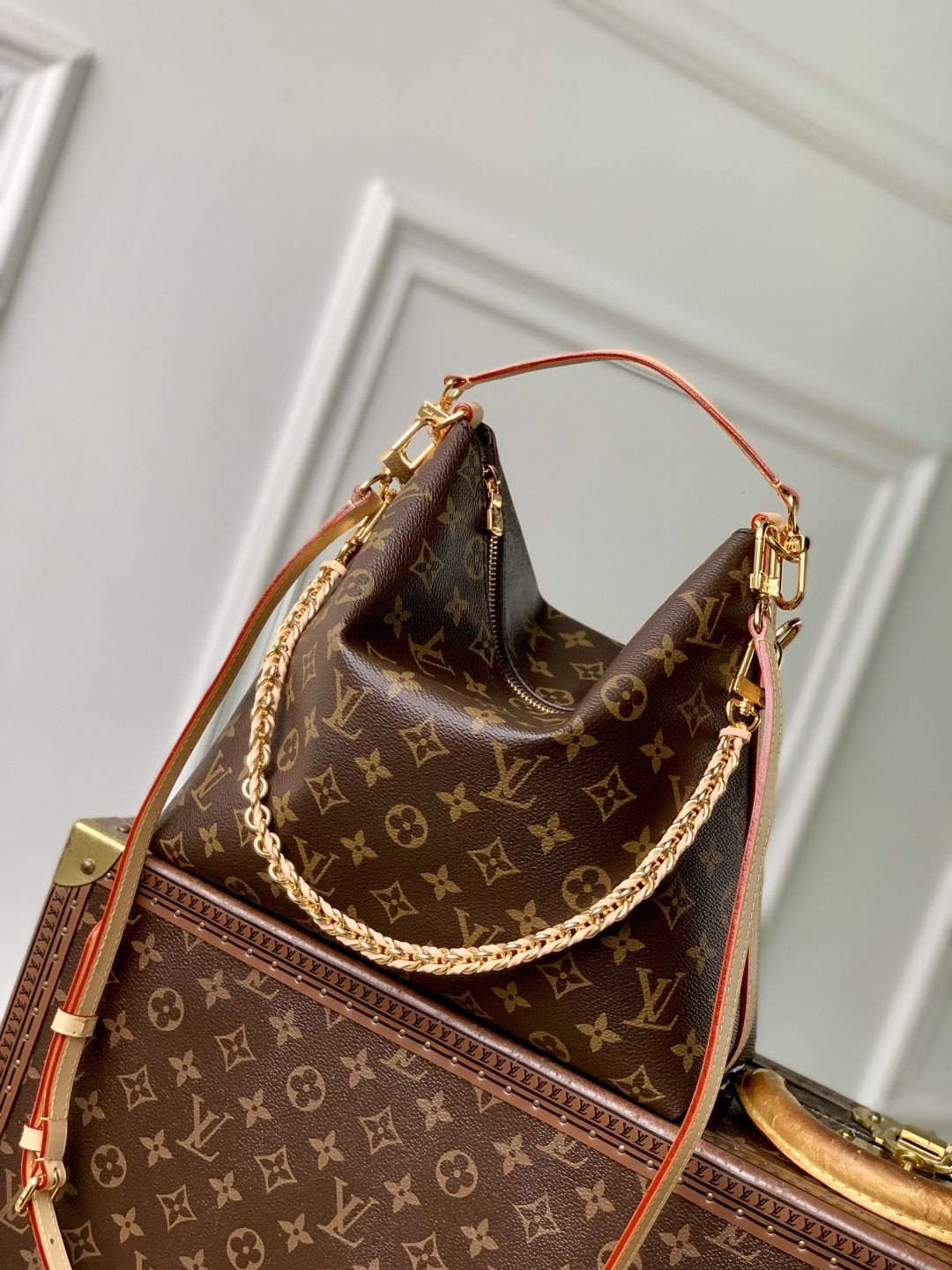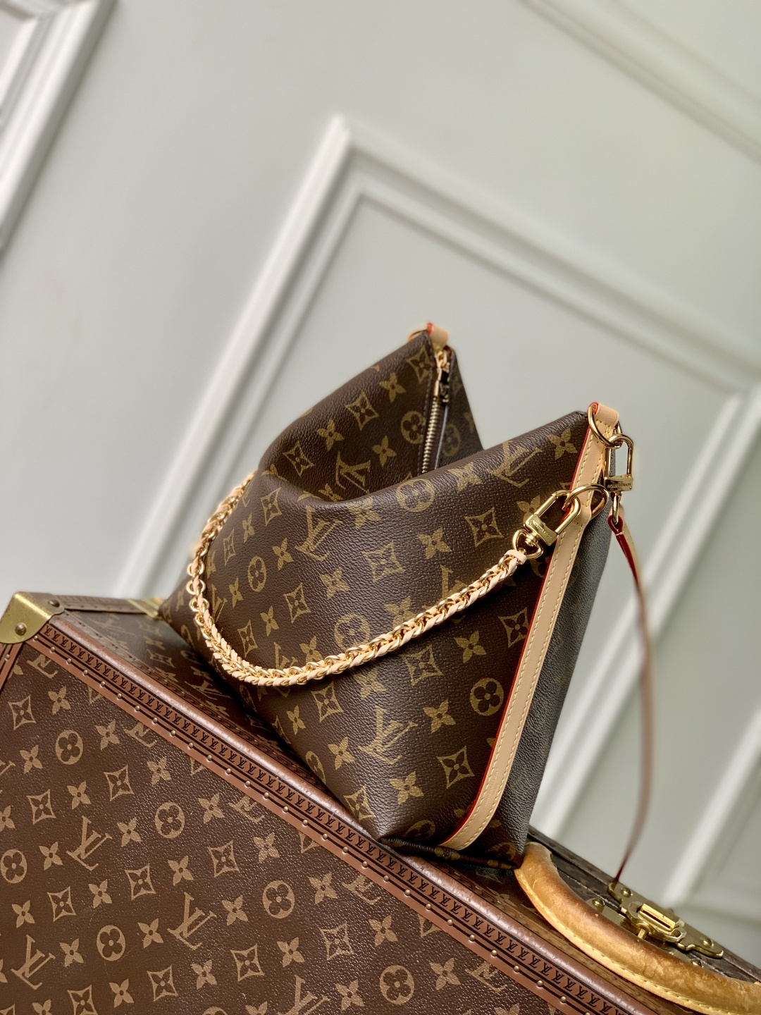 This is a replica LOUIS VUITTON M27825 Multipass Bag. ,30 x 26 x 10 cm ,Monogram coated canvas,Cowhide leather trim,Textile lining,Gold-colour hardware,Fits 11-inch tablet, smartphone, earphones, Clémence Wallet, notebook, sunglasses,Chain: Removable,Chain Drop: 30.0 cm