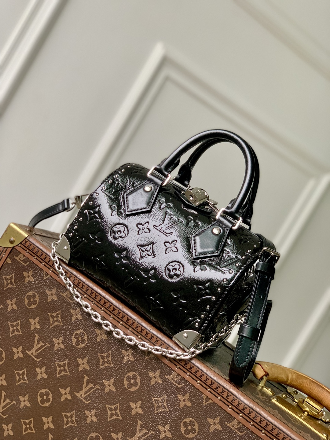 This is a replica LOUIS VUITTON M27921 Speedy Trunk 20. ,20.5 x 13.5 x 11 cm ,Black,Calfskin,Cowhide leather trim,Microfibre lining,Silver-colour hardware,1 padlock,1 inside flat pocket,Strap: Removable, adjustable,Strap Drop: 48.0 cm,Strap Drop Max: 53.0 cm,Chain: Removable,Chain Drop: 13.0 cm,Handle: Single x2