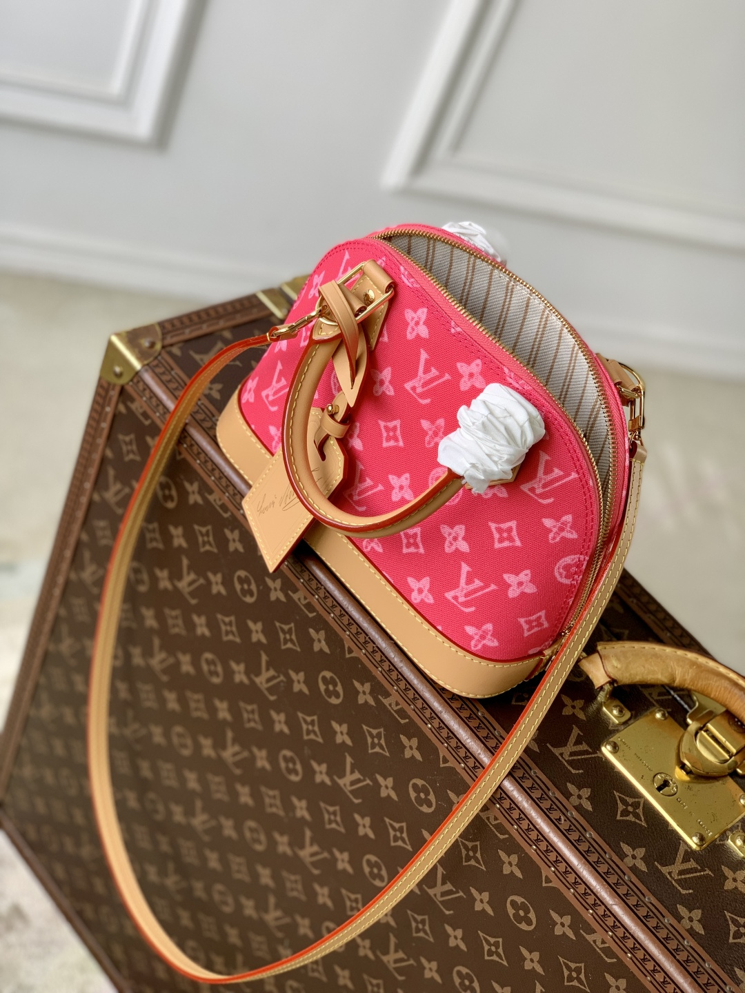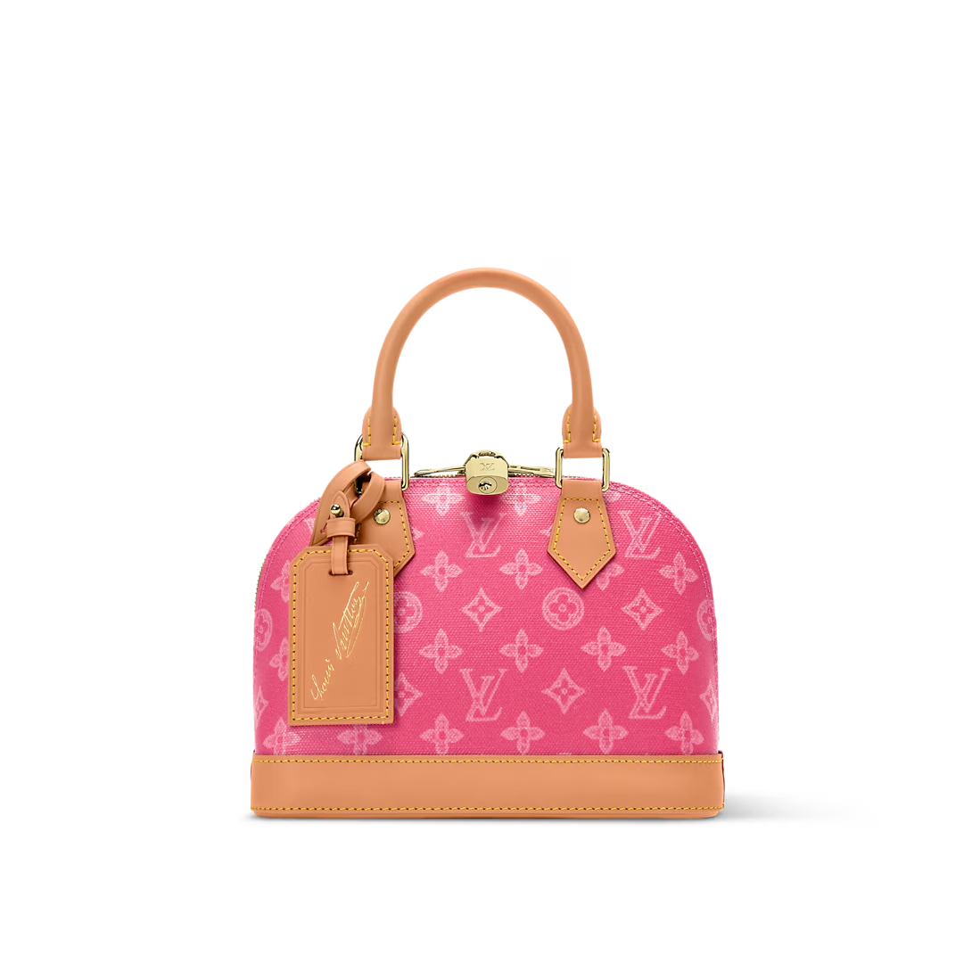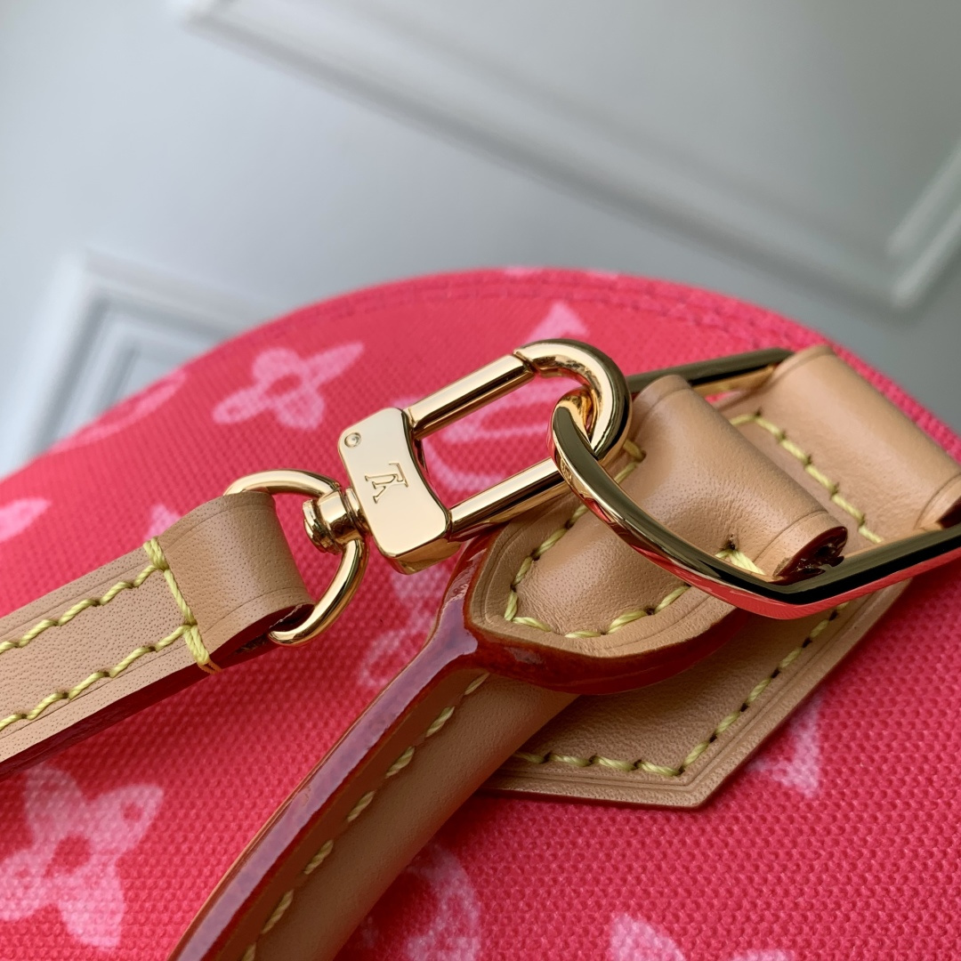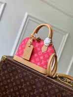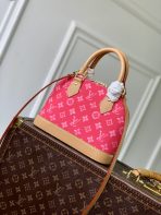This is a replica LOUIS VUITTON M28272 Alma BB. ,23.5 x 17.5 x 11.5 cm ,Monogram Origine Rose Ribbon Pink,Coated canvas,Cowhide leather trim,Striped textile lining,Gold-colour hardware,Double zip and padlock closure,1 removable special anniversary address tag,1 flat inside pocket,1 inside celebratory leather label,4 protective metal base feet,Fits 6.7-inch smartphone, earphones, Zippy Wallet, keys,Strap: Removable, adjustable,Strap Drop: 50.0 cm,Strap Drop Max: 62.0 cm,Handle: Single x2
