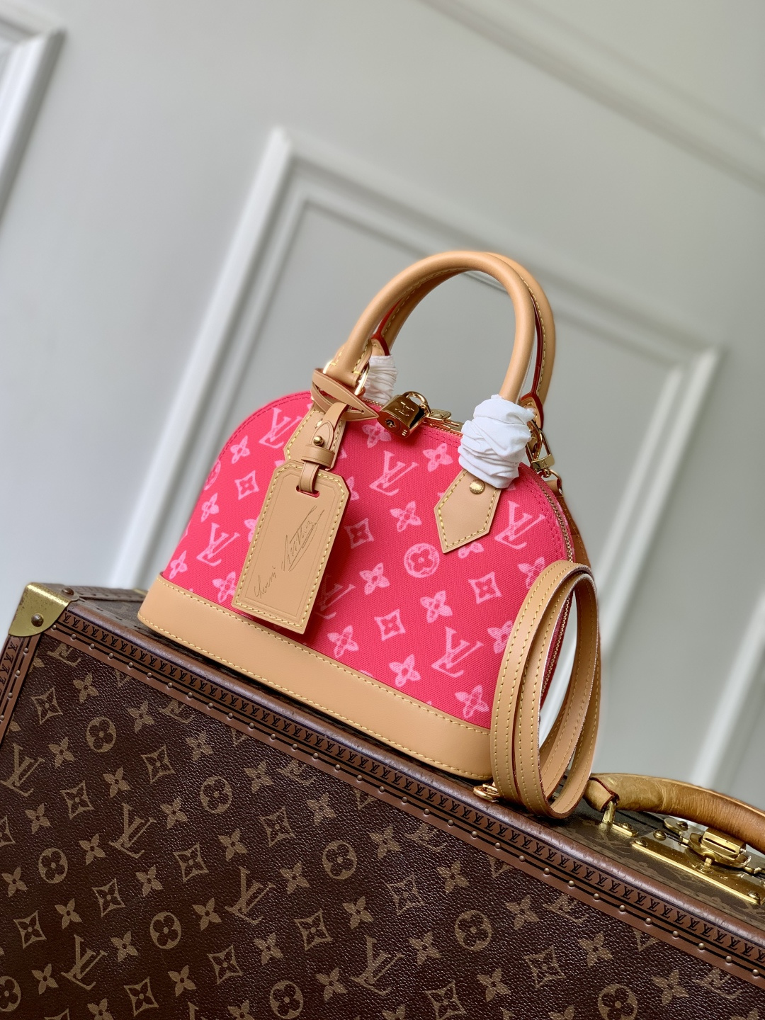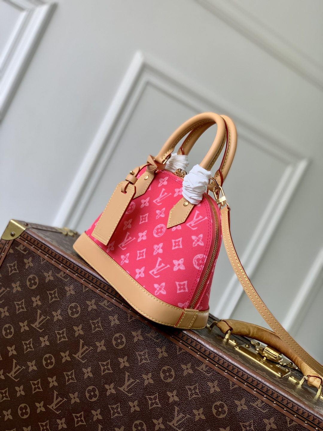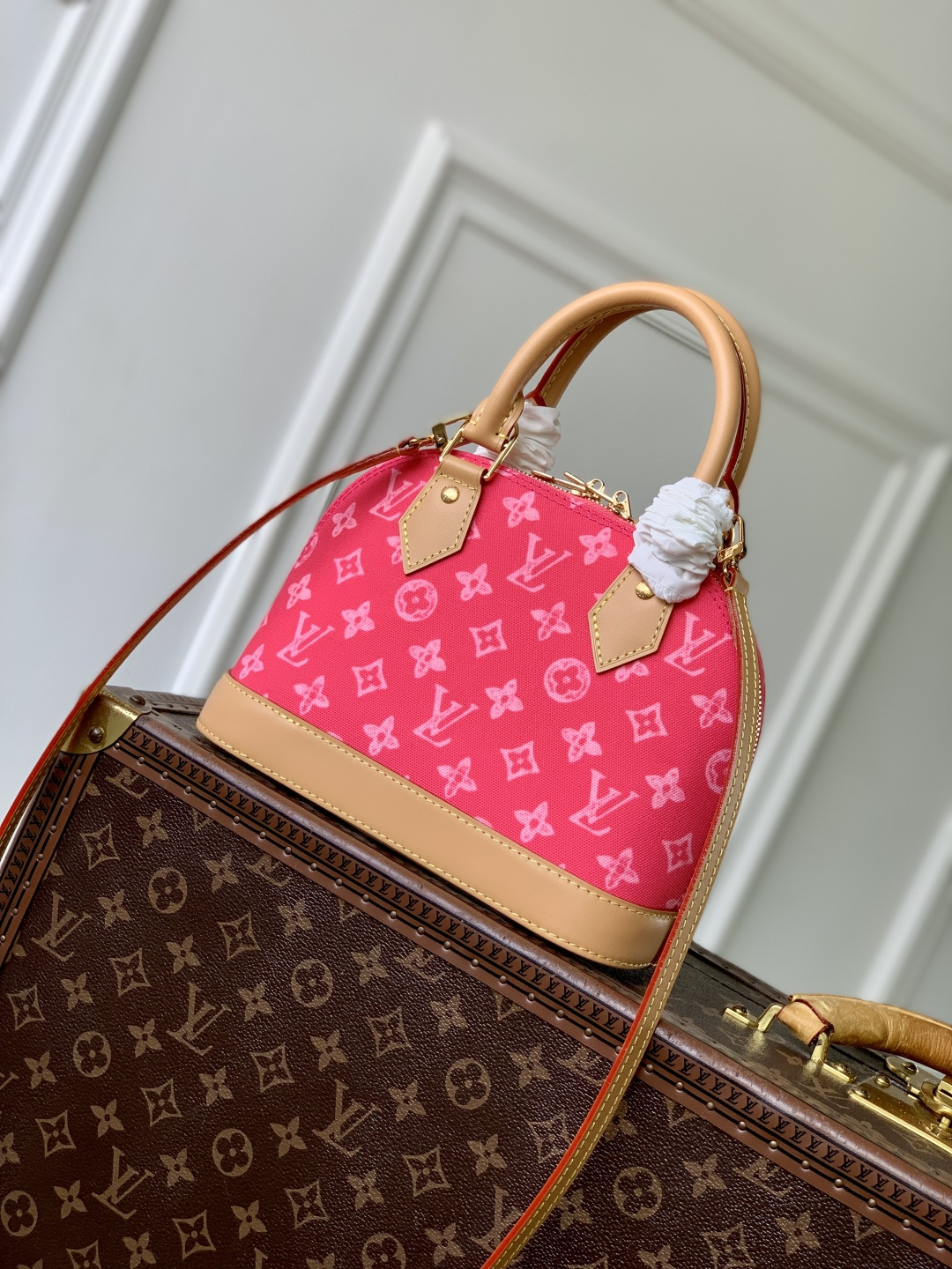 This is a replica LOUIS VUITTON M28272 Alma BB. ,23.5 x 17.5 x 11.5 cm ,Monogram Origine Rose Ribbon Pink,Coated canvas,Cowhide leather trim,Striped textile lining,Gold-colour hardware,Double zip and padlock closure,1 removable special anniversary address tag,1 flat inside pocket,1 inside celebratory leather label,4 protective metal base feet,Fits 6.7-inch smartphone, earphones, Zippy Wallet, keys,Strap: Removable, adjustable,Strap Drop: 50.0 cm,Strap Drop Max: 62.0 cm,Handle: Single x2