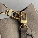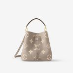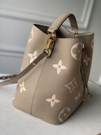This is a replica LOUIS VUITTON M45555 NéoNoé MM. ,10.2 x 10.2 x 6.9 inches ,Tourterelle Gray/Cream,Embossed grained cowhide leather,Grained cowhide-leather trim,Microfiber lining,Gold-color hardware,Zipped central pocket,2 compartments,Metal eyelets,Fits: Smartphone, Victorine wallet, tissue, lipstick, earphones, keys,Weight: 0.9 kg,Strap:Removable, adjustable,Strap drop:12.2 inches,Strap drop max:21.3 inches,Handle:Single, removable