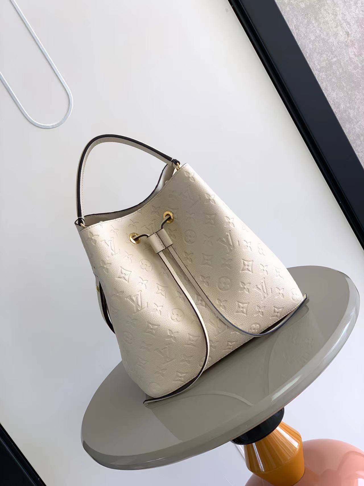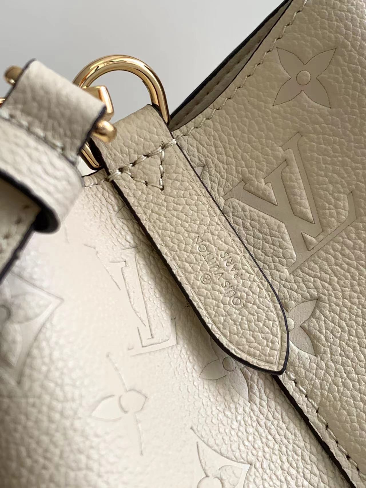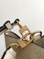 This is a replica LOUIS VUITTON M46526 NéoNoé MM. ,10.2 x 10.2 x 6.9 inches ,Crème Beige,Embossed Monogram Empreinte grained cowhide leather,Cowhide-leather trim,Microfiber lining,Gold-color hardware,2 compartments,Zipped central pocket,Metal eyelets,Fits: smartphone, Victorine Compact Wallet, tissues, lipstick, earphones, keys,Strap:Removable, adjustable,Strap drop:12.2 inches,Strap drop max:21.3 inches,Handle:Single, removable