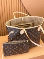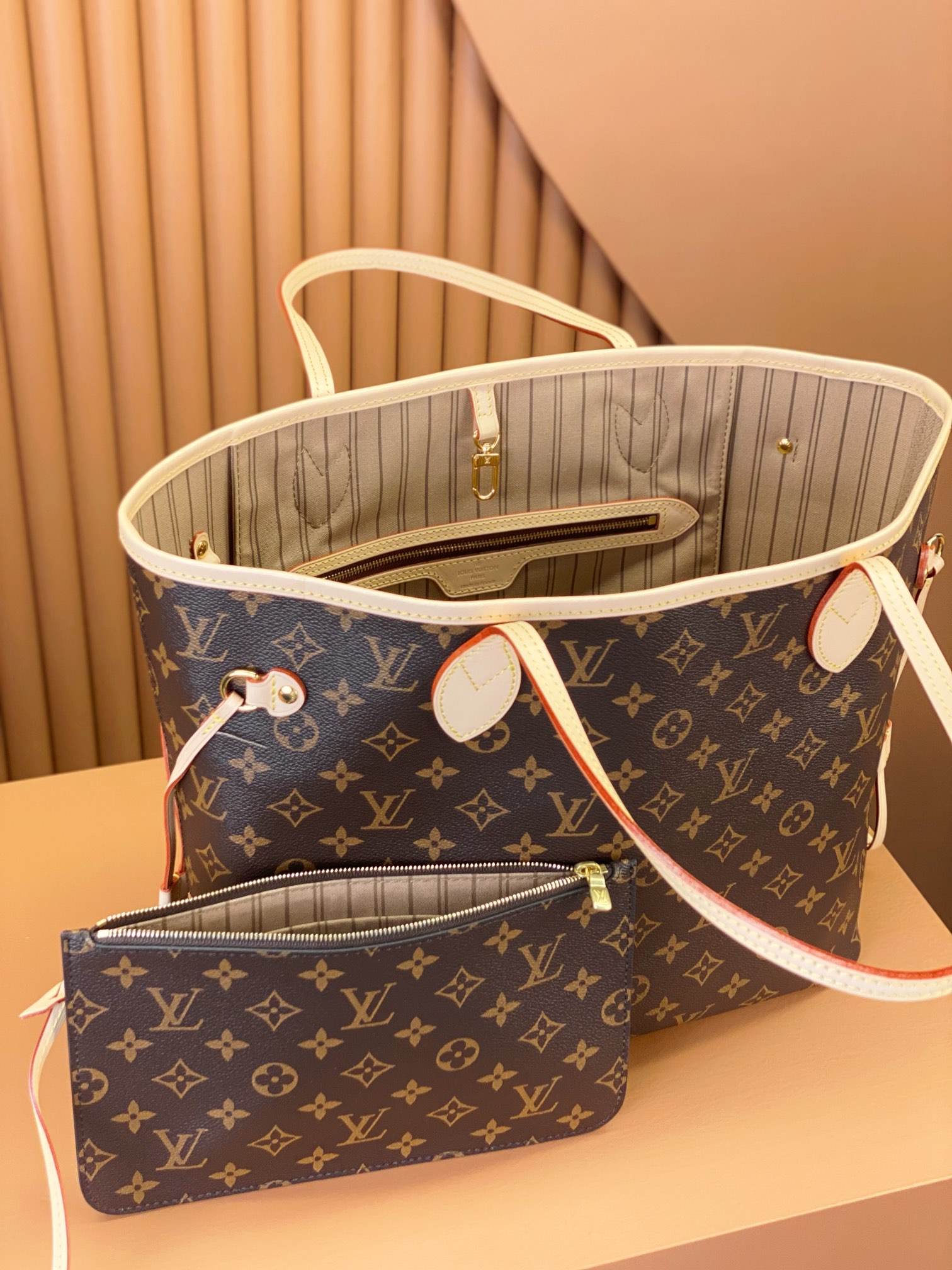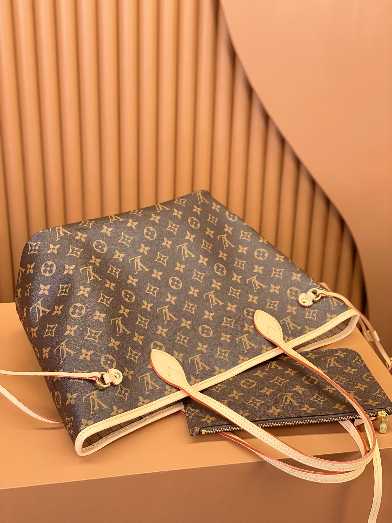 This is a replica LOUIS VUITTON M46975 Neverfull MM. ,12.2 x 11 x 5.5 inches ,Beige,Monogram coated canvas,Natural cowhide-leather trim,Striped textile lining,Gold-color hardware,4 side laces,Hook closure,Flat, textile-lined zipped inside pocket,Removable zipped pouch,D-ring,Fits: 13-inch laptop, Smartphone, keys, Zippy wallet and earphones,Weight: 0.8 kg,,Handle:Double