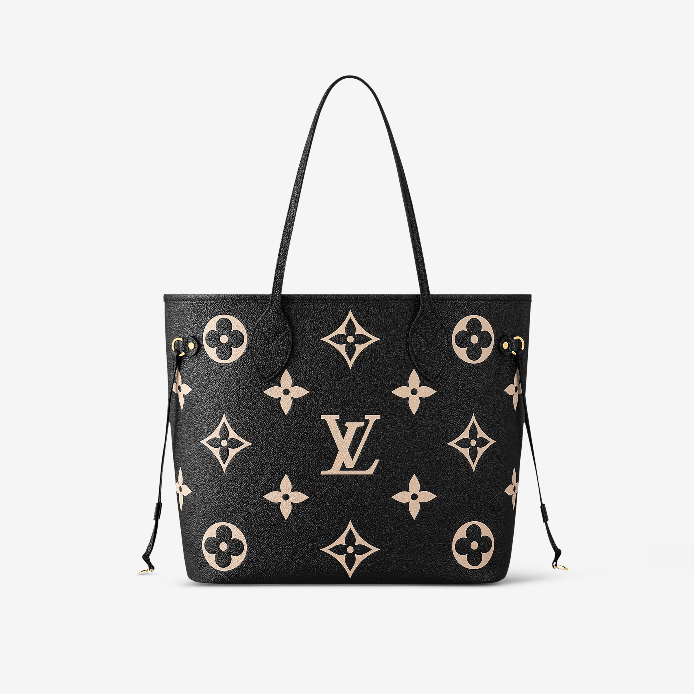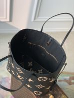 This is a replica LOUIS VUITTON M58907 Neverfull MM. ,12.2 x 11 x 5.5 inches ,Black / Beige,Monogram Empreinte embossed cowhide leather,Grained-cowhide-leather trim,Microfiber lining,Gold-color hardware,Hook closure,Inside removable zipped pocket,4 side laces,Fits: 13-inch laptop, Smartphone, keys, Zippy wallet and earphones,Weight: 1 kg,Handle: Double