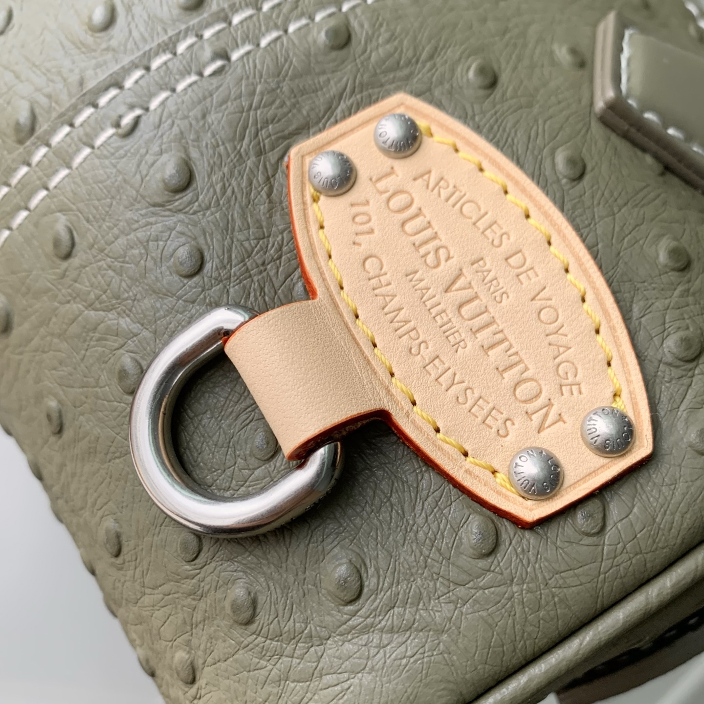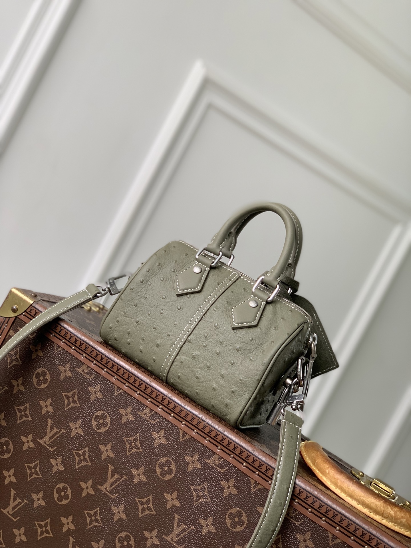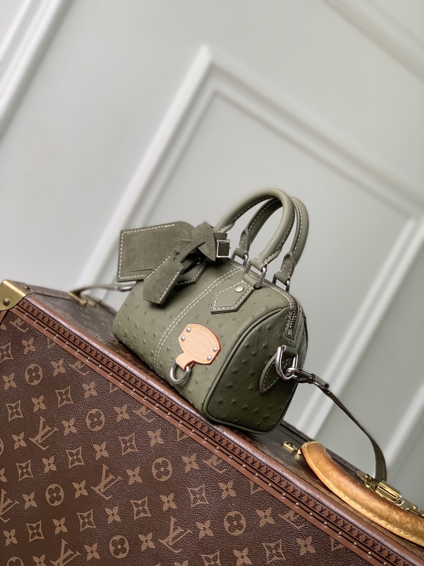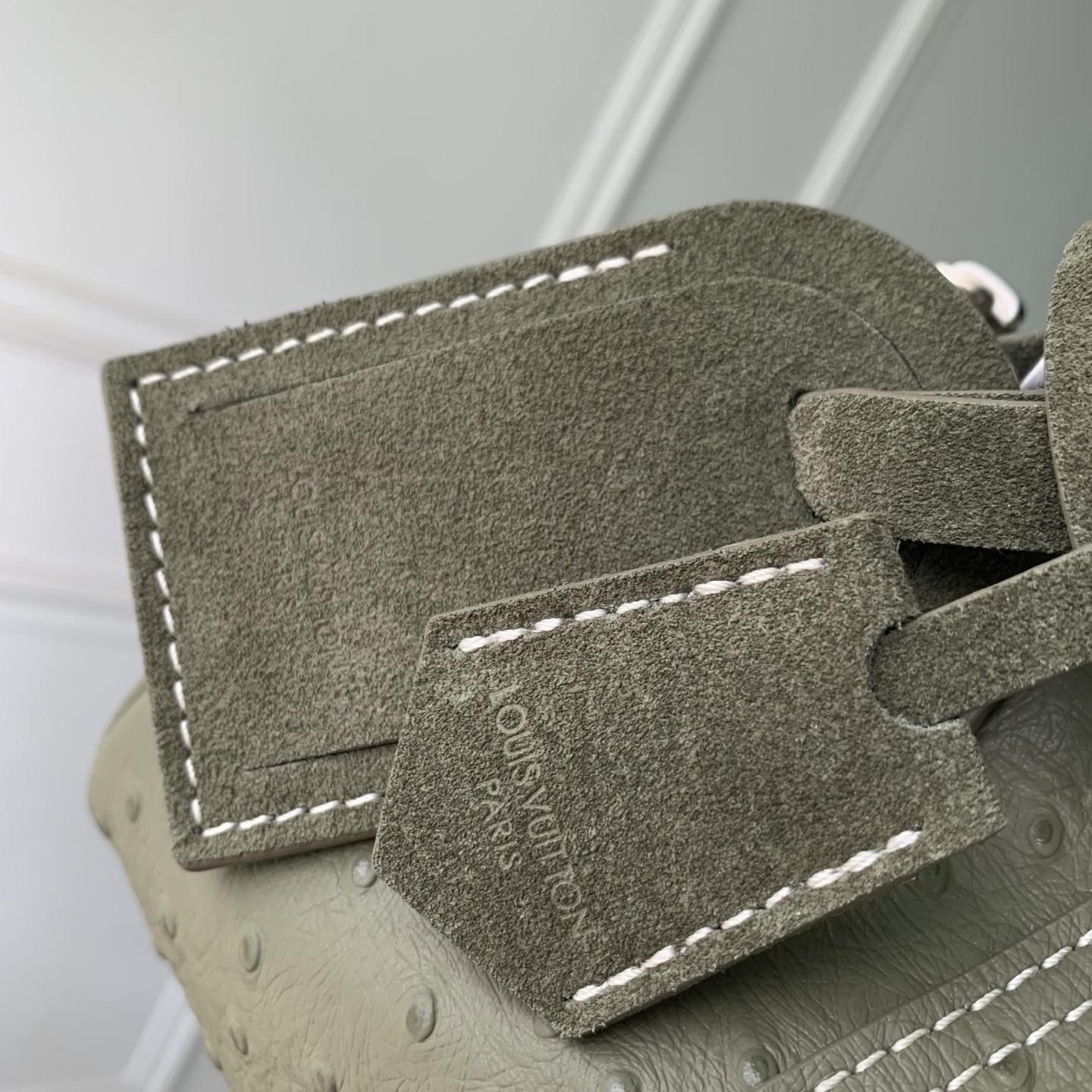 Ostrich leather, calfskin and suede trim