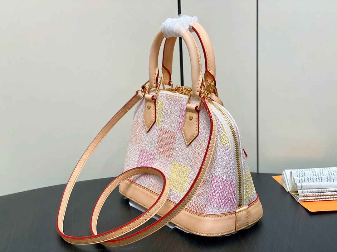 This is a replica LOUIS VUITTON N40516 Alma BB. ,9.3 x 6.9 x 4.5 inches ,Peach,Damier Giant coated canvas,Cowhide-leather trim,Twill lining,Gold-color hardware,Double zip closure,Padlock,Key bell,Inside flat pocket,4 protective metal bottom studs,Fits: 6.7-inches smartphone, earphones, lipstick, tissues, keys, sunglasses,Weight: 0.5 kg,Strap:Removable, adjustable,Strap drop:19.7 inches,Strap drop max:24.4 inches,Handle:Double