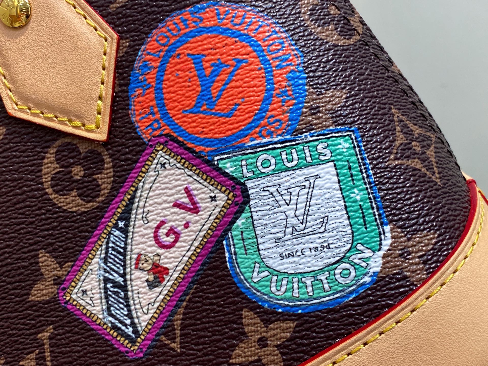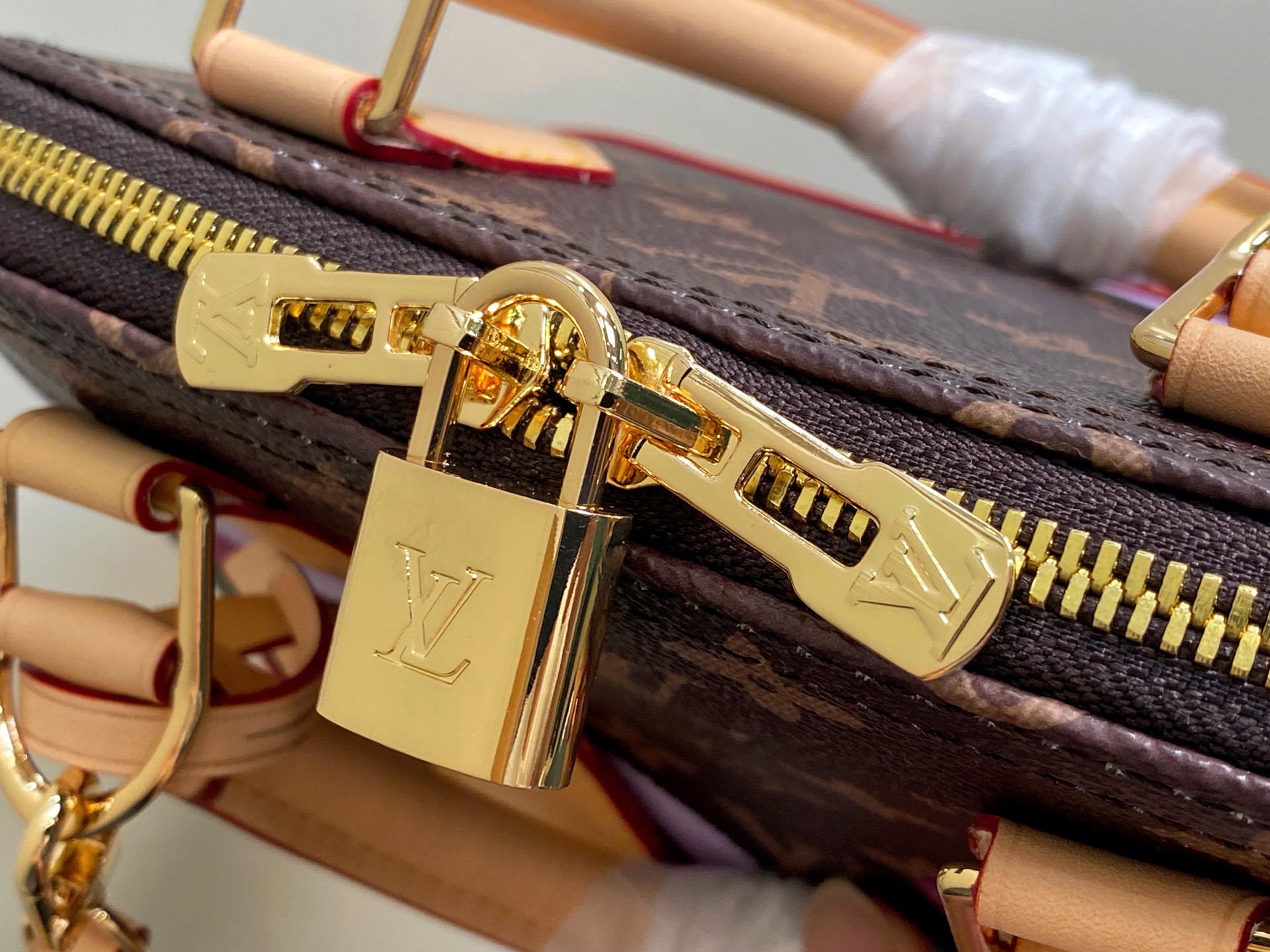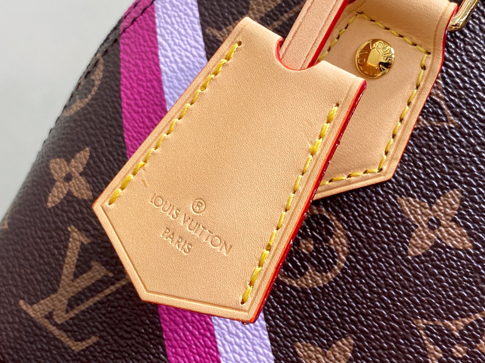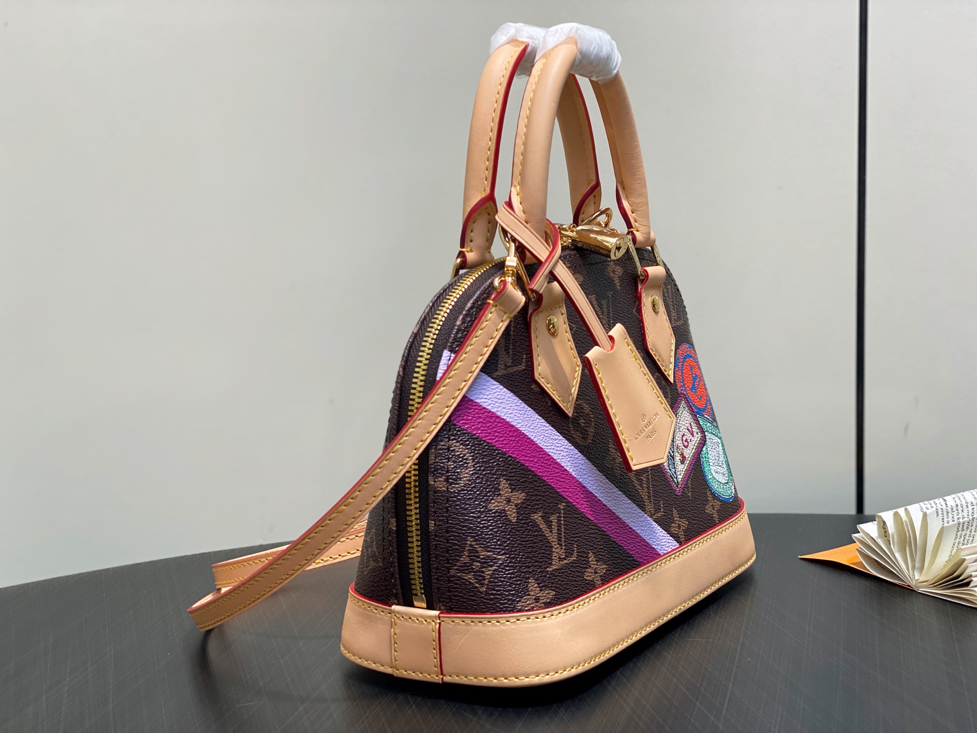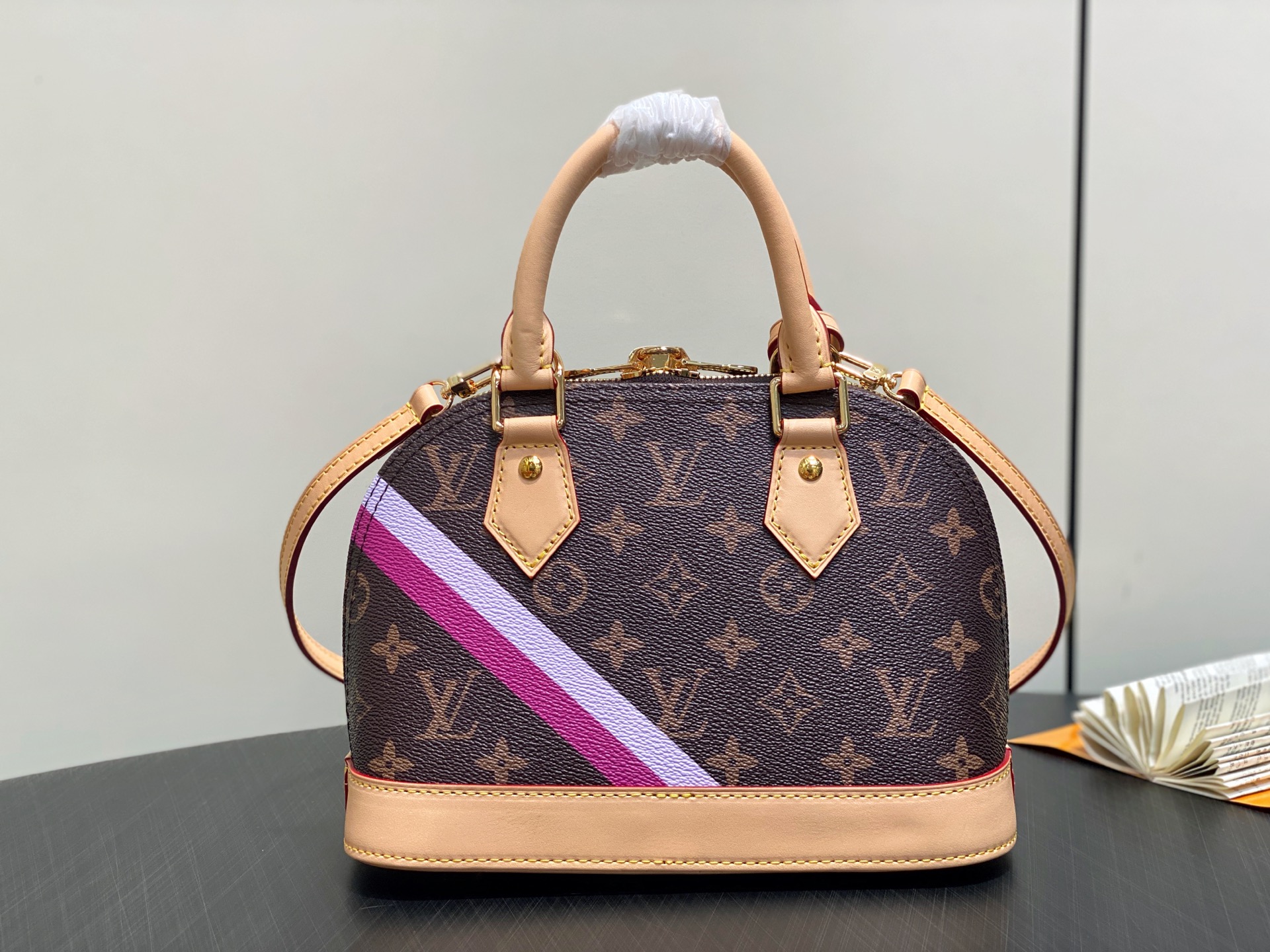 This is a replica LOUIS VUITTON P01917 Mon Monogram Alma BB Bag. ,23.5 x 17.5 x 11.5 cm ,Monogram coated canvas,Cowhide leather trim,Textile lining,Gold-colour hardware,Double zip closure,Padlock,Key bell,Flat inside pocket,4 protective metal bottom studs,Fits 6.7-inch smartphone, earphones, lipstick, tissues, keys, sunglasses,Weight: 0.5 kg,Strap: Removable, non-adjustable,Strap Drop: 56.0 cm,Handle: Single x2