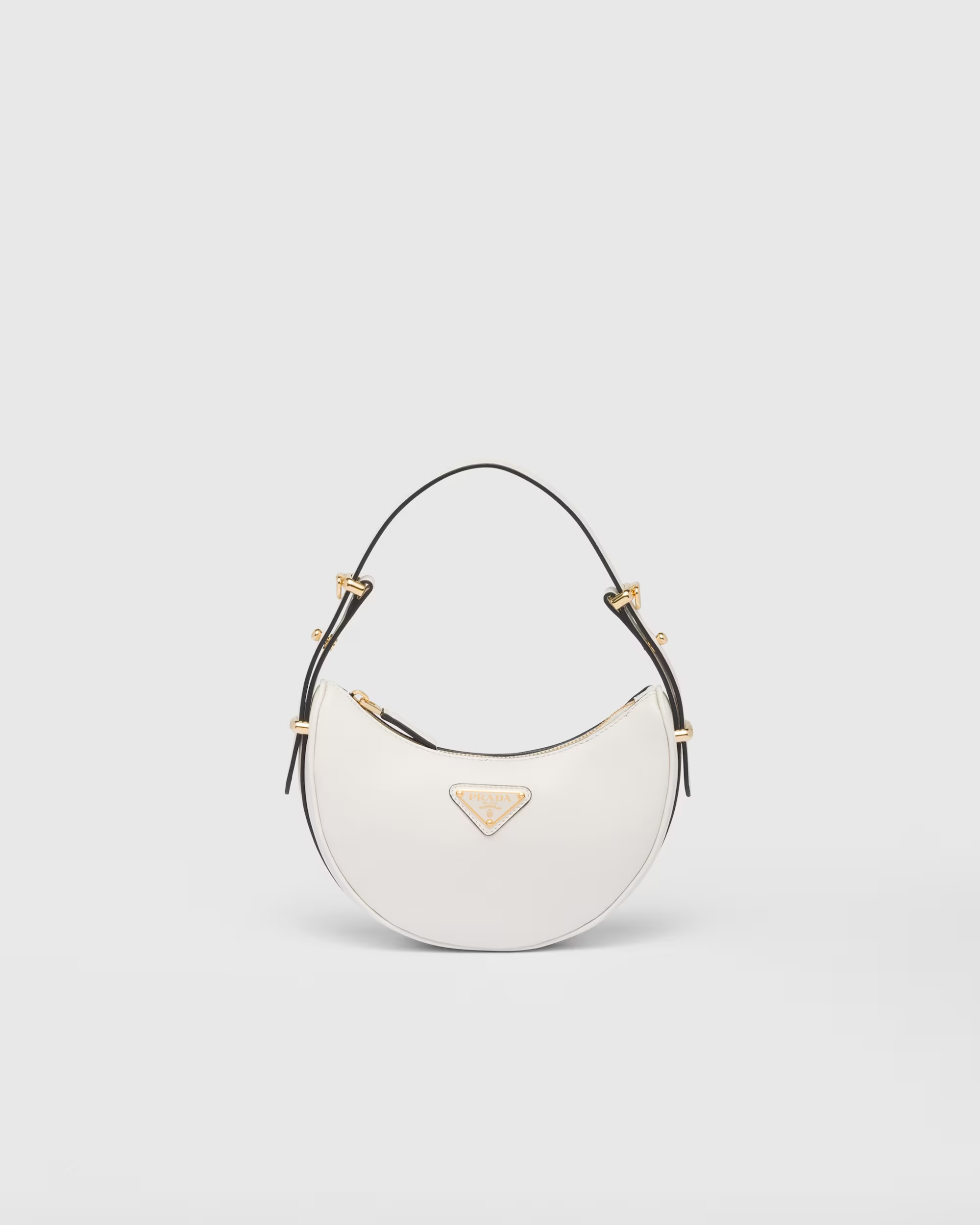 This is a replica Prada 1BC199 Arqué leather mini shoulder bag. ,Detachable, adjustable leather handle,Detachable, adjustable leather shoulder strap Maximum length: 93 cm – Minimum length: 83 cm – Maximum drop length: 60 cm – Minimum drop length: 55 cm,Metal hardware,Enameled metal triangle logo on the front,Zipper closure,Nappa leather lining with patch pocket,Height: 16cm,Width: 18cm,Length: 5cm